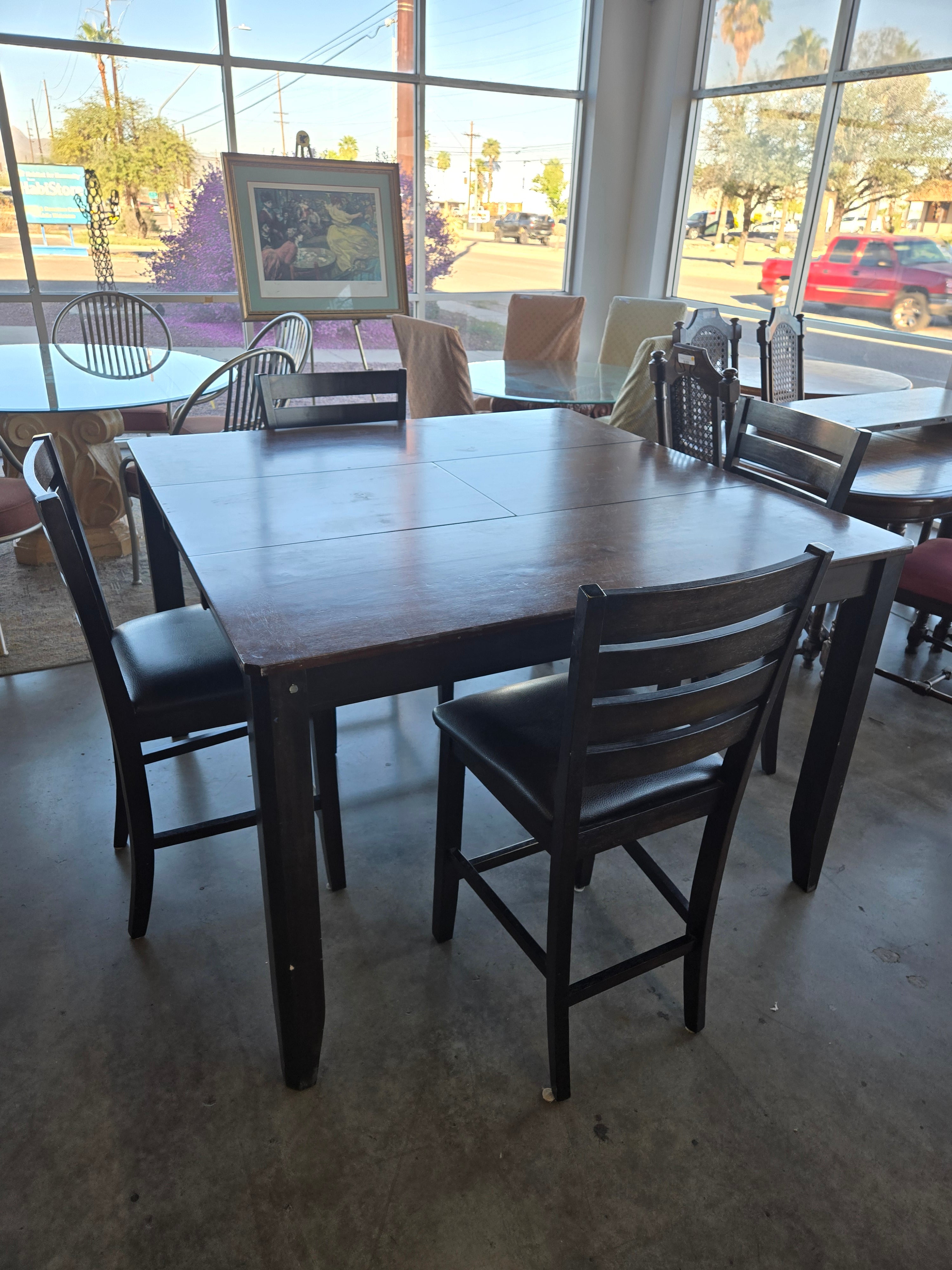 This elegant dining set features a sturdy dark wood table with a smooth finish and a set of matching chairs upholstered with black leather. The sleek design makes it an ideal addition to any dining room. Approximate Size: 3 x 5 x 3