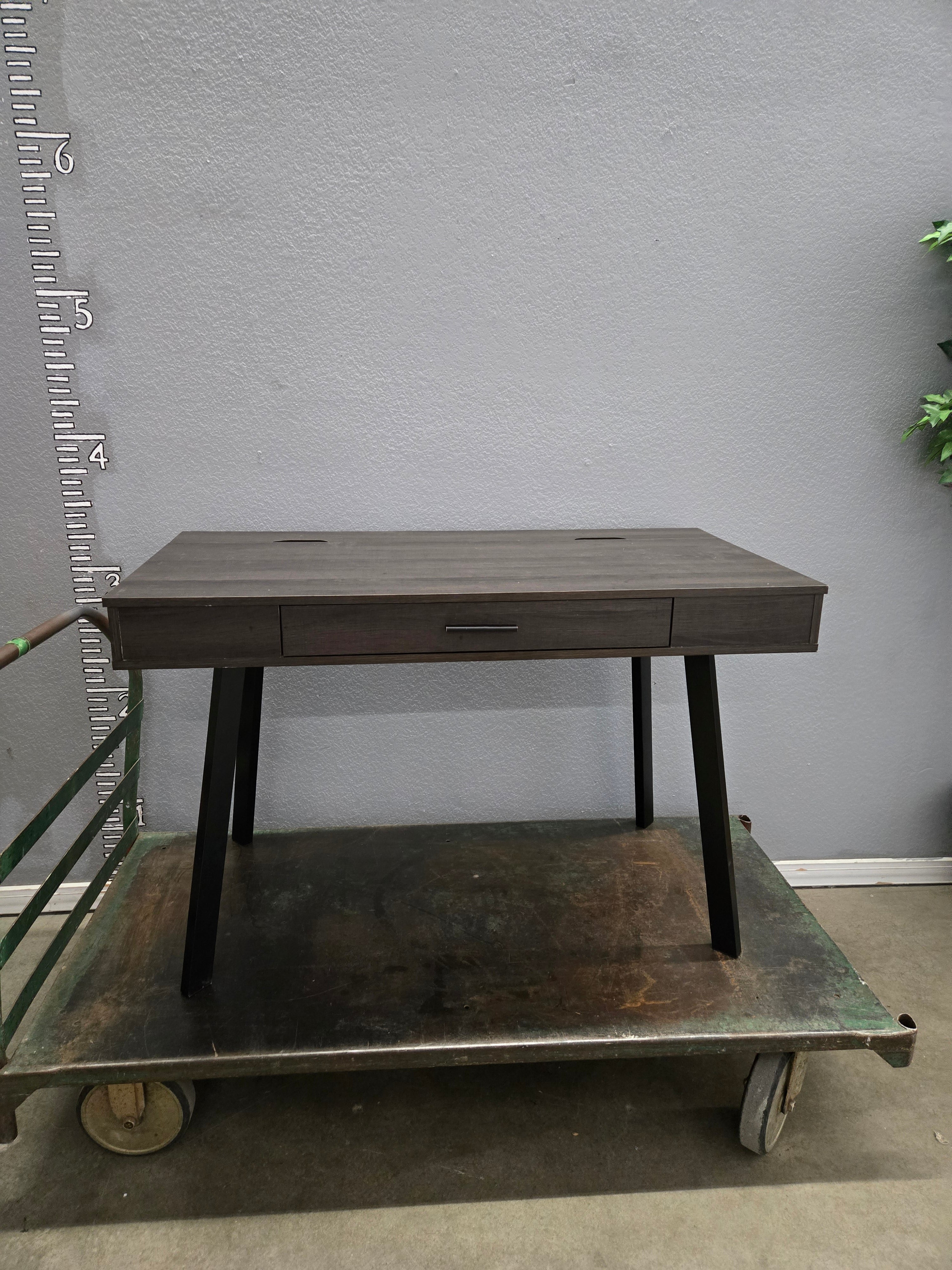 This sleek writing desk features a charcoal gray finish and a smooth wooden texture. Ideal for any modern office or study space, it includes a convenient central drawer for storage. Approximate Size: 3 x 4 x 2
