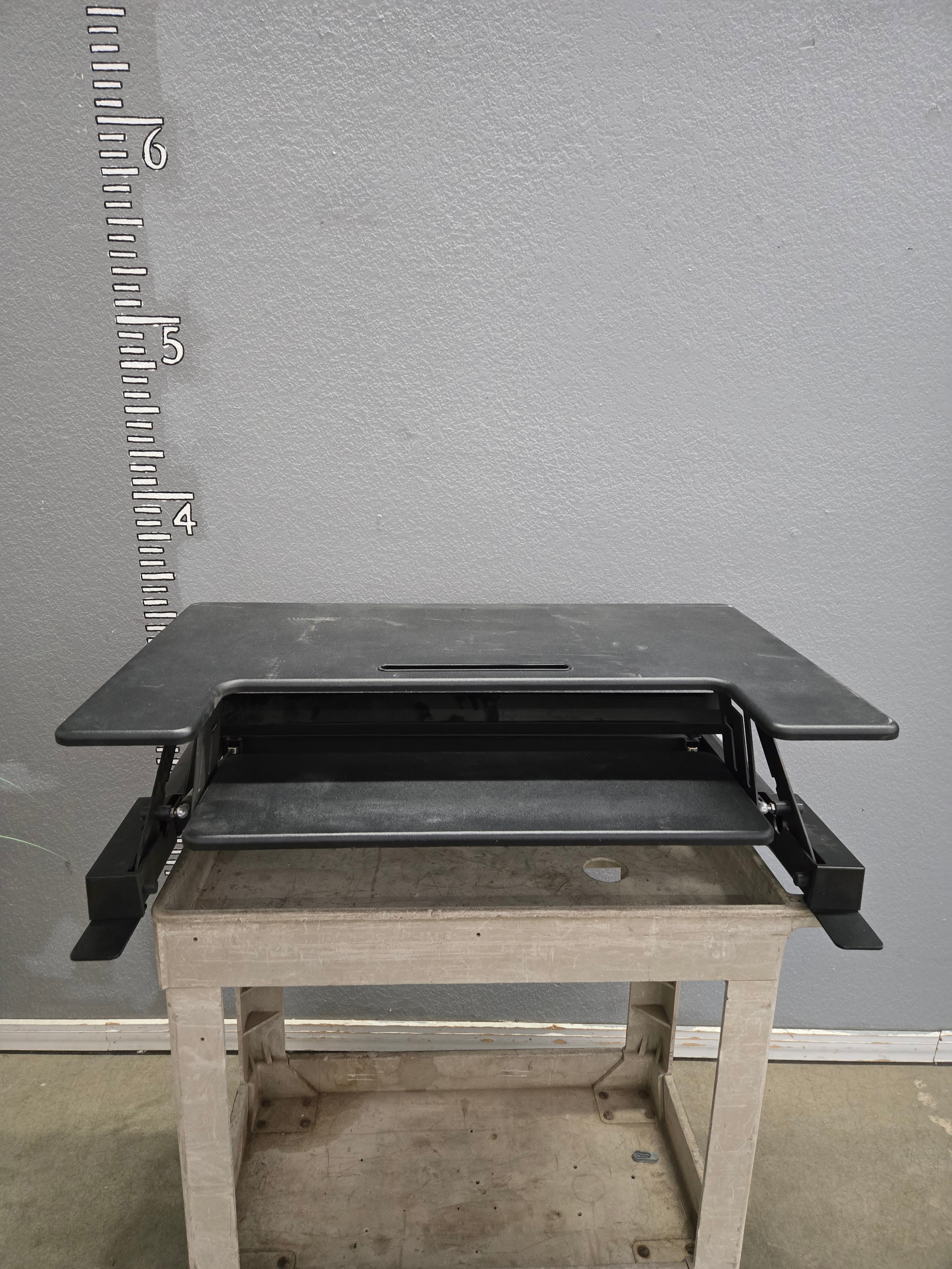 This adjustable standing desk converter features a sleek black finish with a durable surface designed to support your workstation needs. Its versatile design allows easy height adjustments to promote healthier posture and reduce strain. Approximate Size: 6 x 3 x 2