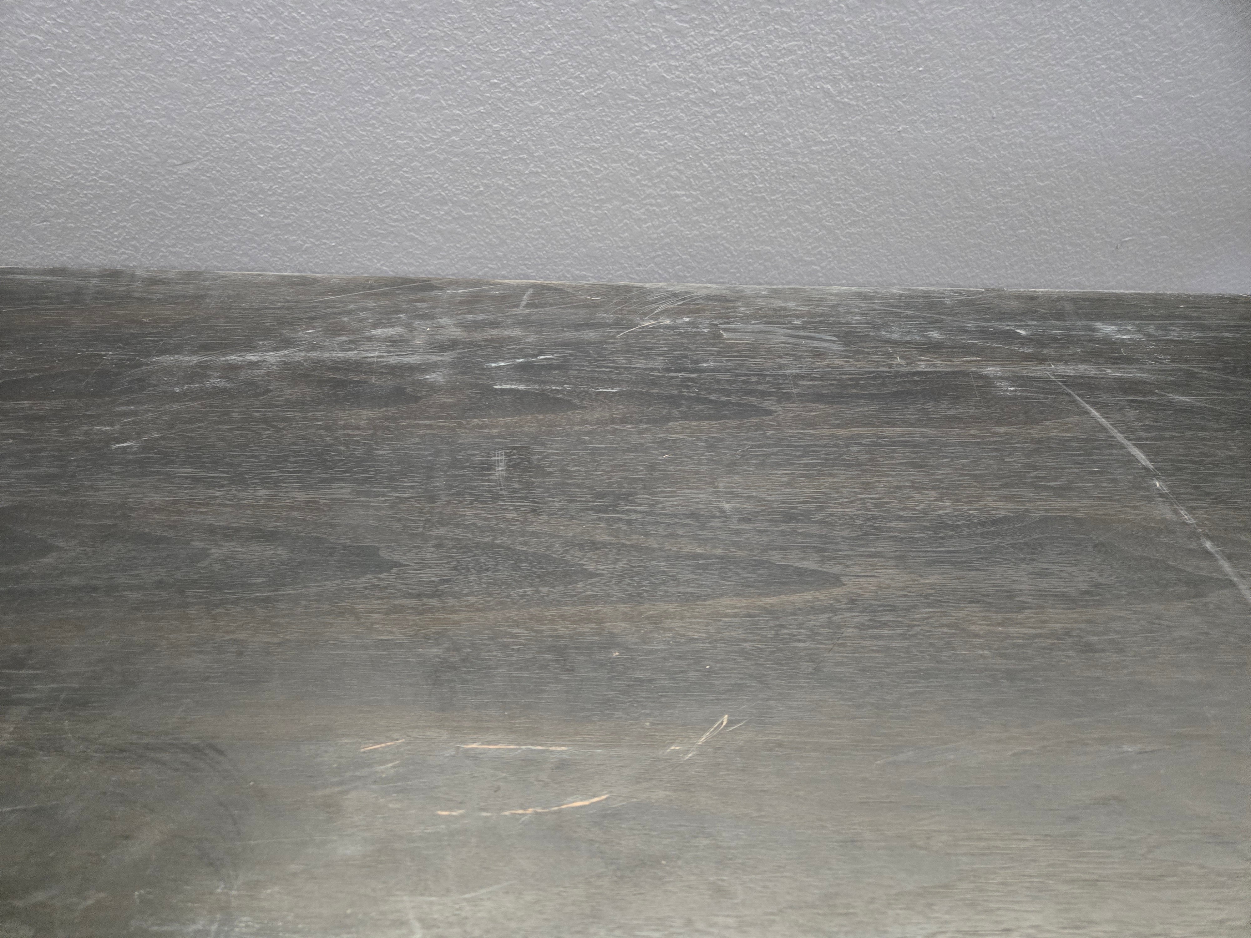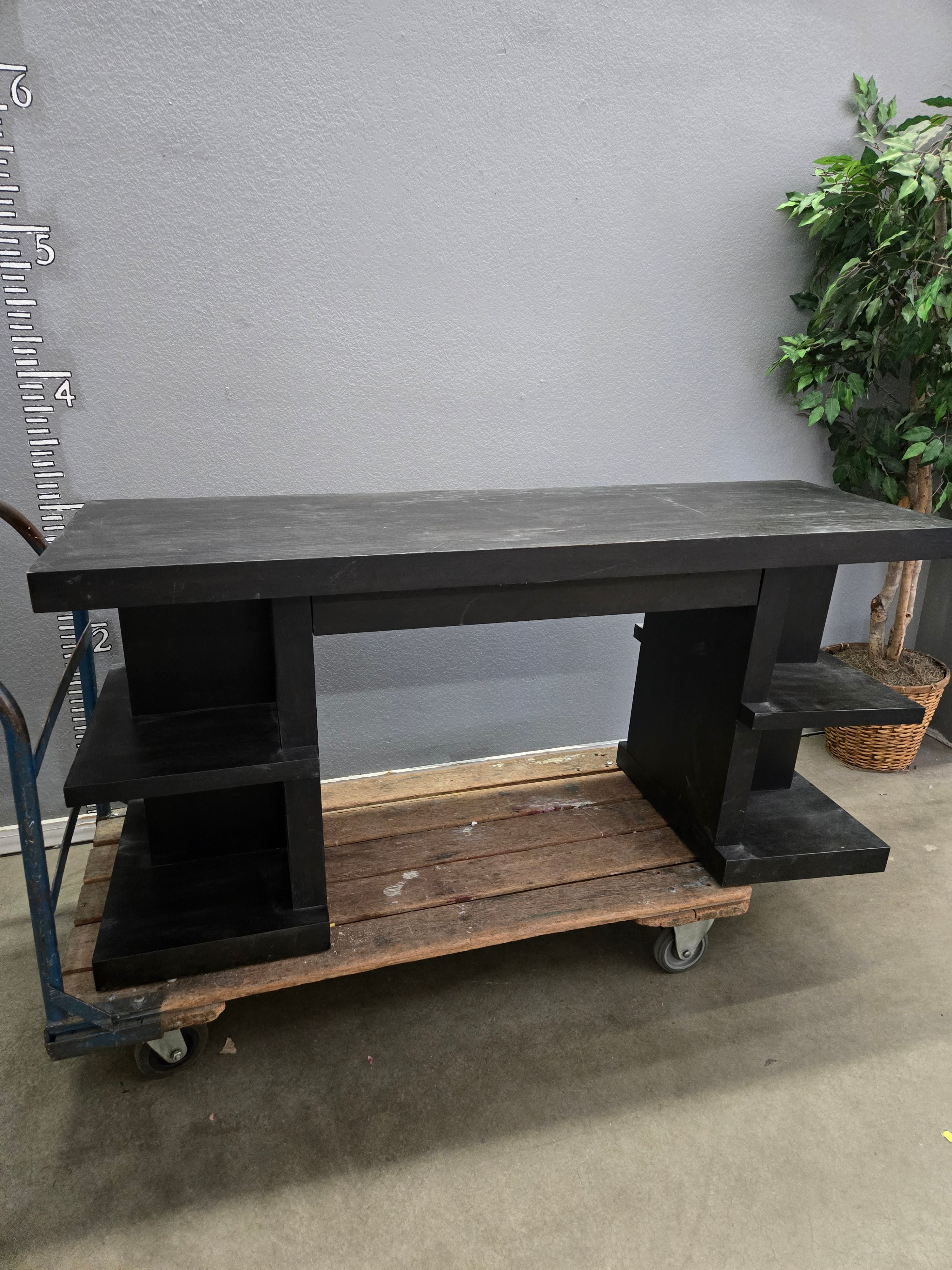 This sleek black console table features a matte finish and is crafted from sturdy wood. Its modern design offers multiple shelves for storage and display. Approximate Size: 2.5 x 5.5 x 1.5