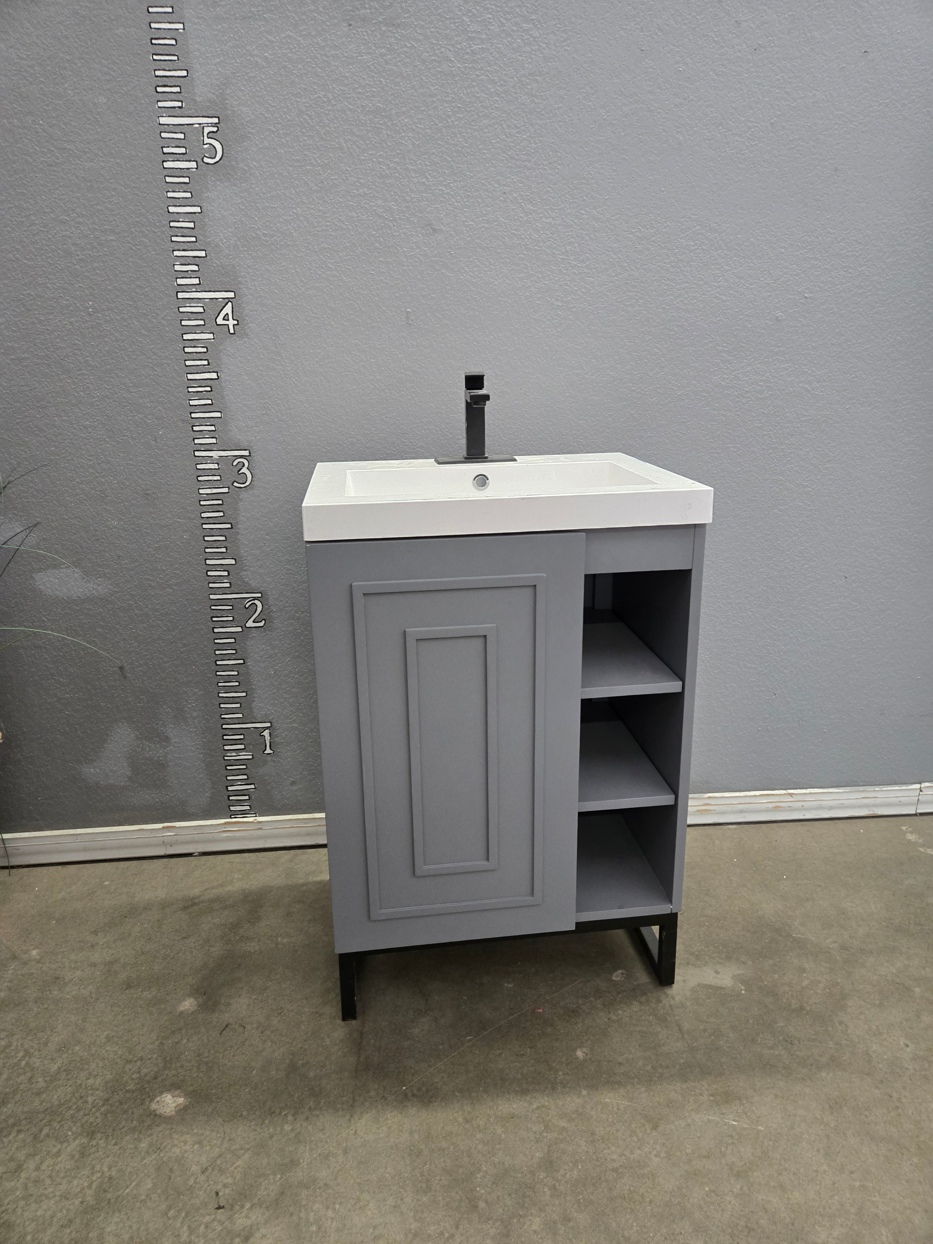 This sleek and modern bathroom vanity features a sophisticated gray finish with a smooth matte texture. It includes a built-in sink and ample storage space with a cabinet and open shelving. Approximate Size: 3 x 2 x 1.5