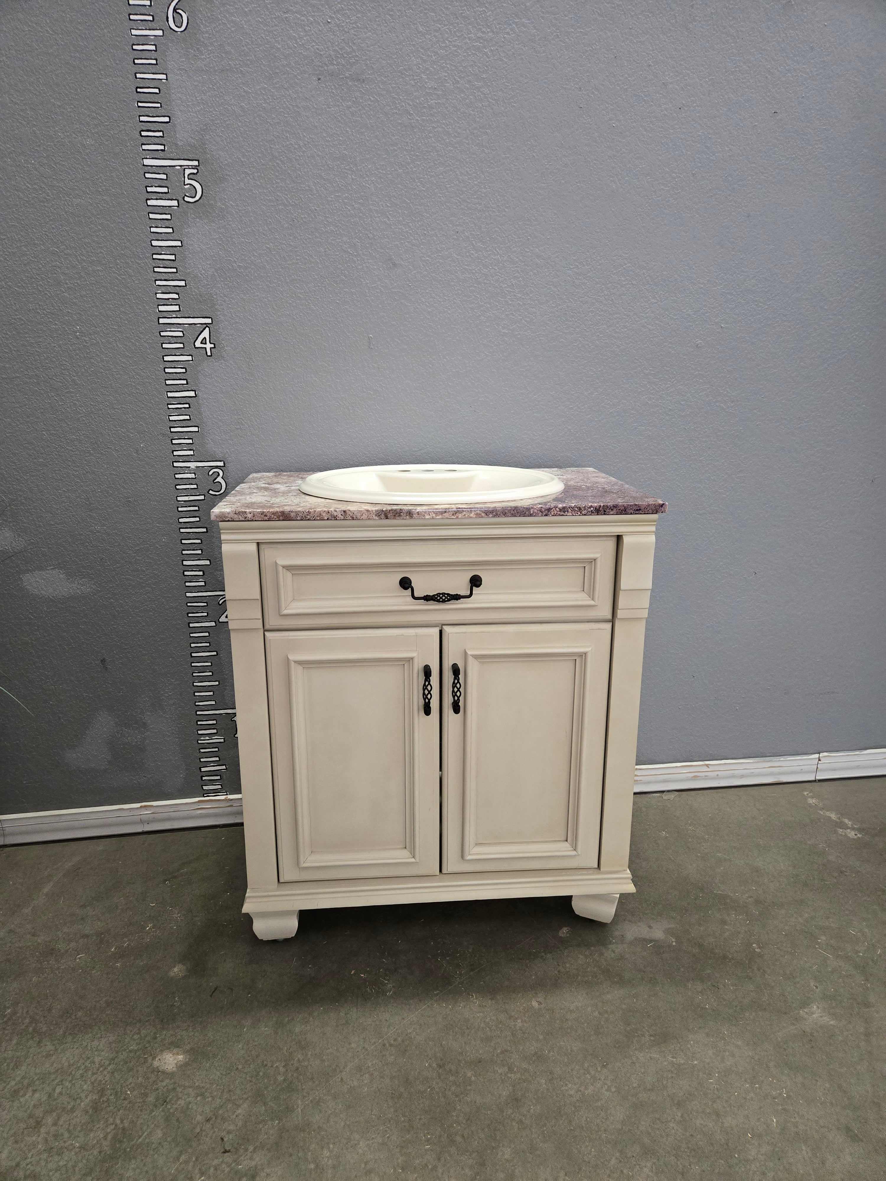 This elegant bathroom vanity features a cream-colored finish with a smooth marble top, providing a timeless and sophisticated look. The unit includes a built-in ceramic sink and two cabinet doors with ornate metal handles, offering ample storage space. Approximate Size: 3 x 2.5 x 1.5