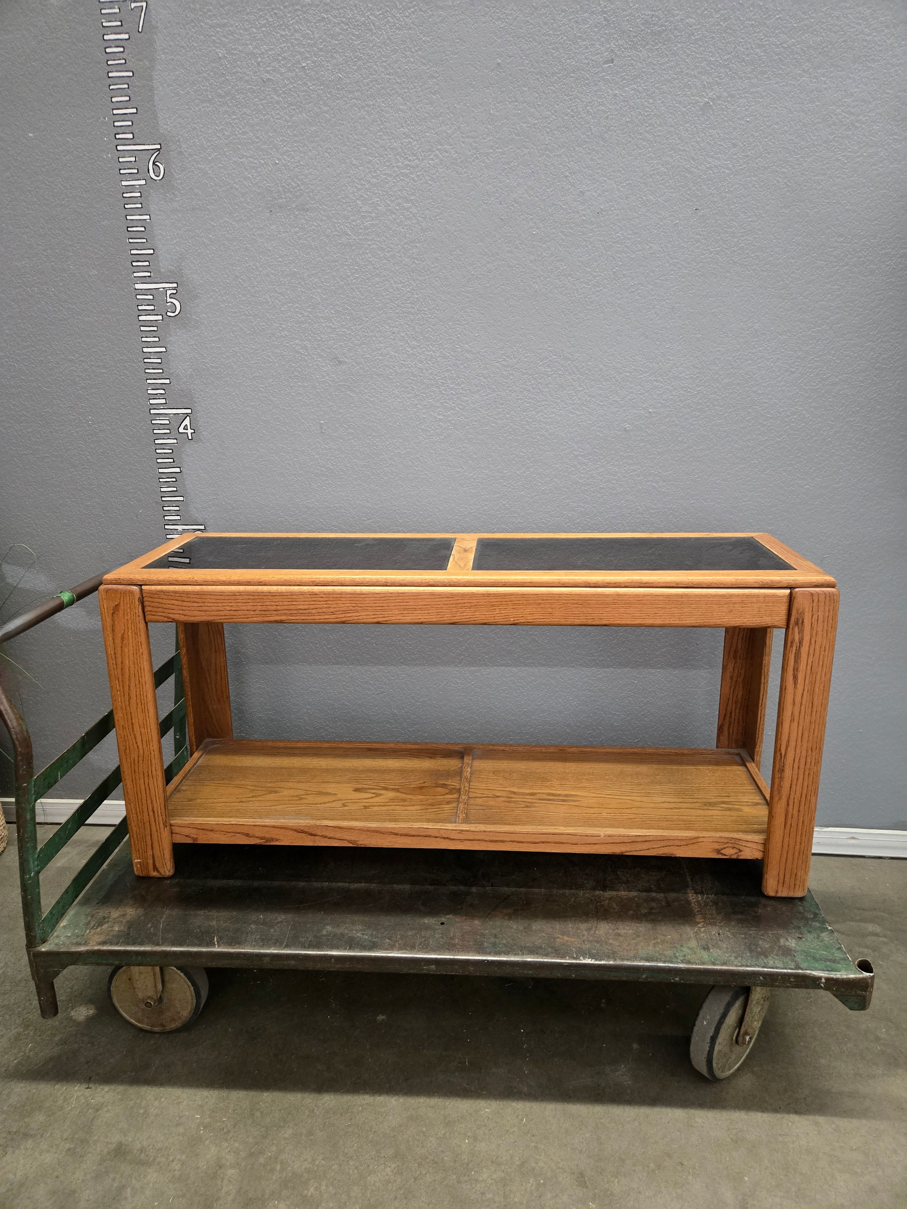 This elegant console table features a solid oak frame with a smooth, natural wood finish. The top is inset with glass panels, offering a sleek and refined look, perfect for any living space. Approximate Size: 2.5 x 3.5 x 1.5