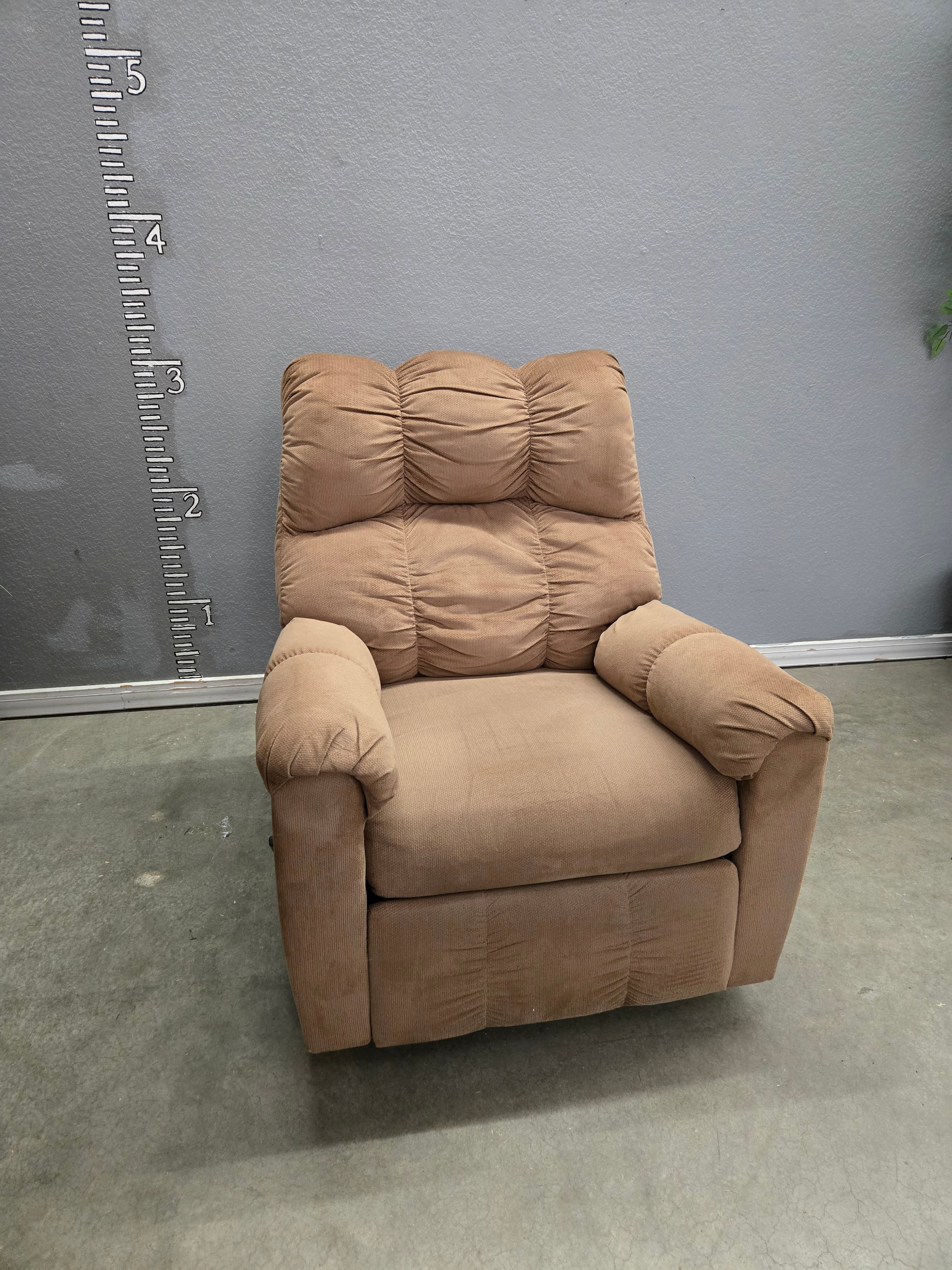 This plush recliner chair features a soft tan fabric with a matte finish. It offers superior comfort with its cushioned armrests and back, perfect for relaxing in any home setting. Approximate Size: 3 x 2.5 x 2.5