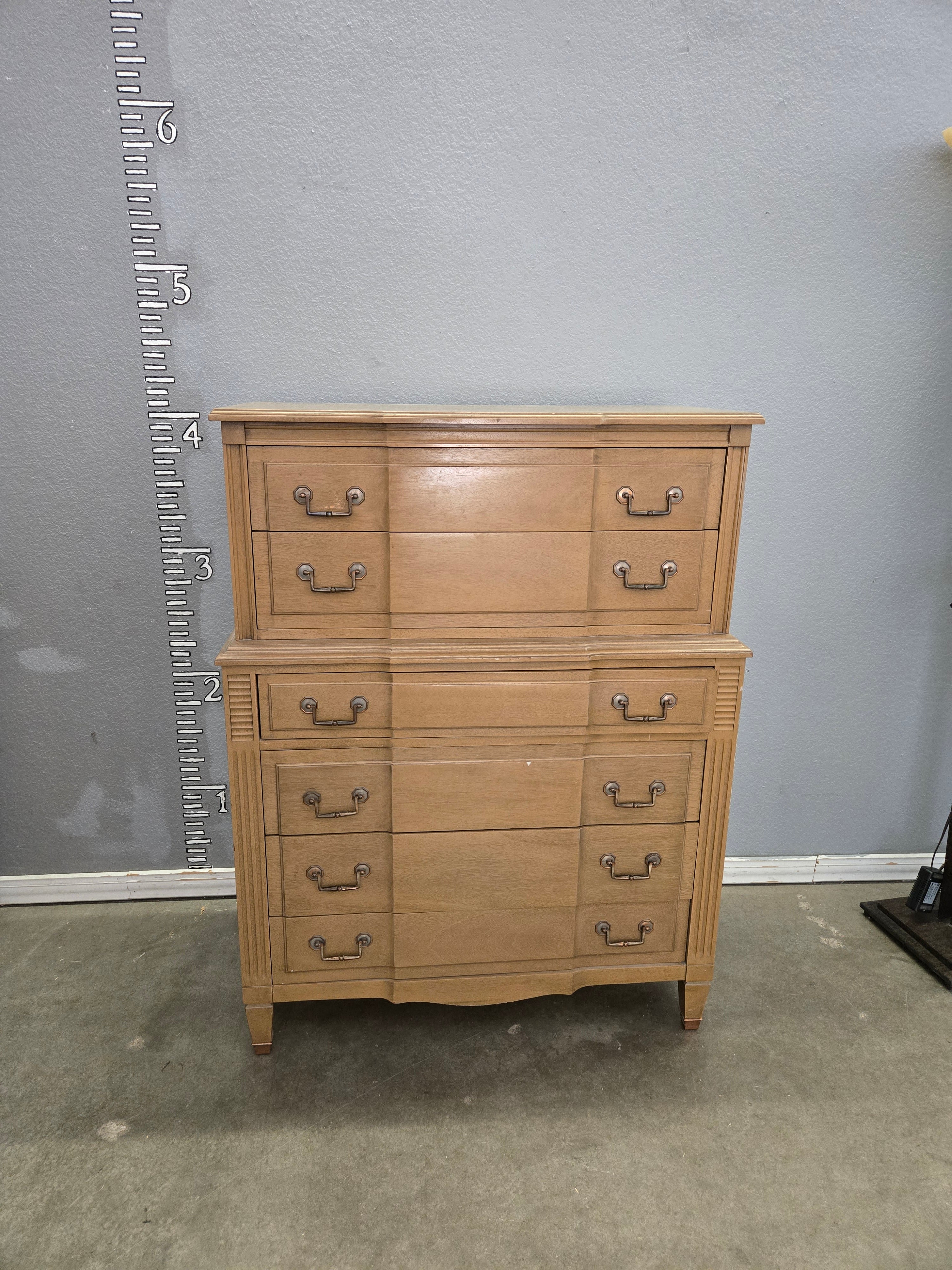 A classic vintage tallboy dresser made from solid wood with a light brown finish. Features six spacious drawers with metal handles, perfect for adding a touch of elegance and functionality to any bedroom. Approximate Size: 5 x 3 x 1.5