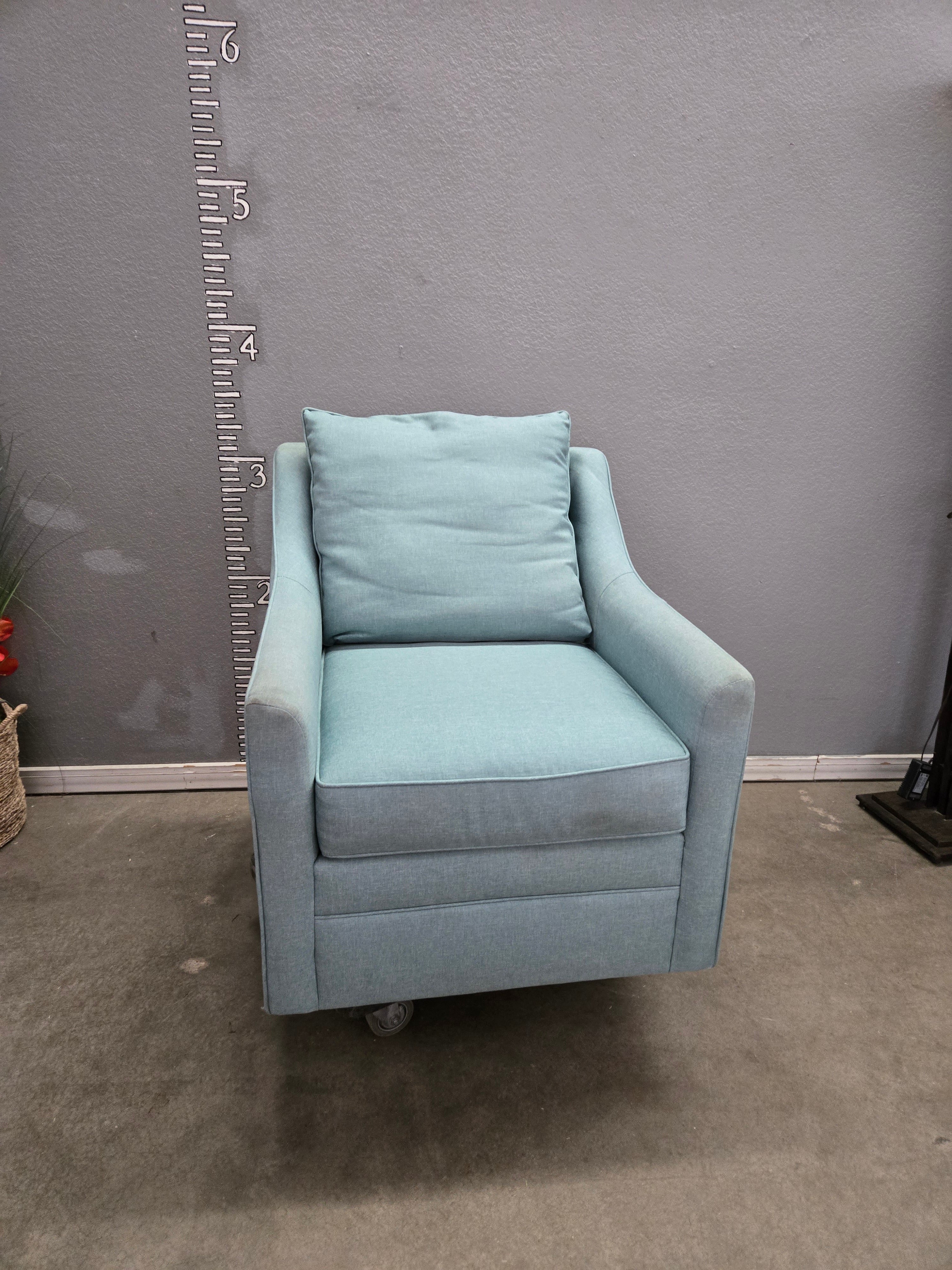 This stylish armchair features a soft blue fabric with a smooth finish, providing both comfort and a modern aesthetic. Approximate Size: 3 x 2.5 x 2