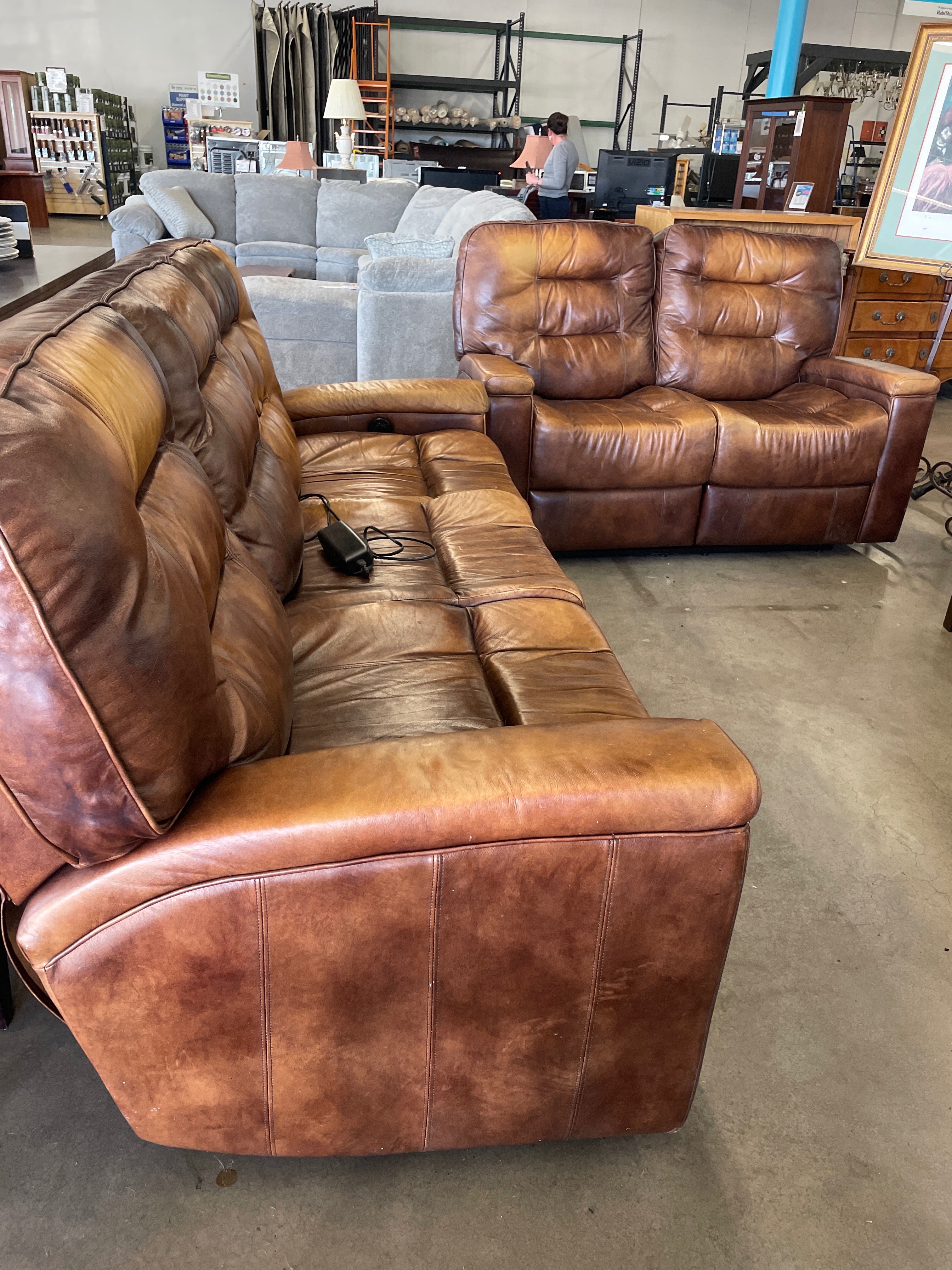 This vintage sofa set features a rich brown leather finish that adds a touch of classic elegance to any living space. The plush, cushioned design ensures comfort while the reclining feature offers relaxation at its finest. Approximate Size: 3 x 6 x 3