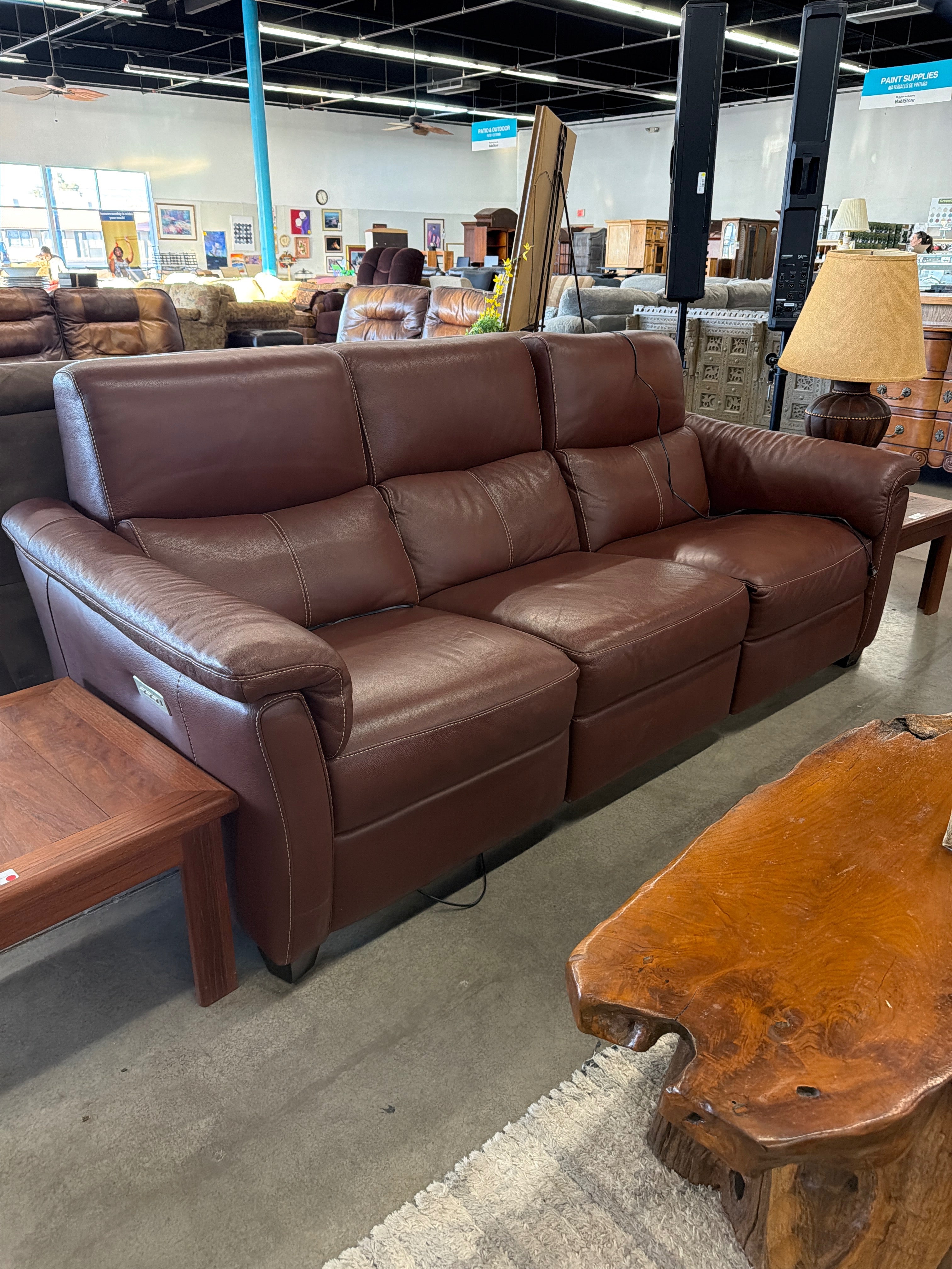 This elegant sofa features a rich, dark brown leather upholstery with a smooth finish, providing both luxury and comfort. It is designed with a reclining function for extra relaxation. Approximate Size: 3 x 7 x 3