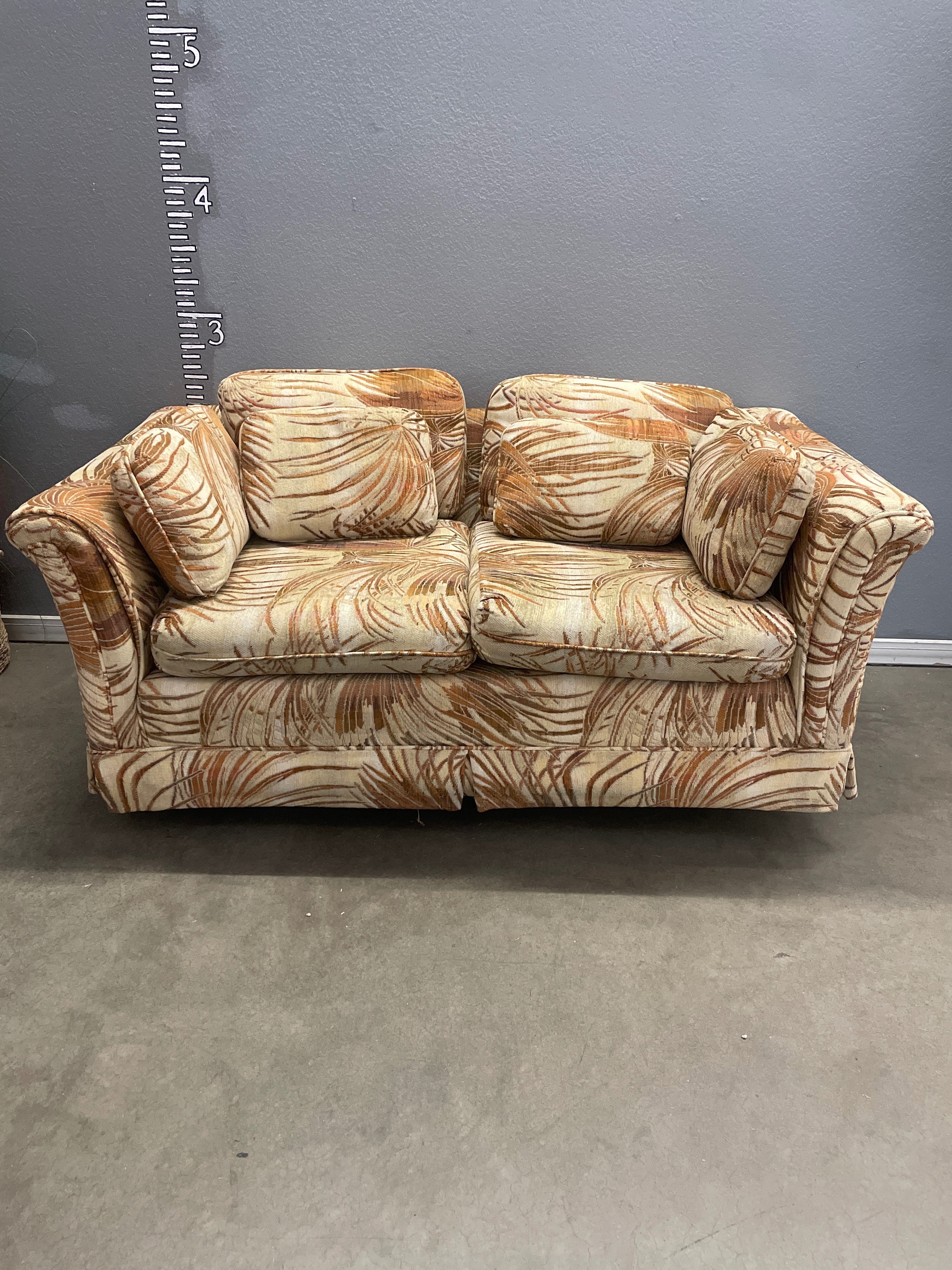 This cozy loveseat features a charming palm print design in warm earth tones. The fabric is a soft, woven material offering a comfortable and inviting finish. Approximate Size: 3 x 5 x 2.5