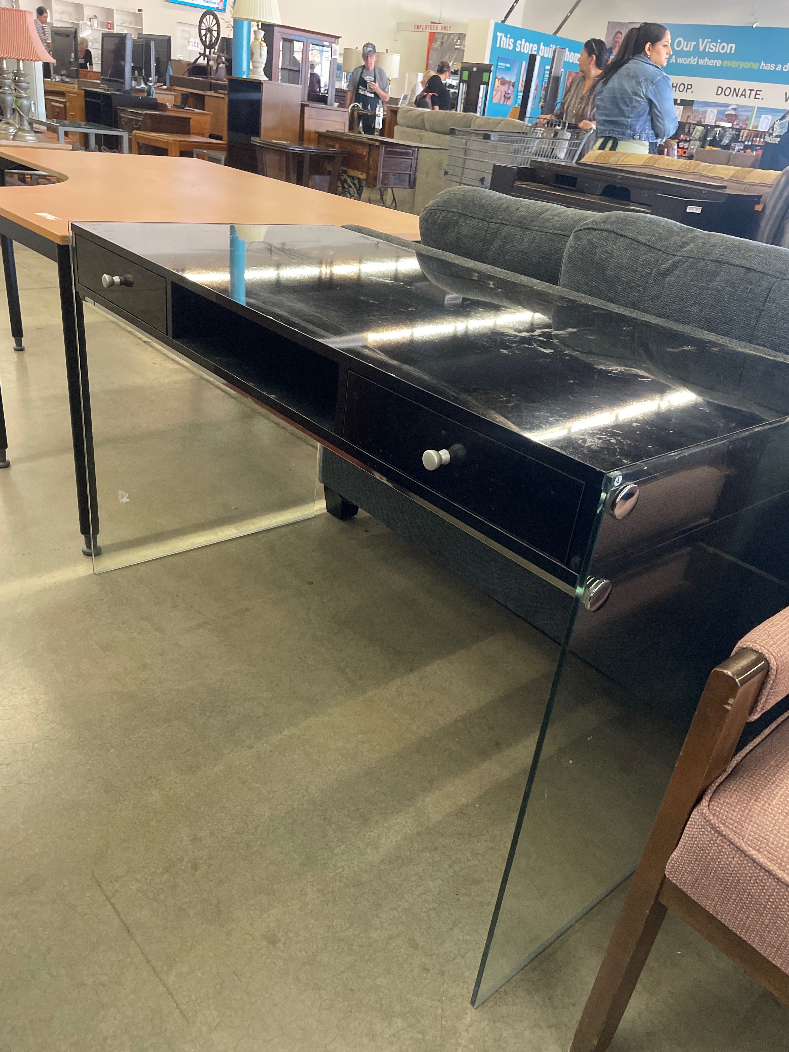 Sleek and contemporary desk featuring a glossy black wooden top with smooth finish, supported by transparent glass sides. Includes two convenient storage drawers with metallic handles. Approximate Size: 2.5 x 4 x 2