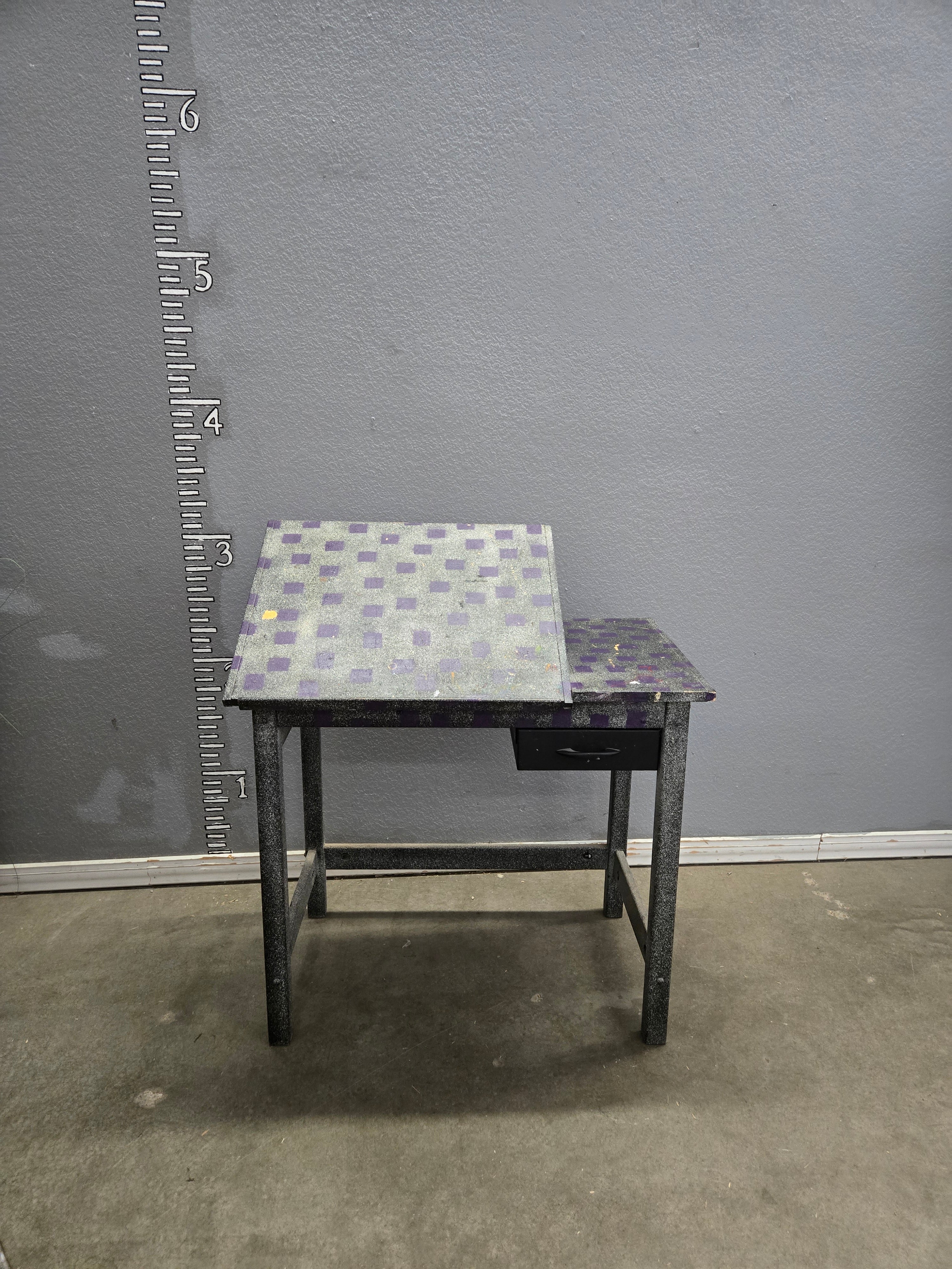 This vintage school desk features a sturdy steel frame with a unique speckled purple and black finish. The desktop has a retro checkered pattern, adding a touch of nostalgia to any setting. Equipped with a storage drawer, this desk is both functional and stylish. Approximate Size: 3 x 2 x 2