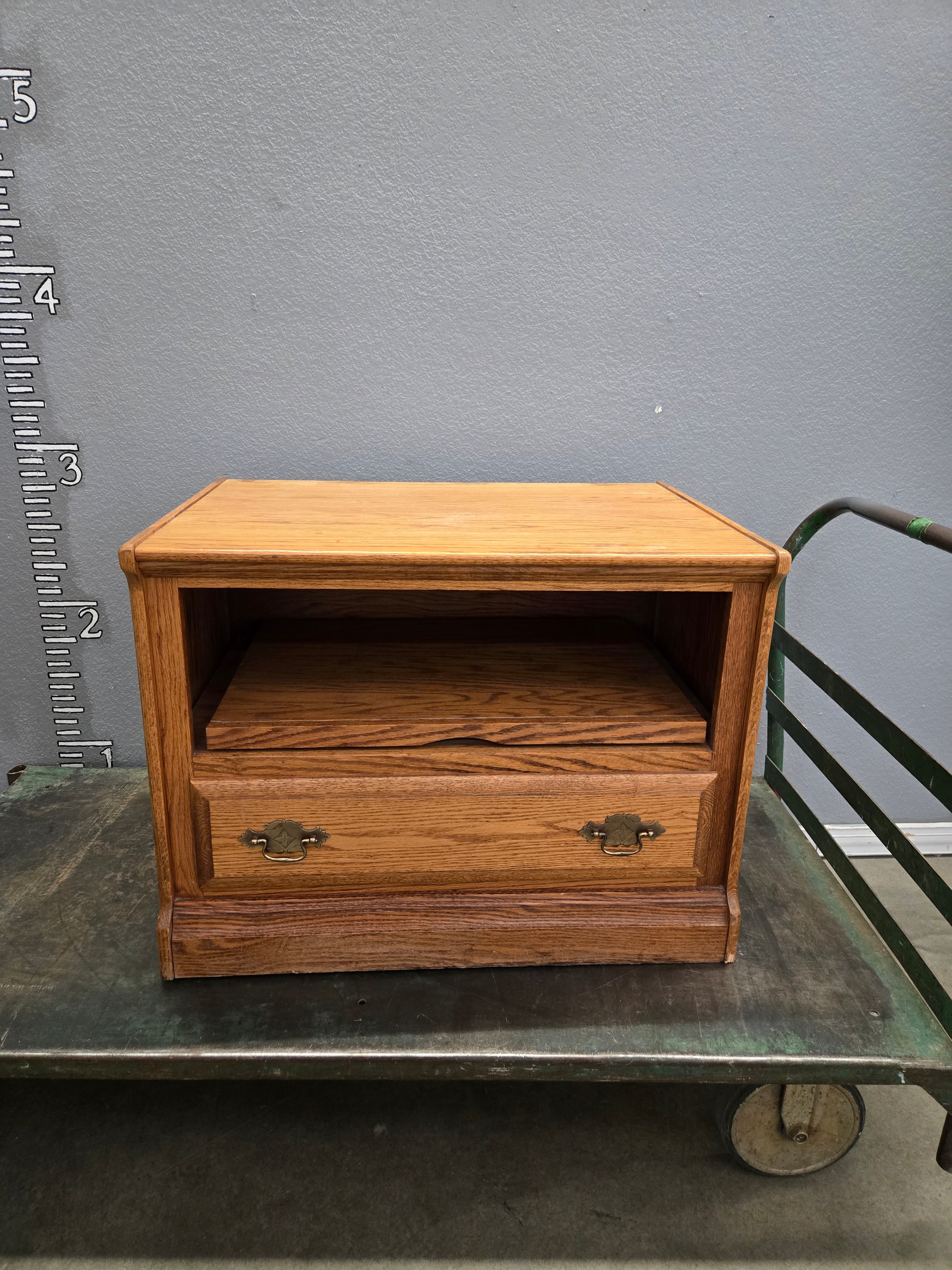 This vintage nightstand is crafted from solid oak with a warm brown finish, featuring a single pull-out drawer with brass handles for storage. The open shelf design adds versatility and style, making it a timeless piece for any bedroom. Approximate Size: 2 x 1.5 x 1