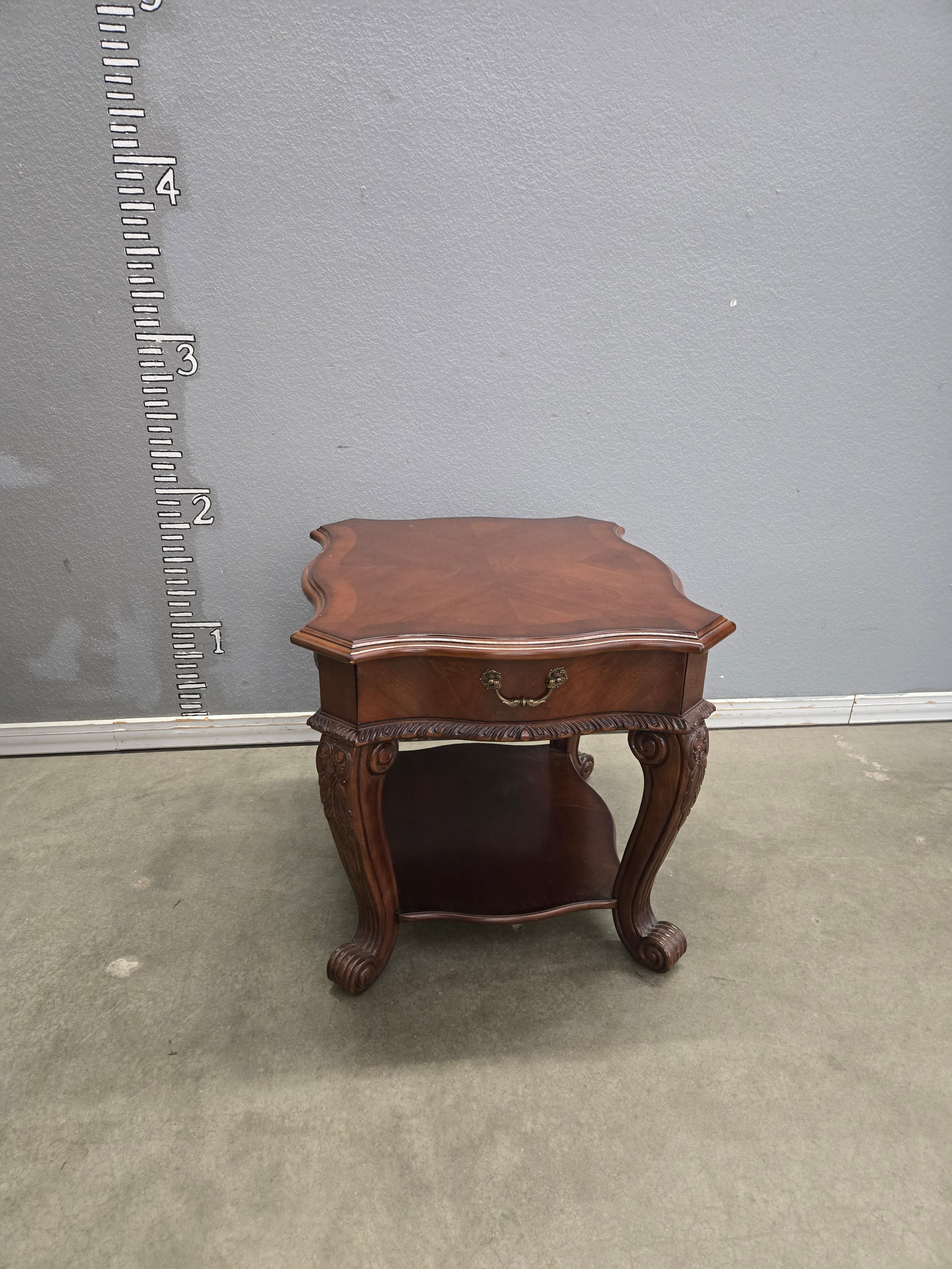 Beautifully crafted vintage side table featuring a rich brown color with an elegant polished wood finish. Approximate Size: 2 x 1.5 x 1.5