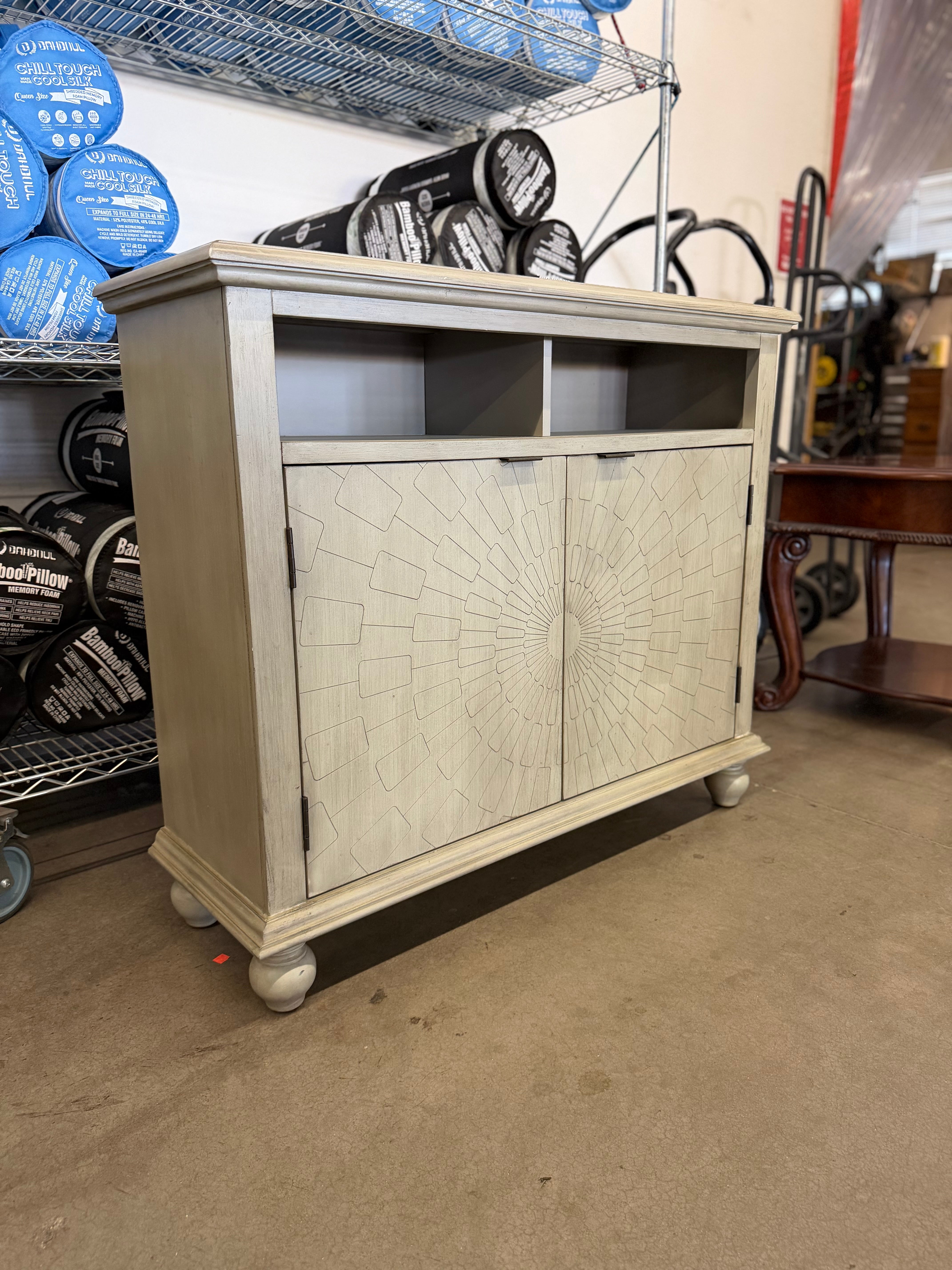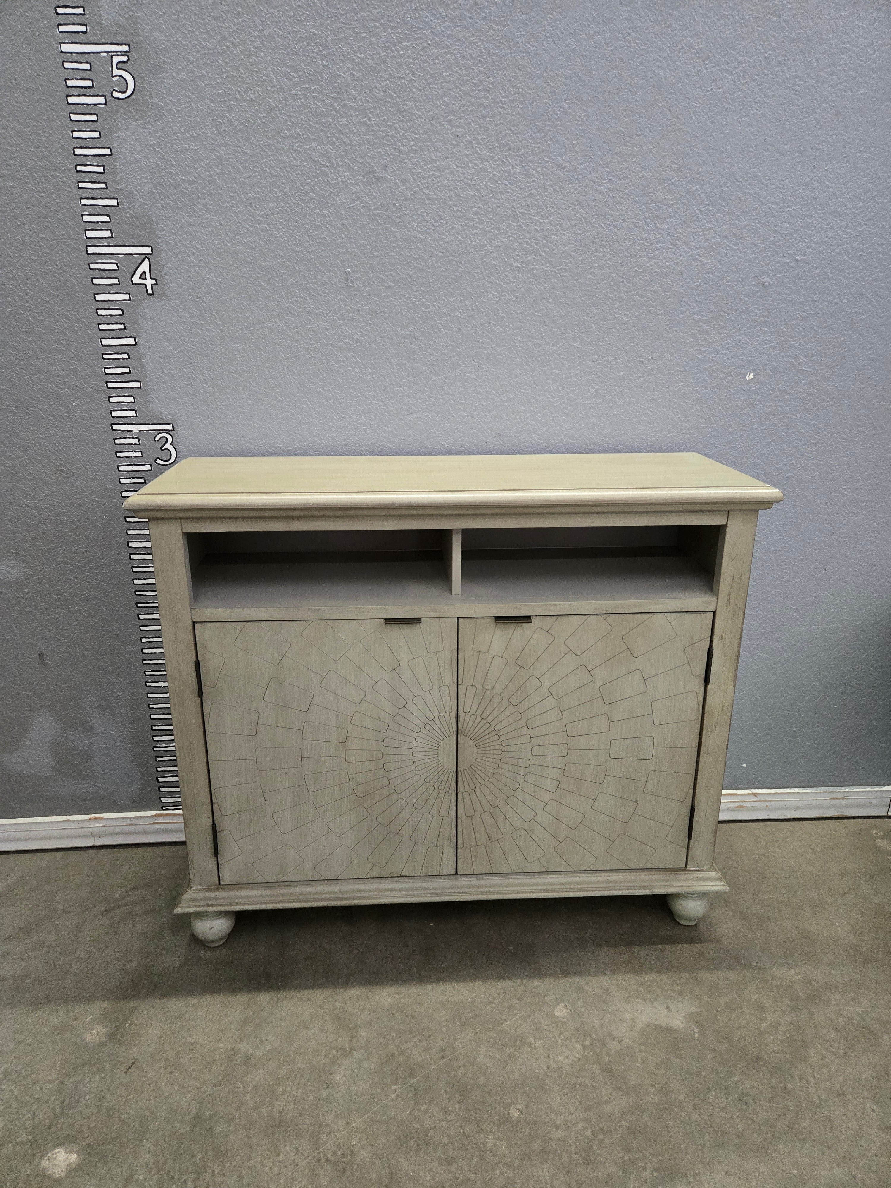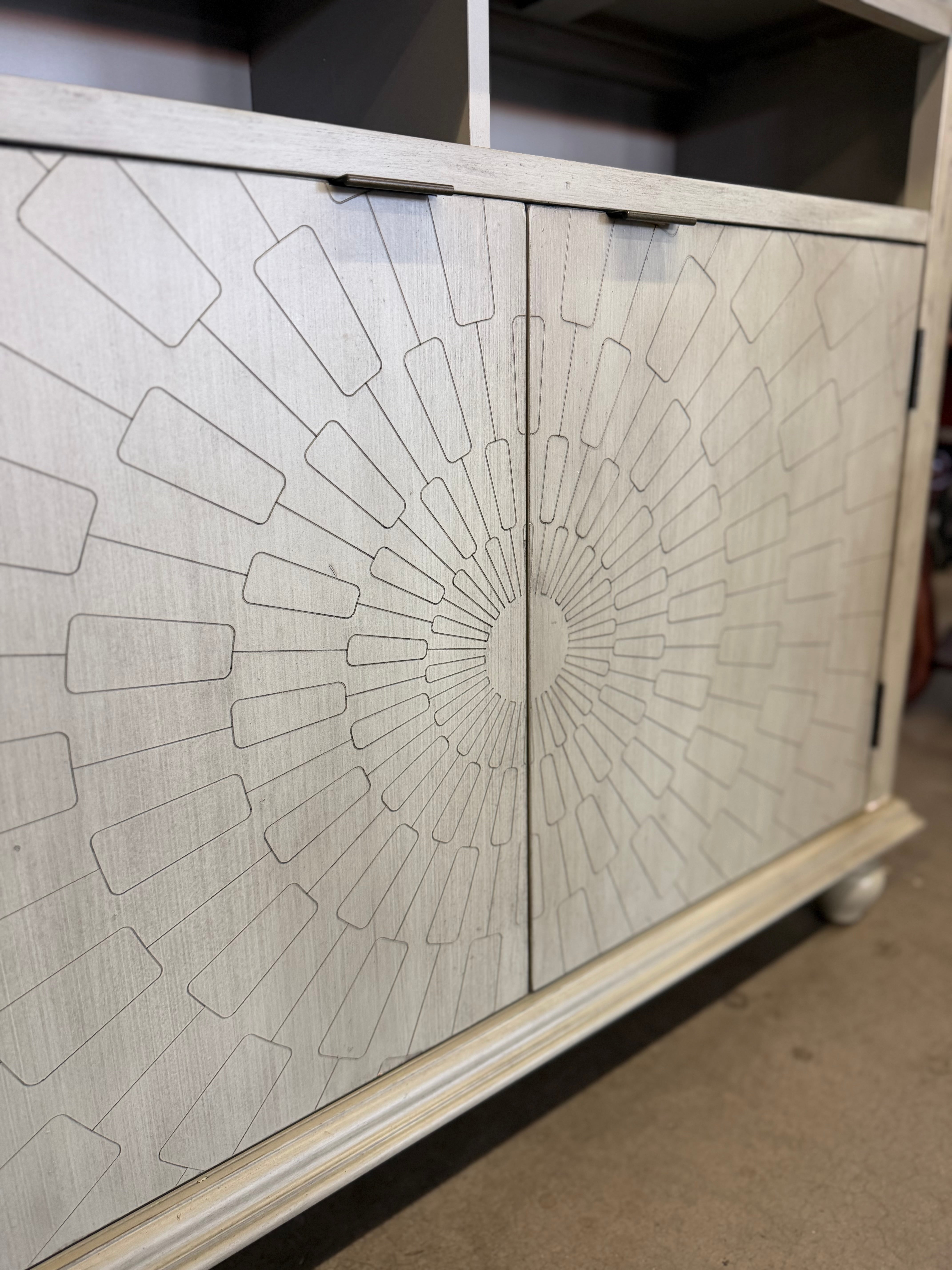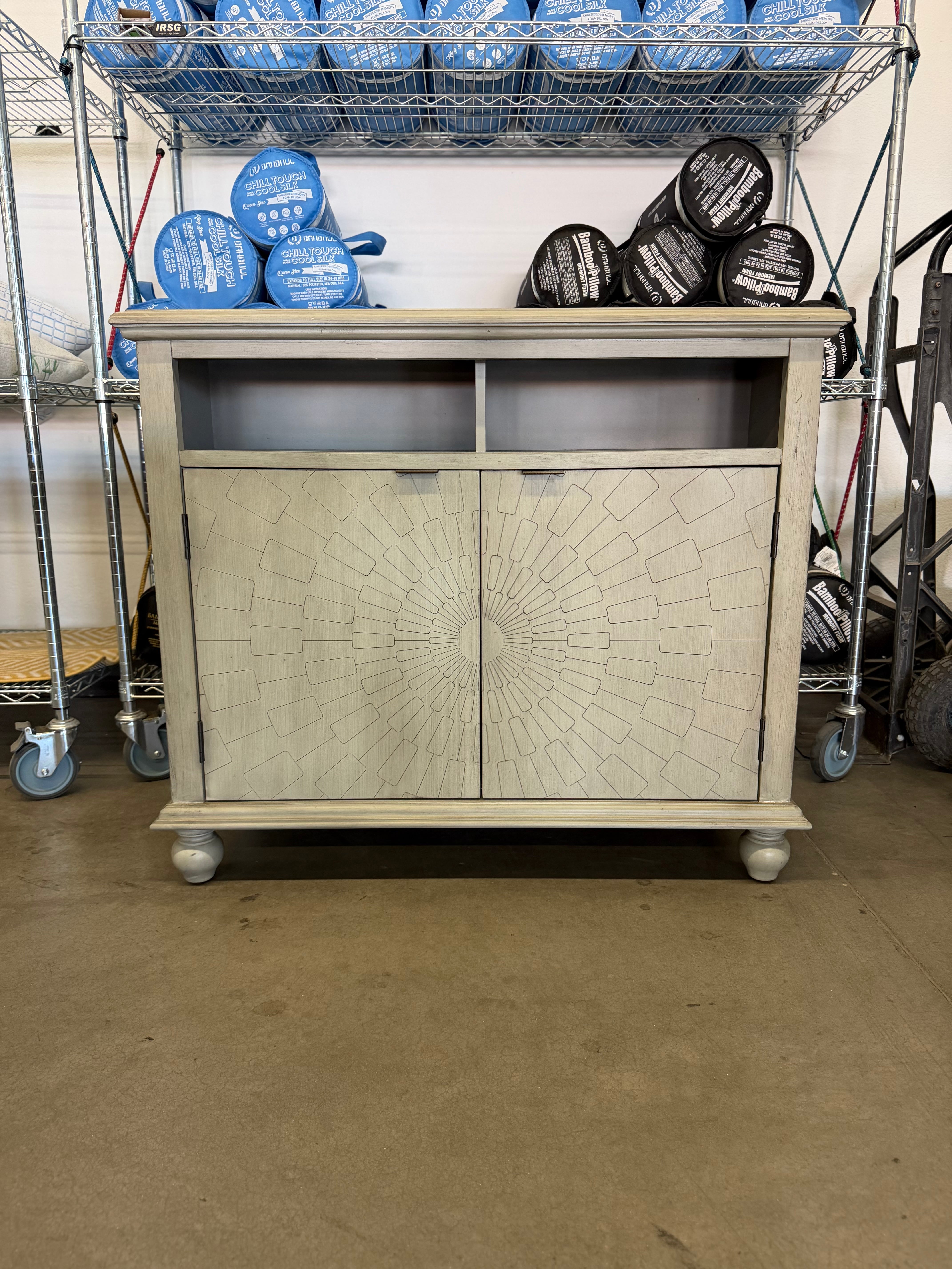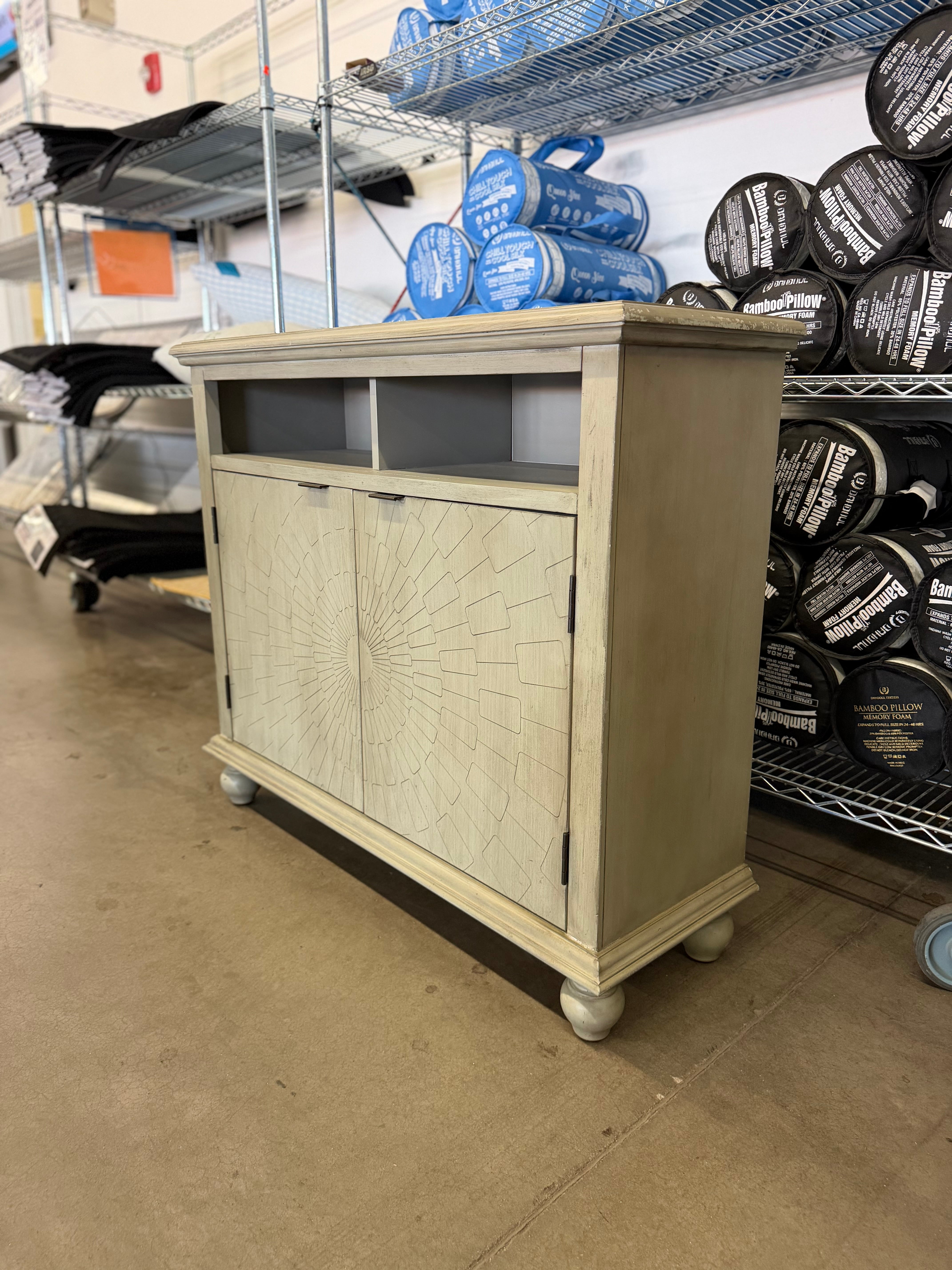 This charming cabinet features a light beige color with a sunburst pattern on the doors that adds a touch of elegance to any room. It has a matte finish that gives it a classic look. Approximate Size: 3 x 3.5 x 1.5