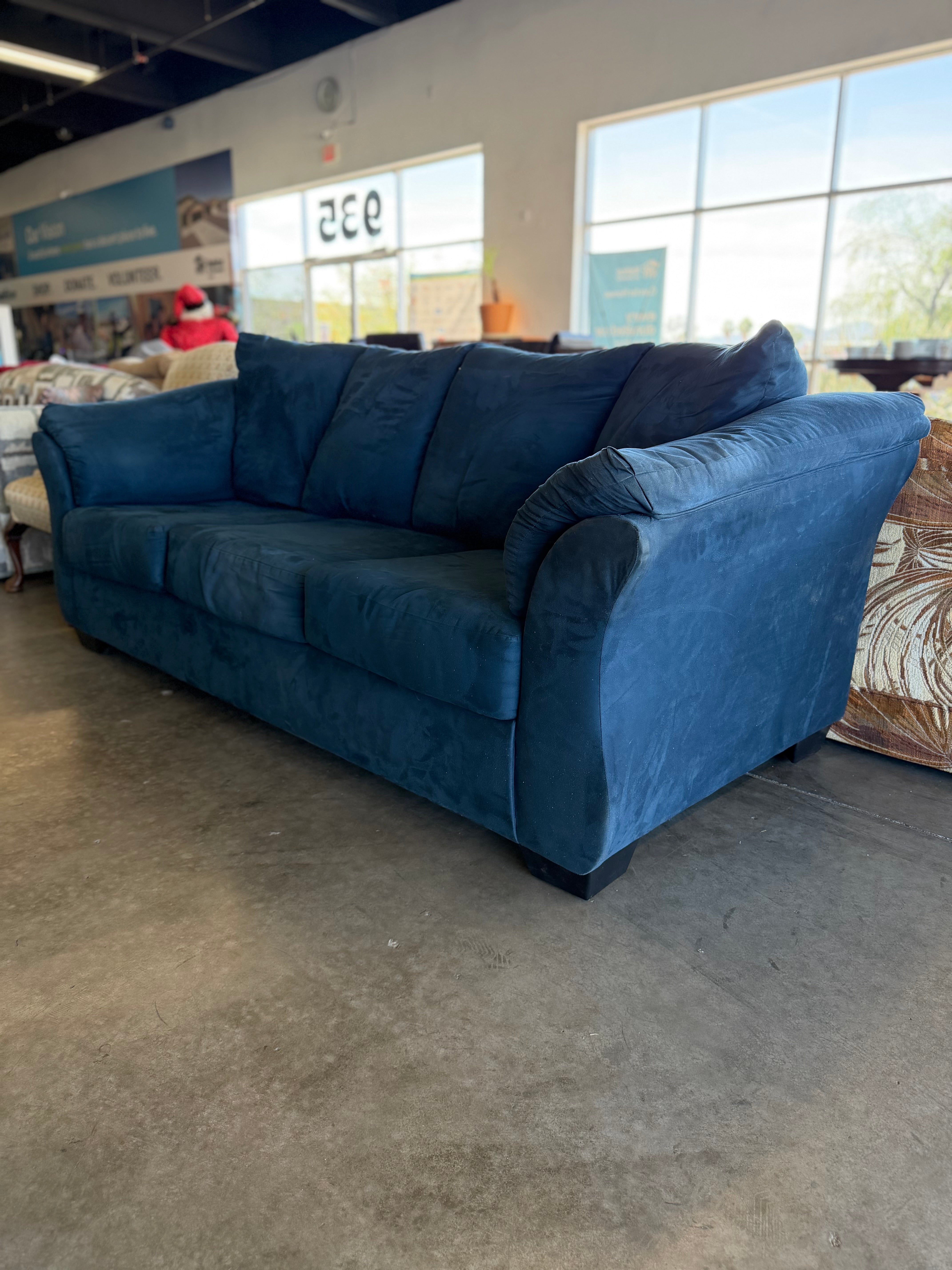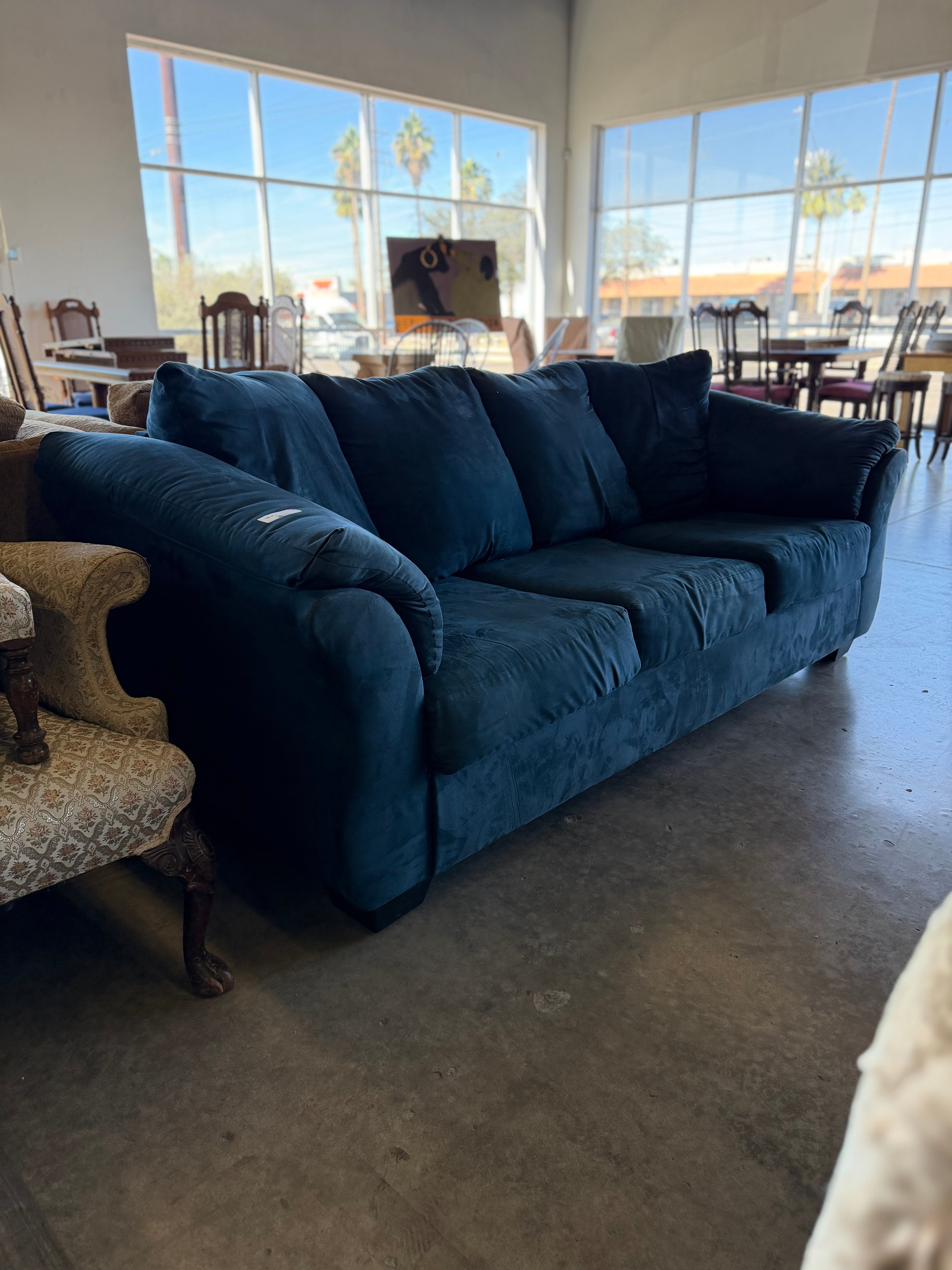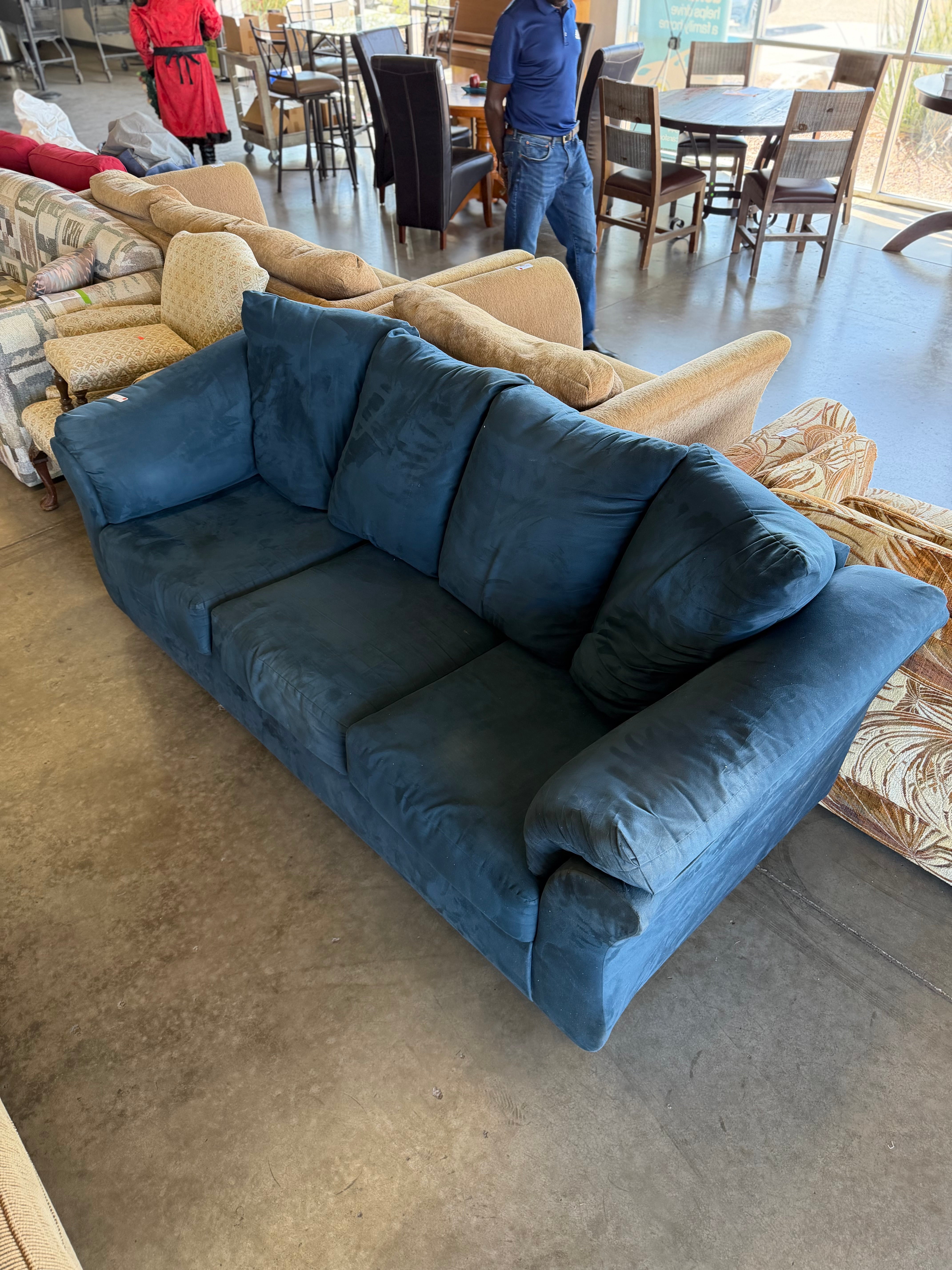 This comfortable sofa features a rich blue microfiber finish, offering both style and coziness to your living room decor. Approximate Size: 3 x 6 x 3