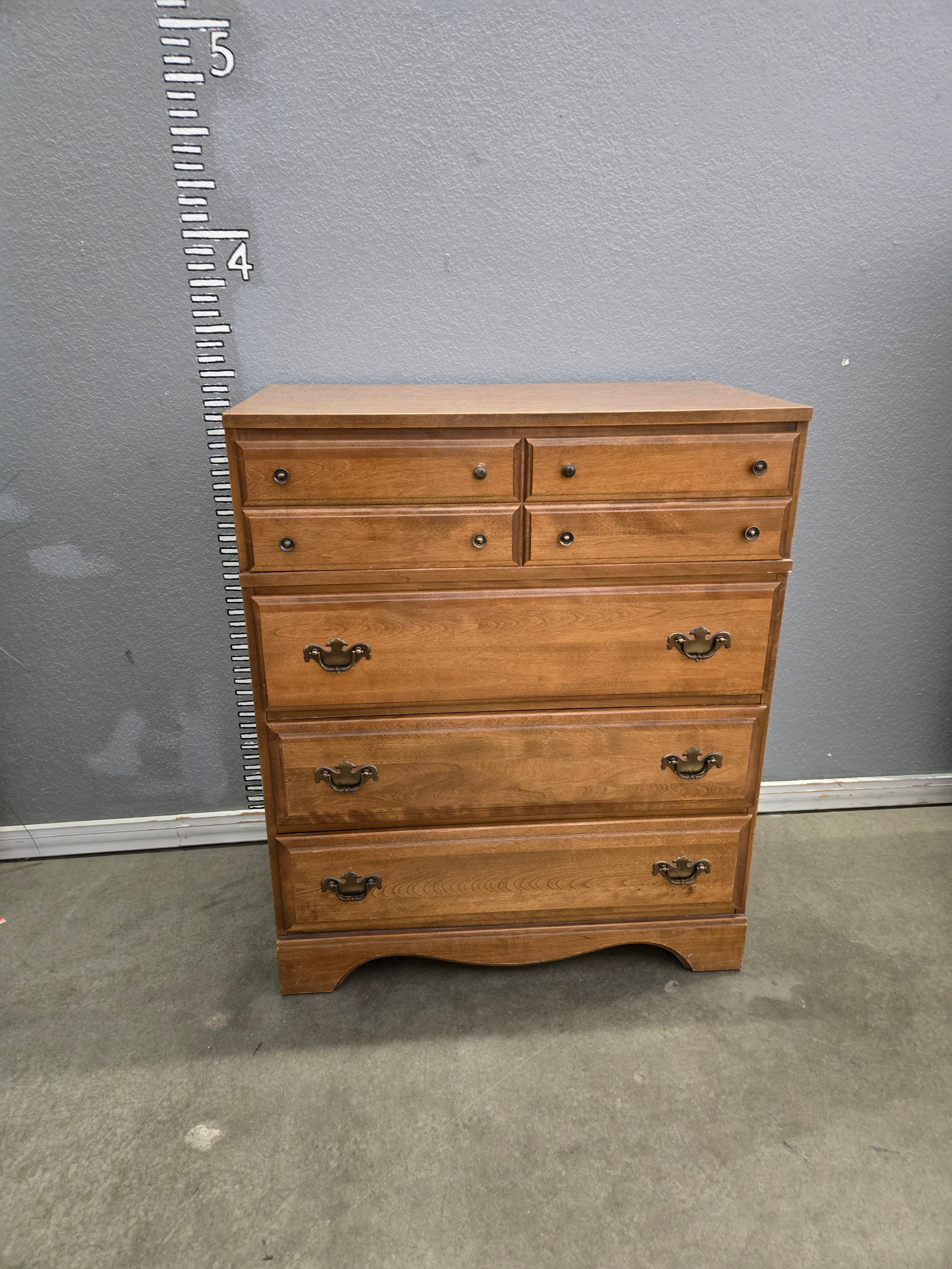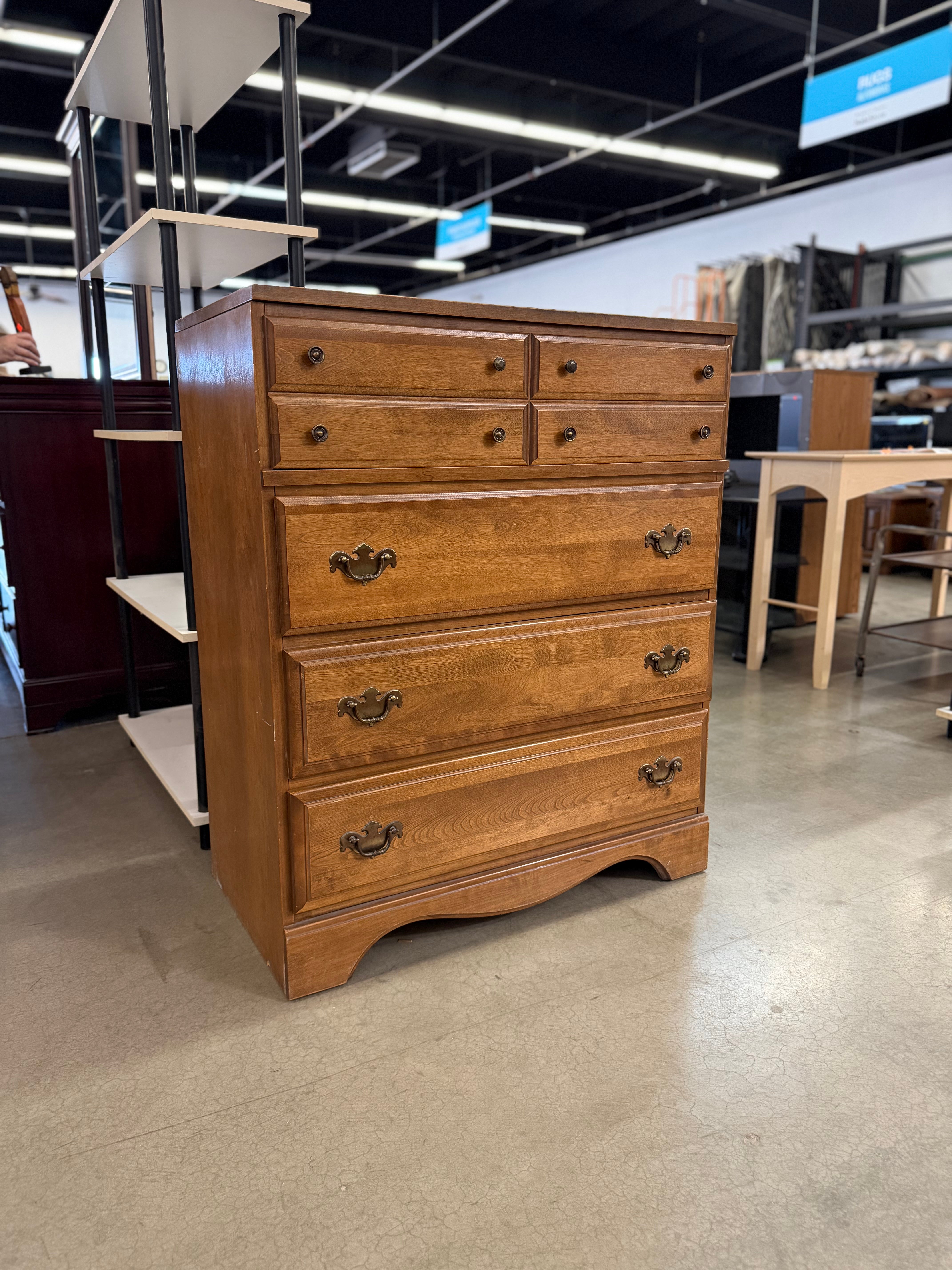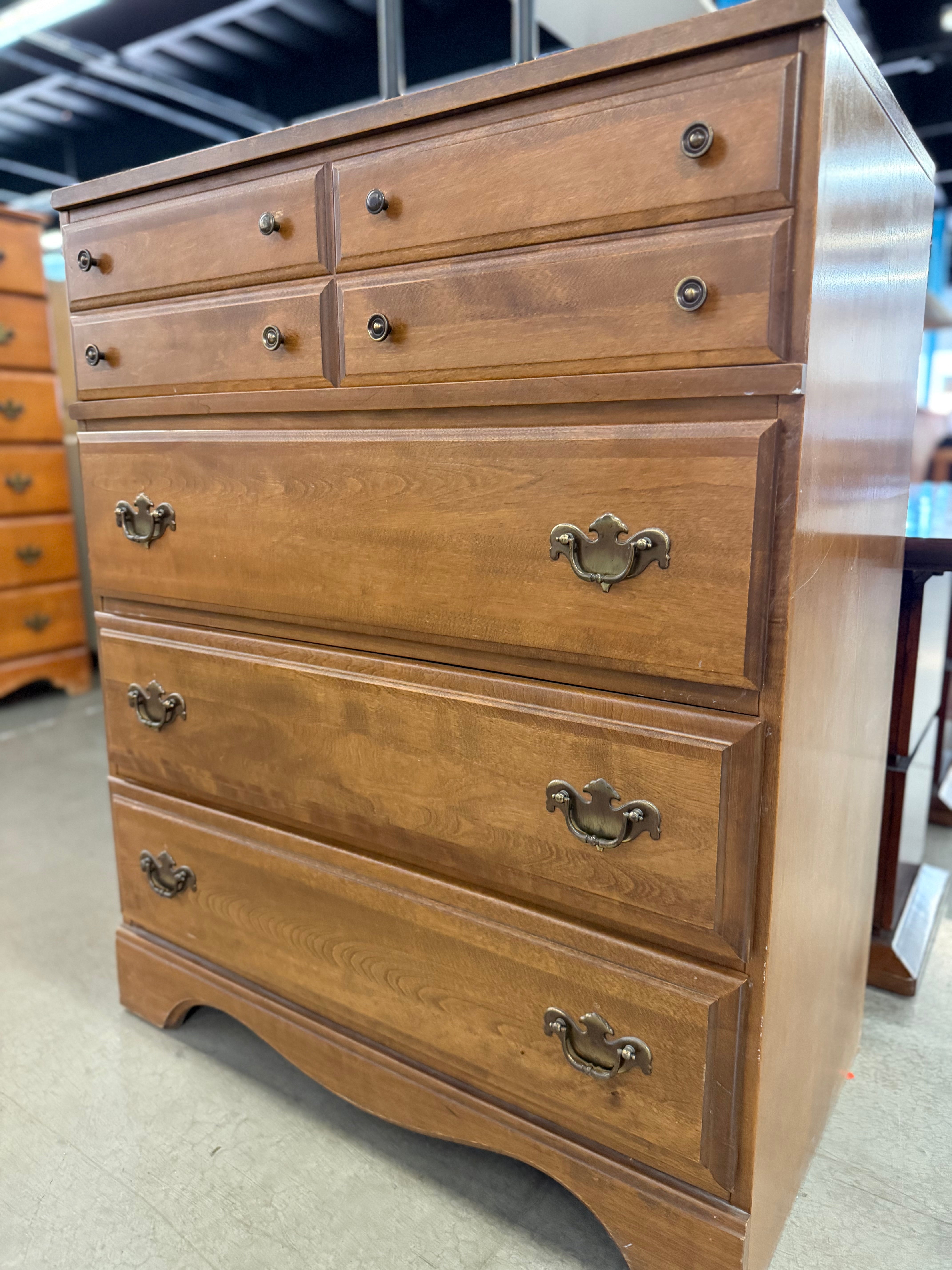 This classic vintage dresser features a natural wood color with a smooth finish. It includes elegant brass handles, adding a touch of sophistication to any space. Approximate Size: 4.5 x 3 x 1.5