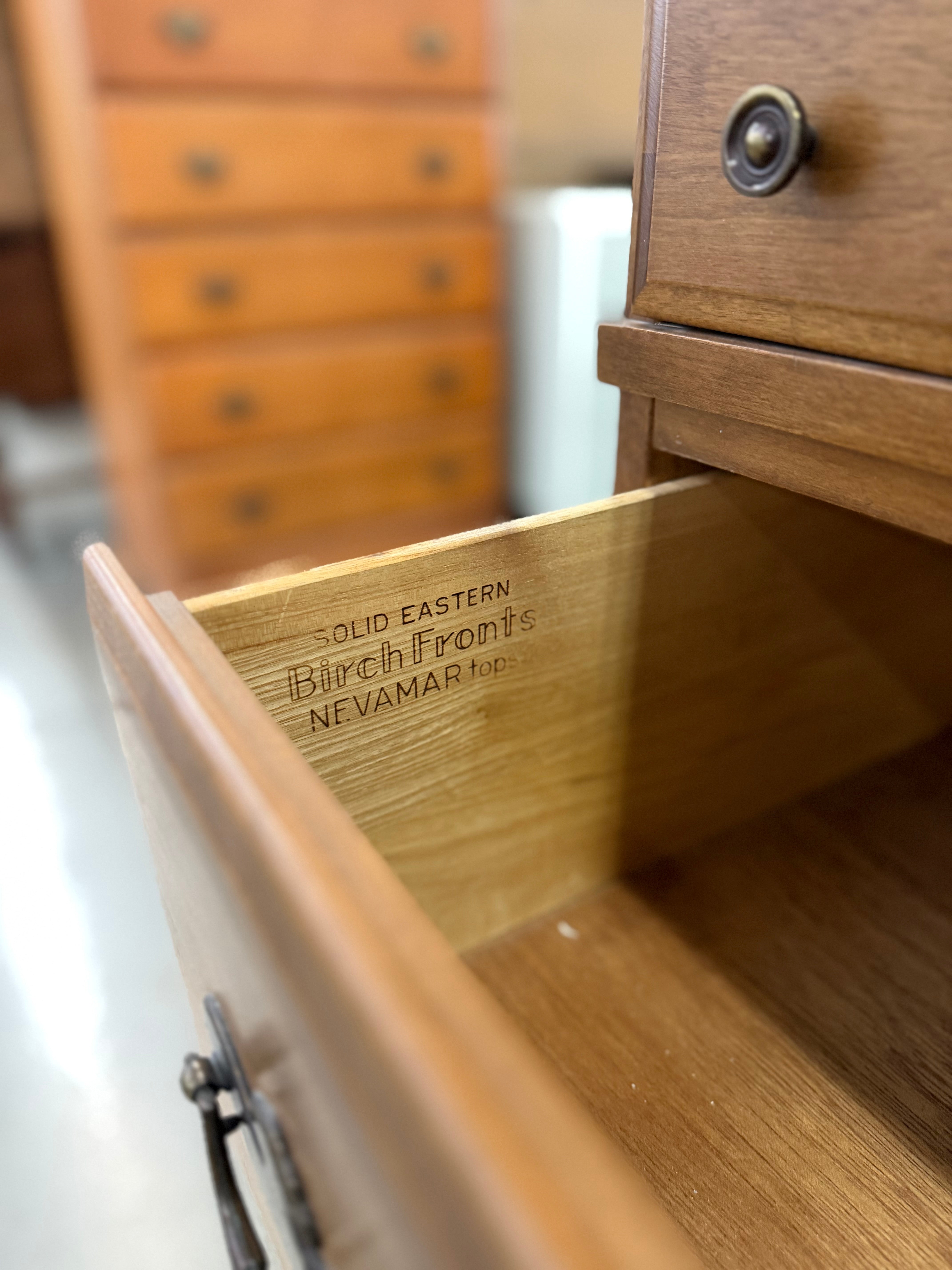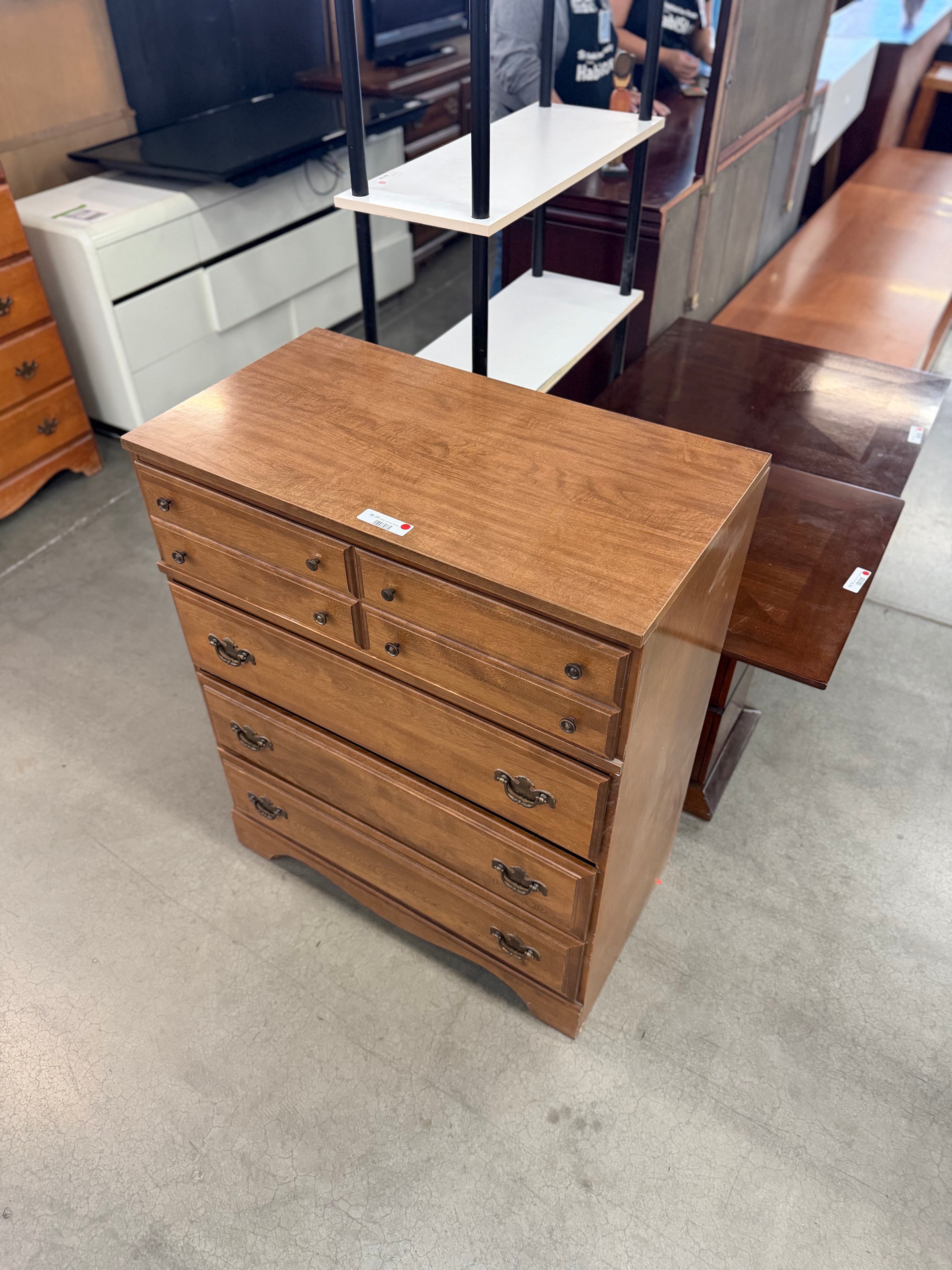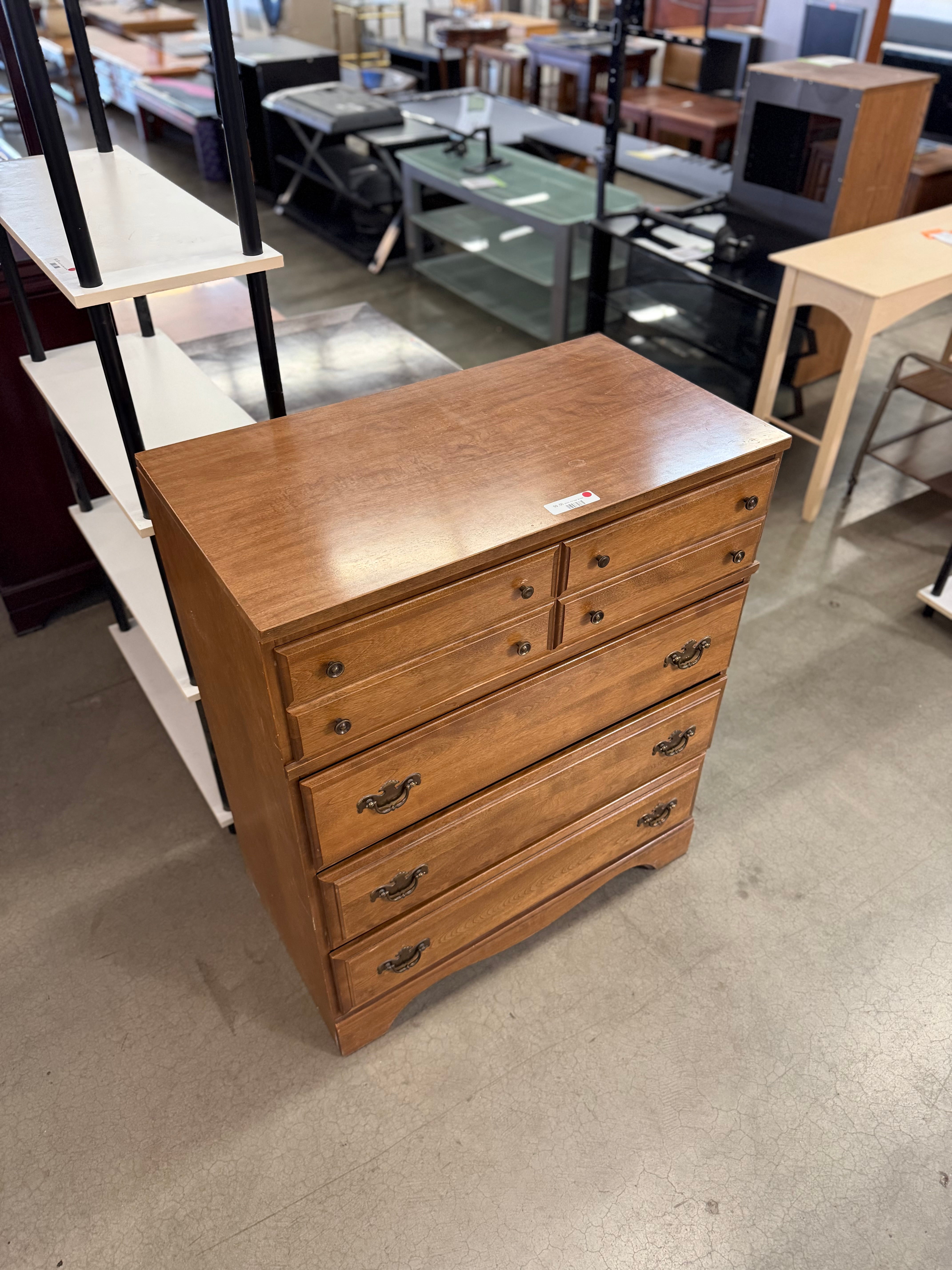This classic vintage dresser features a natural wood color with a smooth finish. It includes elegant brass handles, adding a touch of sophistication to any space. Approximate Size: 4.5 x 3 x 1.5