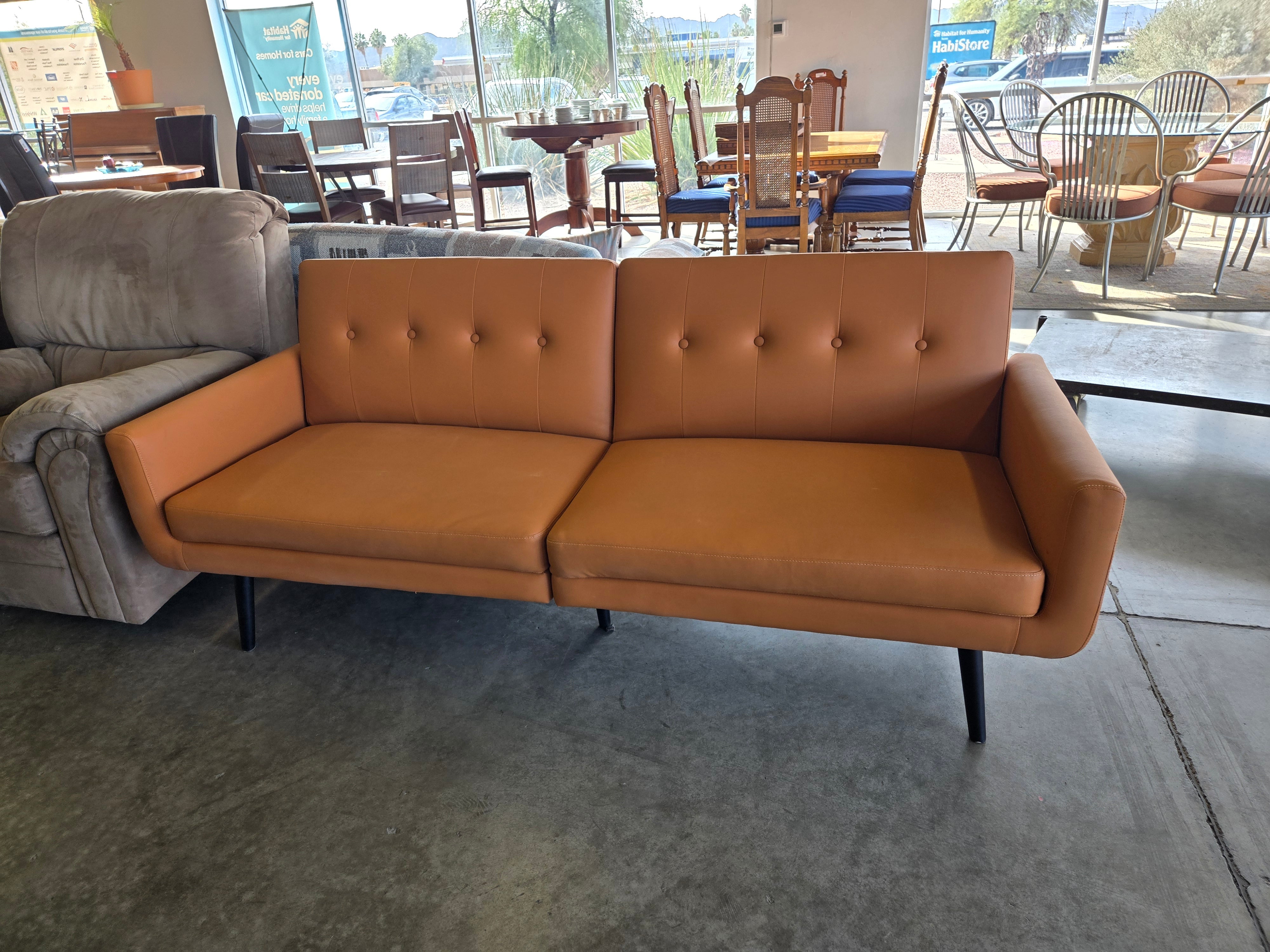 This stylish sofa features a mid-century modern design with a warm, tan faux leather finish. Its sleek silhouette and button-tufted back add a touch of sophistication to any living room. Approximate Size: 2.5 x 6 x 2.5