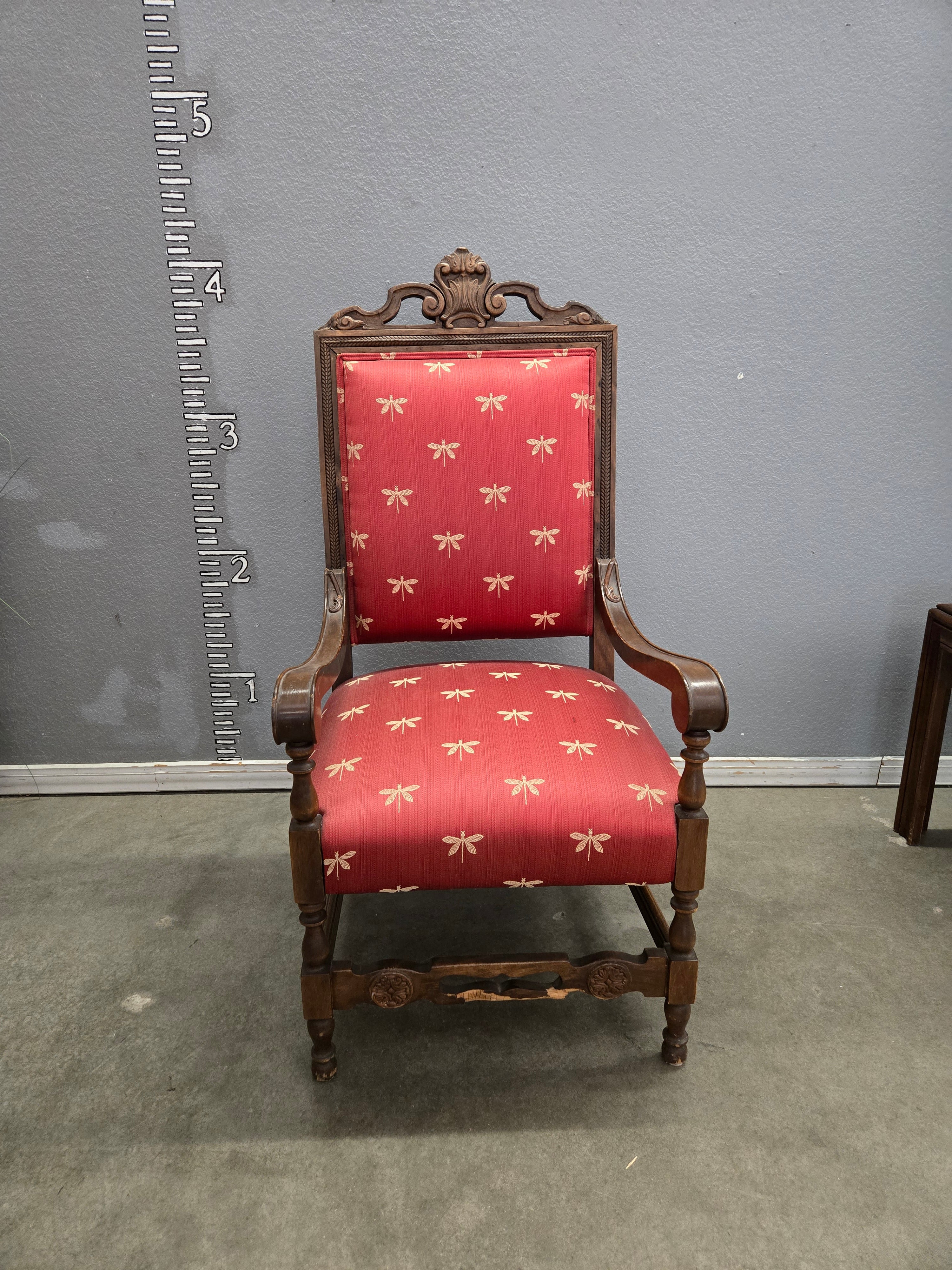 This elegant vintage armchair features a beautifully carved wooden frame with an ornate design. The upholstery is a vibrant red fabric adorned with a charming pattern of gold motifs. The finish of the wood is a rich, warm brown, adding a touch of sophistication to any room. Approximate Size: 4.5 x 2 x 2
