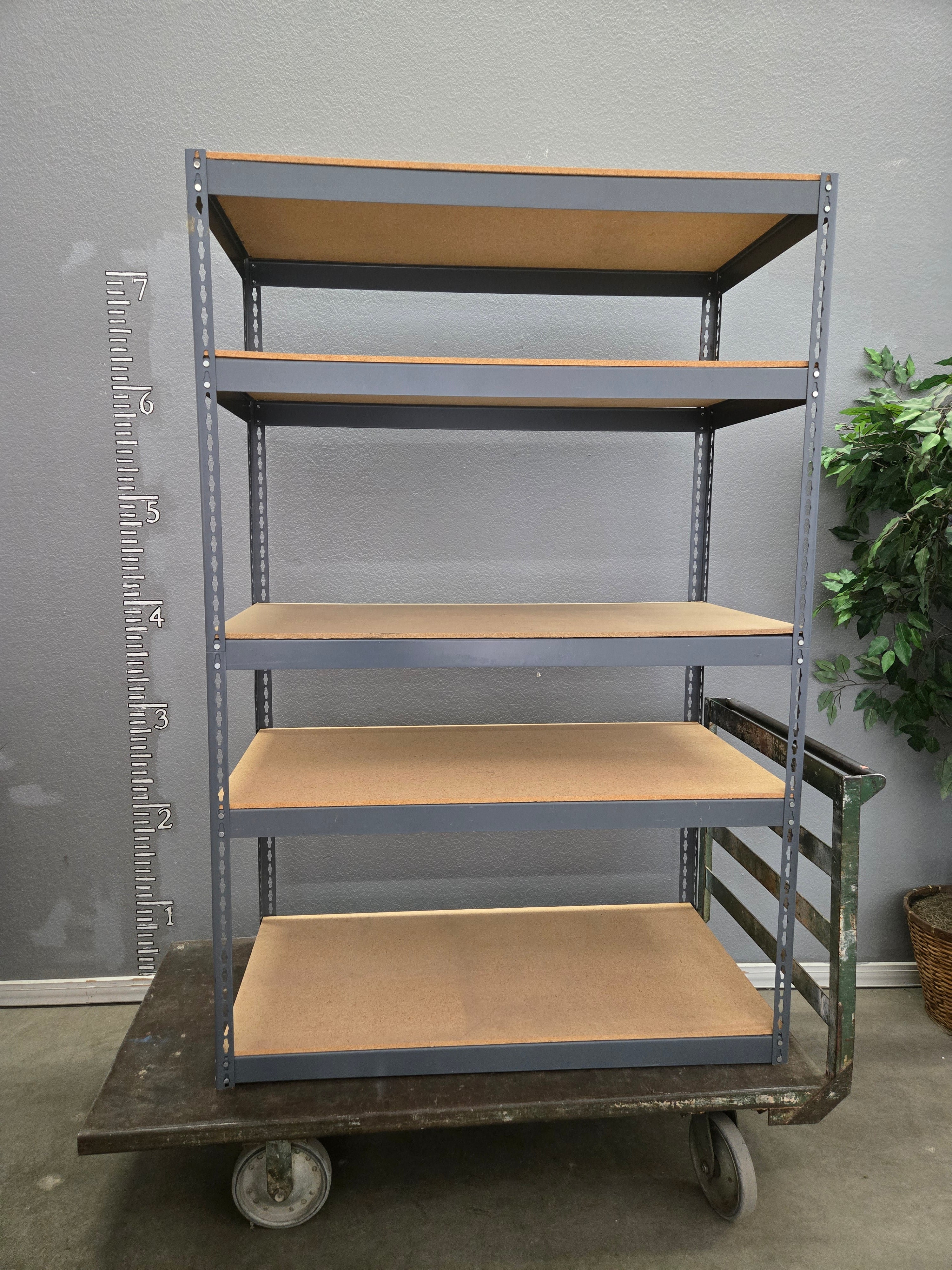 This robust shelving unit features a durable metal frame with a sleek gray finish and sturdy particle board shelves in a natural wood color. Ideal for organizing your garage or office space with style. Approximate Size: 6 x 4 x 1.5