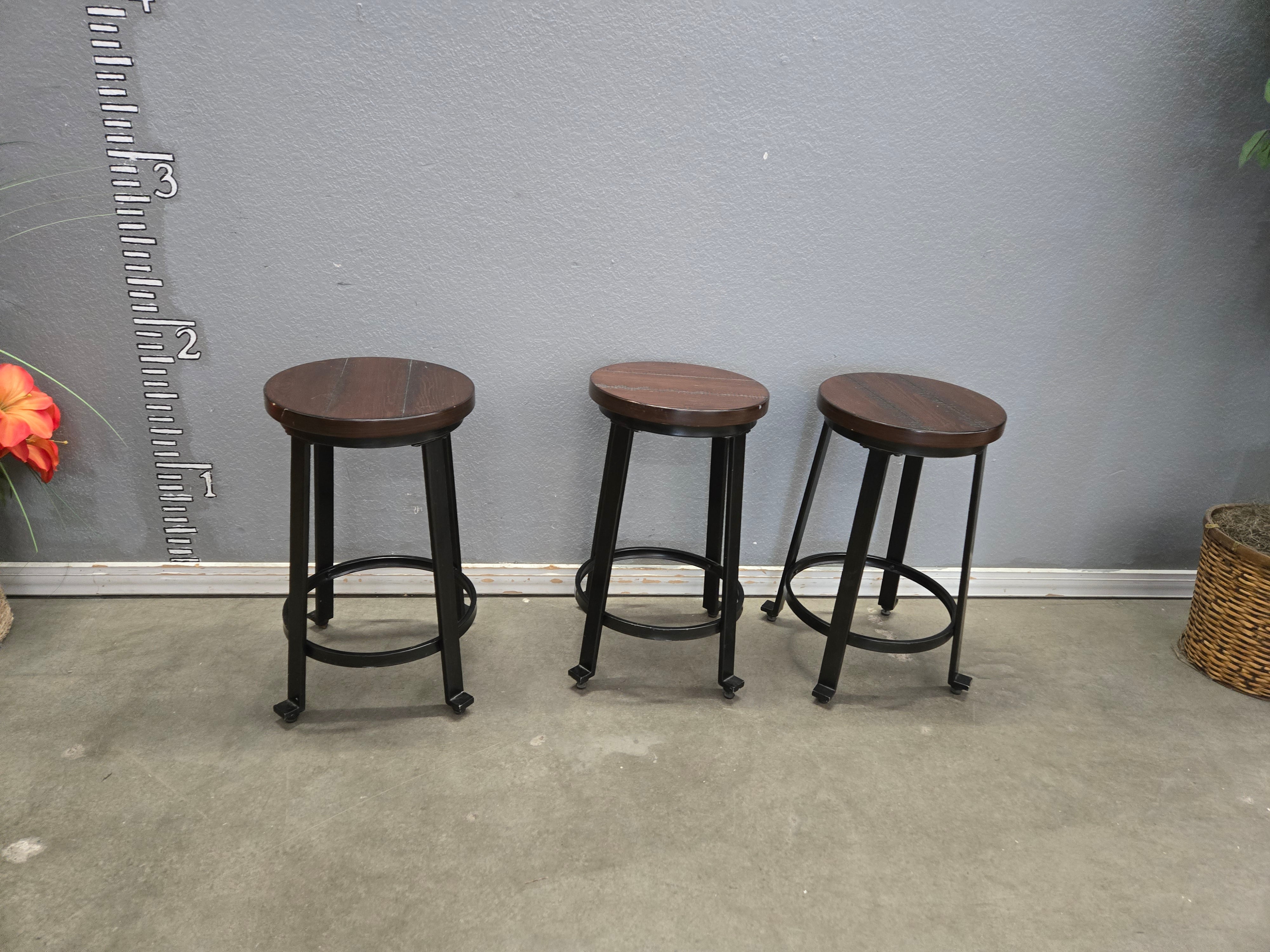 Set of 4 industrial-style bar stools featuring a dark brown wood finish on the seats and a black metal frame. The stools provide a rustic yet modern look, making them a perfect addition to any home or bar setting. Approximate Size: 2.5 x 1.5 x 1.5
