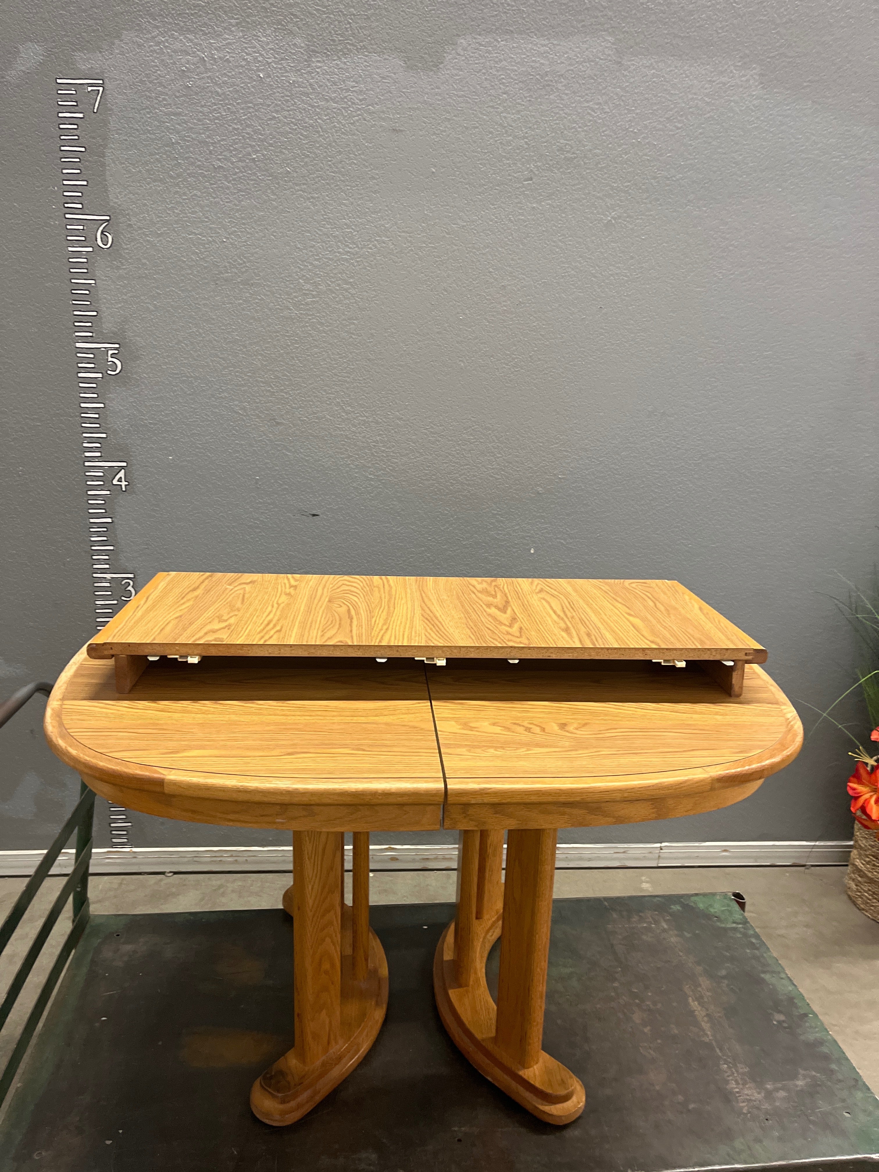This expandable oval dining table features a warm oak finish and a solid wood construction. Ideal for family gatherings and dinner parties. Approximate Size: 2.5 x 5 x 3