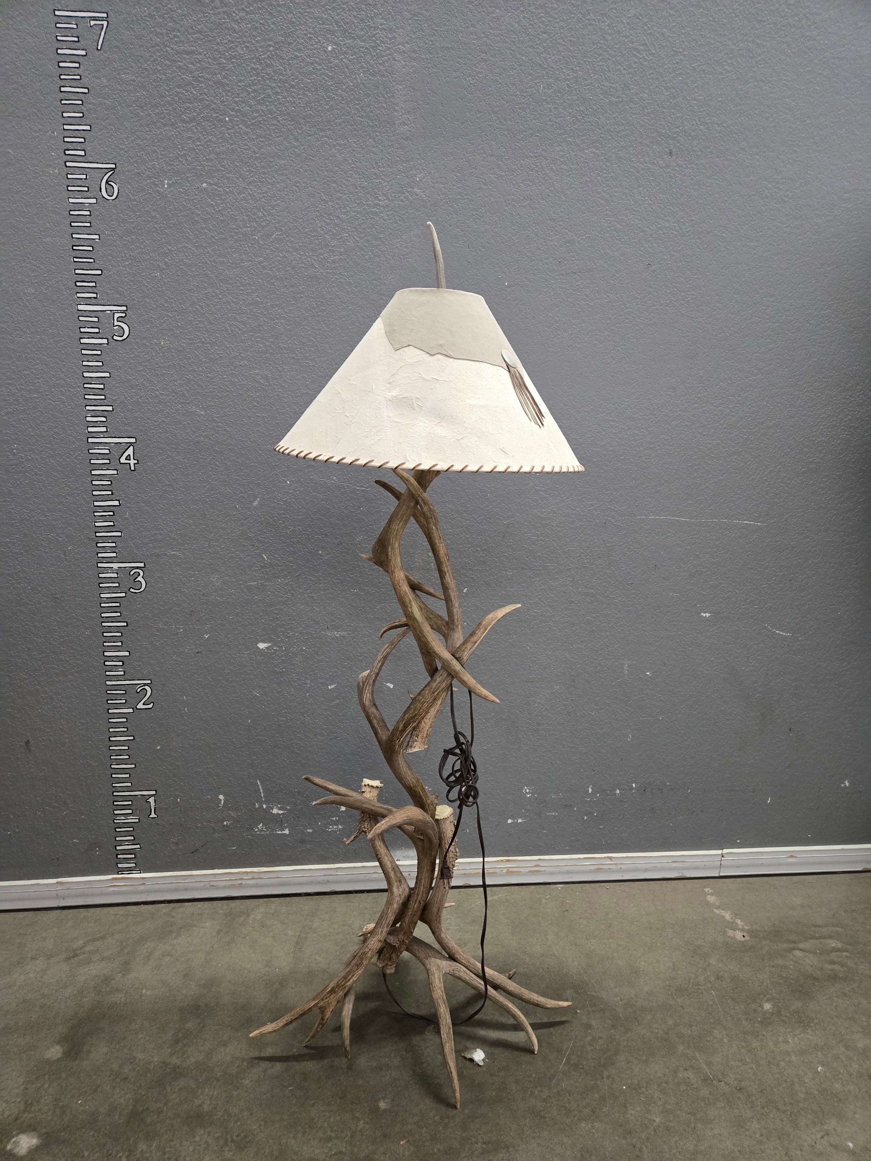 This unique floor lamp features a natural antler base with a rustic, earthy finish. The lamp is topped with a cream-colored shade that complements the organic design. Approximate Size: 6 x 1.5 x 1.5