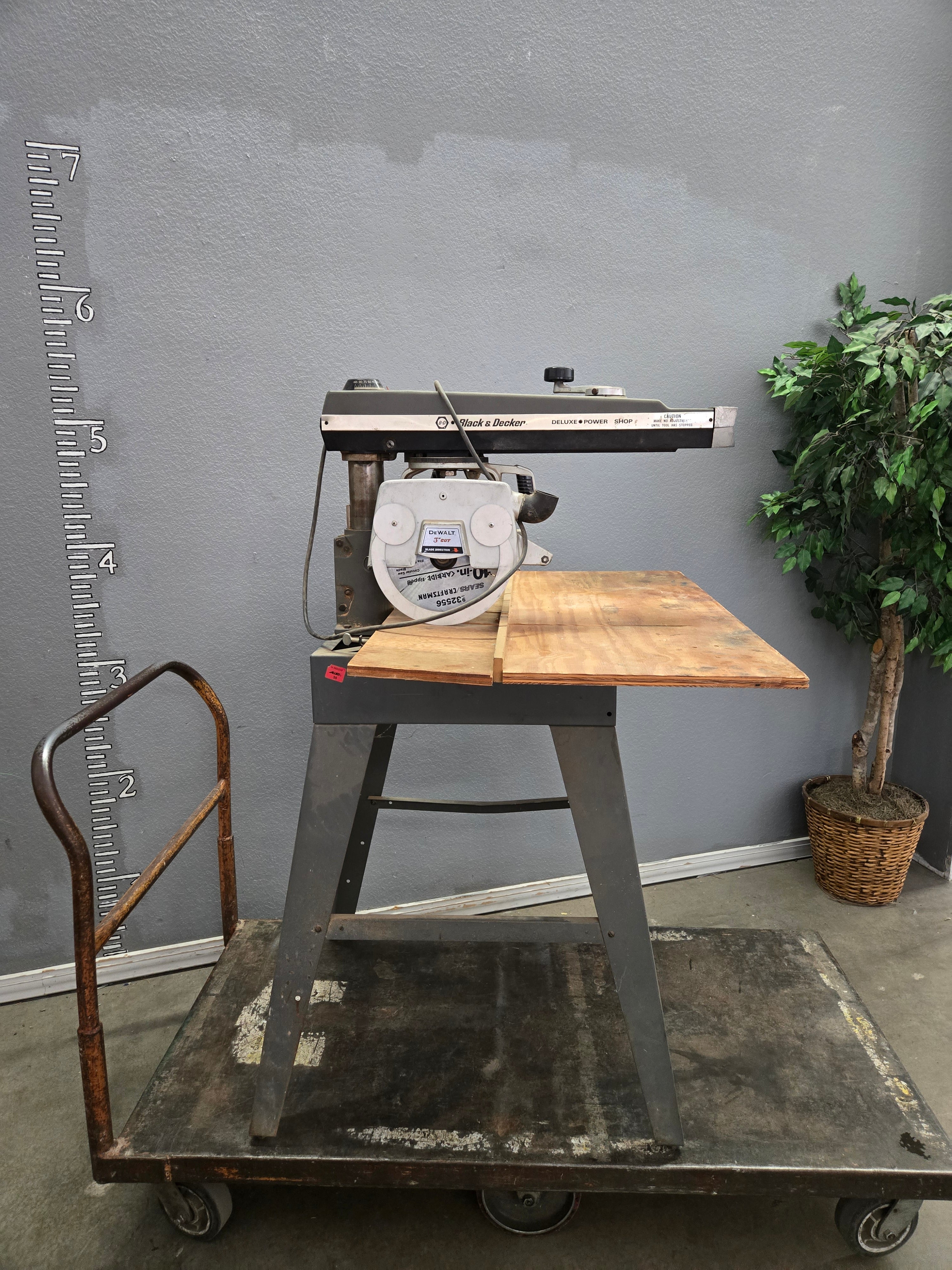This Black & Decker Deluxe Power Shop Radial Arm Saw features a sturdy metal frame with a natural wood finish table. Designed for precise cutting tasks, it is ideal for woodworking projects in your garage or workshop. Approximate Size: 5 x 2.5 x 3