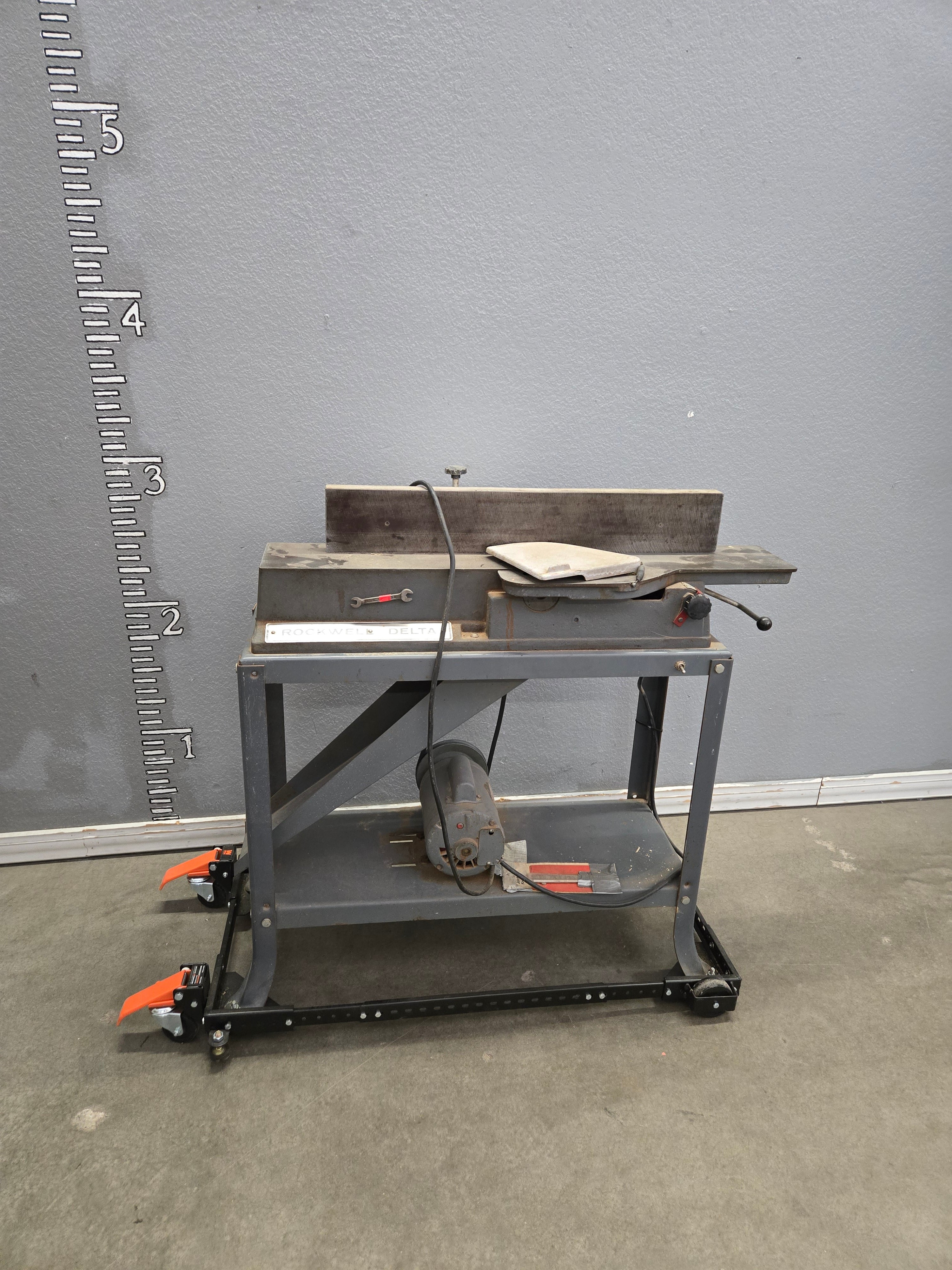A sturdy Rockwell Delta jointer planer featuring a robust gray metal construction with an industrial finish. Ideal for woodworking and precision planning tasks. Approximate Size: 3 x 4 x 2