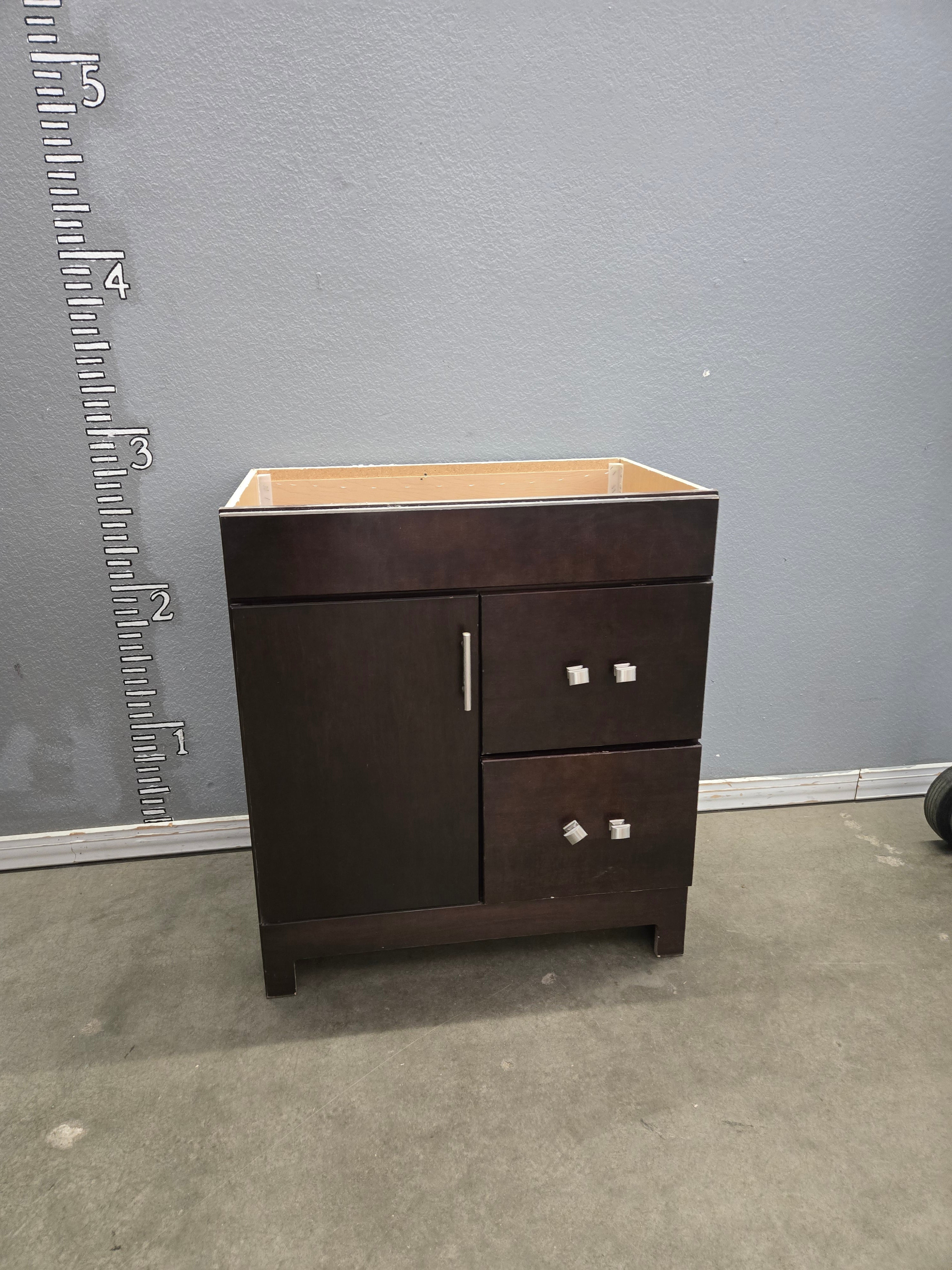This elegant bathroom vanity cabinet features a rich, dark wood finish with a sleek, modern look. It is designed to fit into various bathroom styles, offering a practical storage solution with one cabinet door and two drawers. The sturdy construction ensures durability, while the stylish handles add a touch of sophistication. Approximate Size: 3 x 2.5 x 1.5