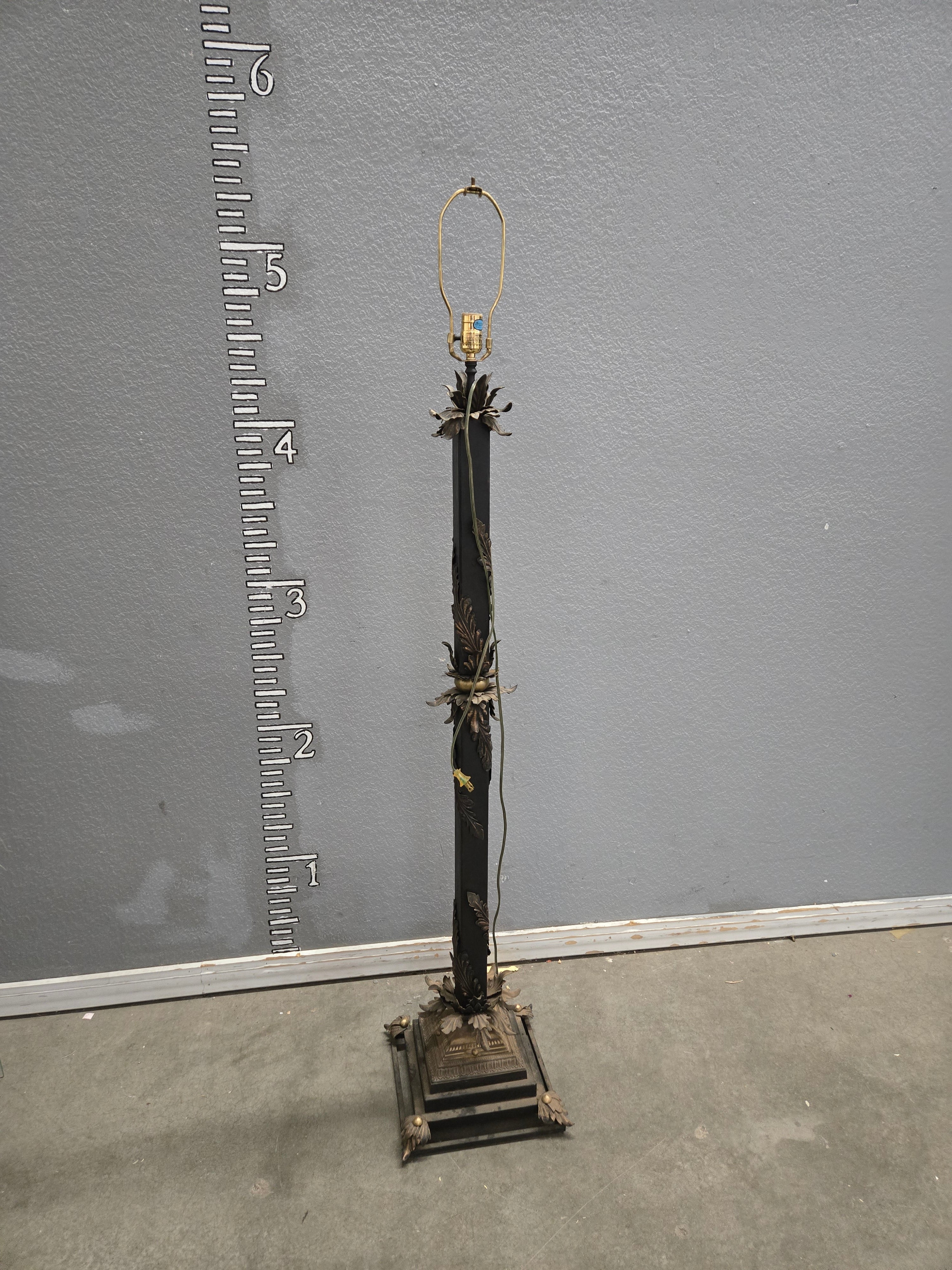 This vintage floor lamp features a sturdy iron construction with an intricate leaf design. The lamp is predominantly black with a distressed finish, adding a touch of rustic elegance to any room. Approximate Size: 5.5 x 1 x 1