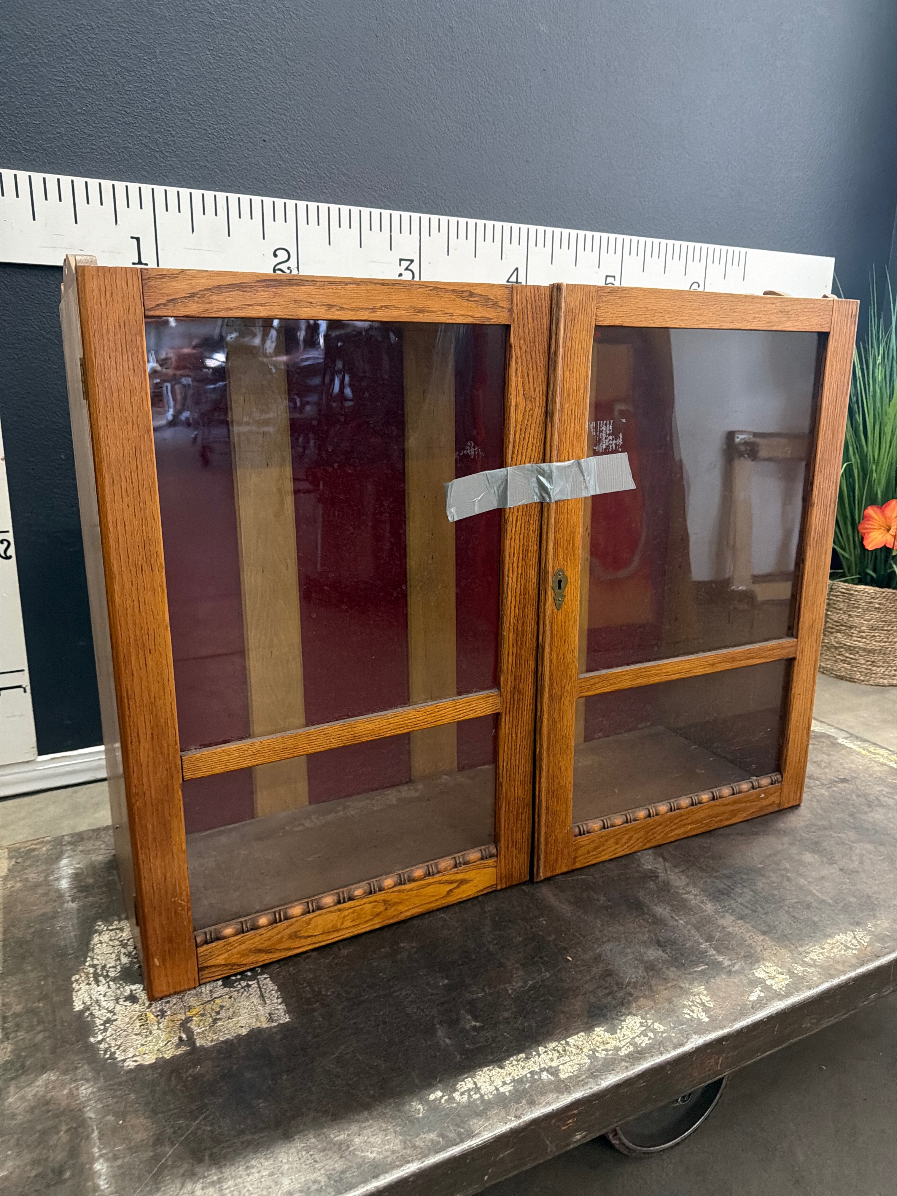 This charming vintage display cabinet features a warm, natural wood finish with sleek glass doors, perfect for showcasing your treasures. Its classic design is versatile, fitting seamlessly into any décor style. Approximate Size: 2 x 2.5 x 0.5