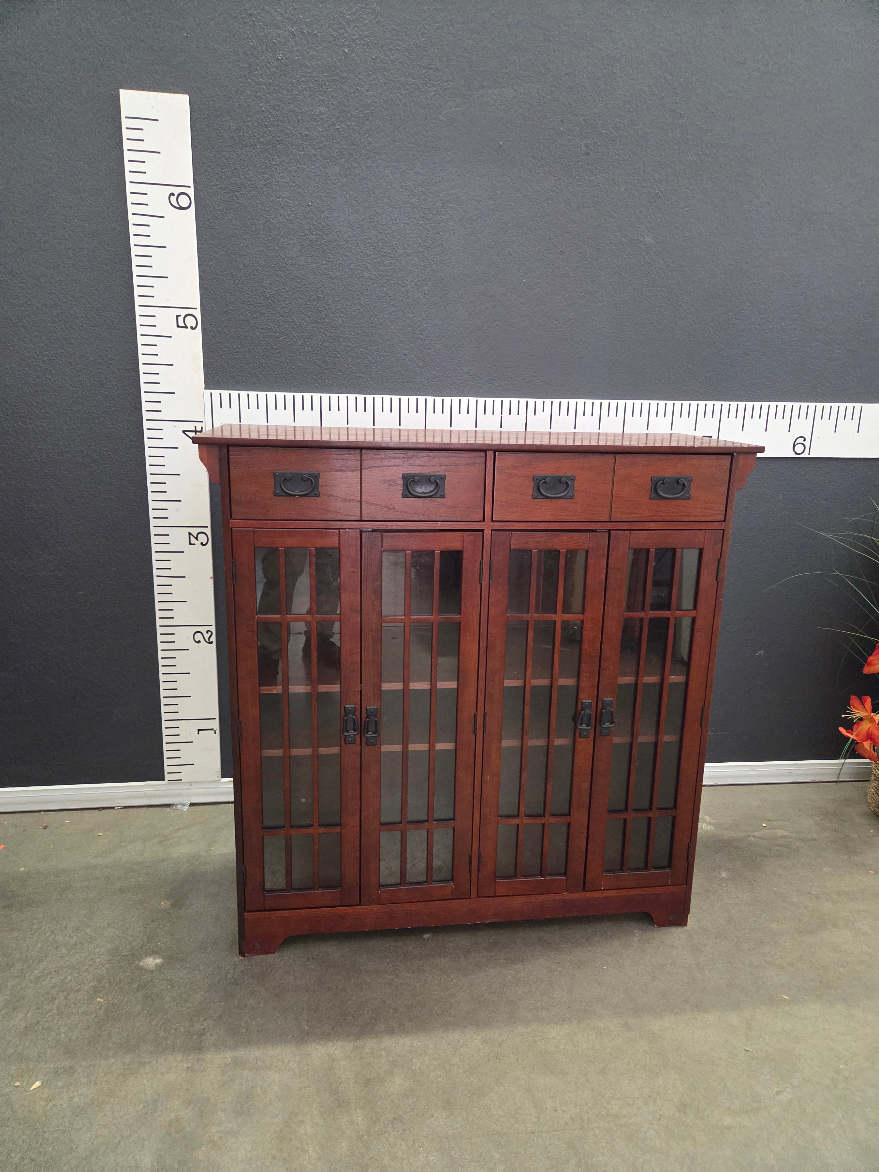This elegant cabinet features a rich brown finish with a classic wooden texture. The glass-front doors provide a showcase for your treasured items. Three top drawers add additional storage for smaller items. Approximate Size: 4.5 x 3 x 1