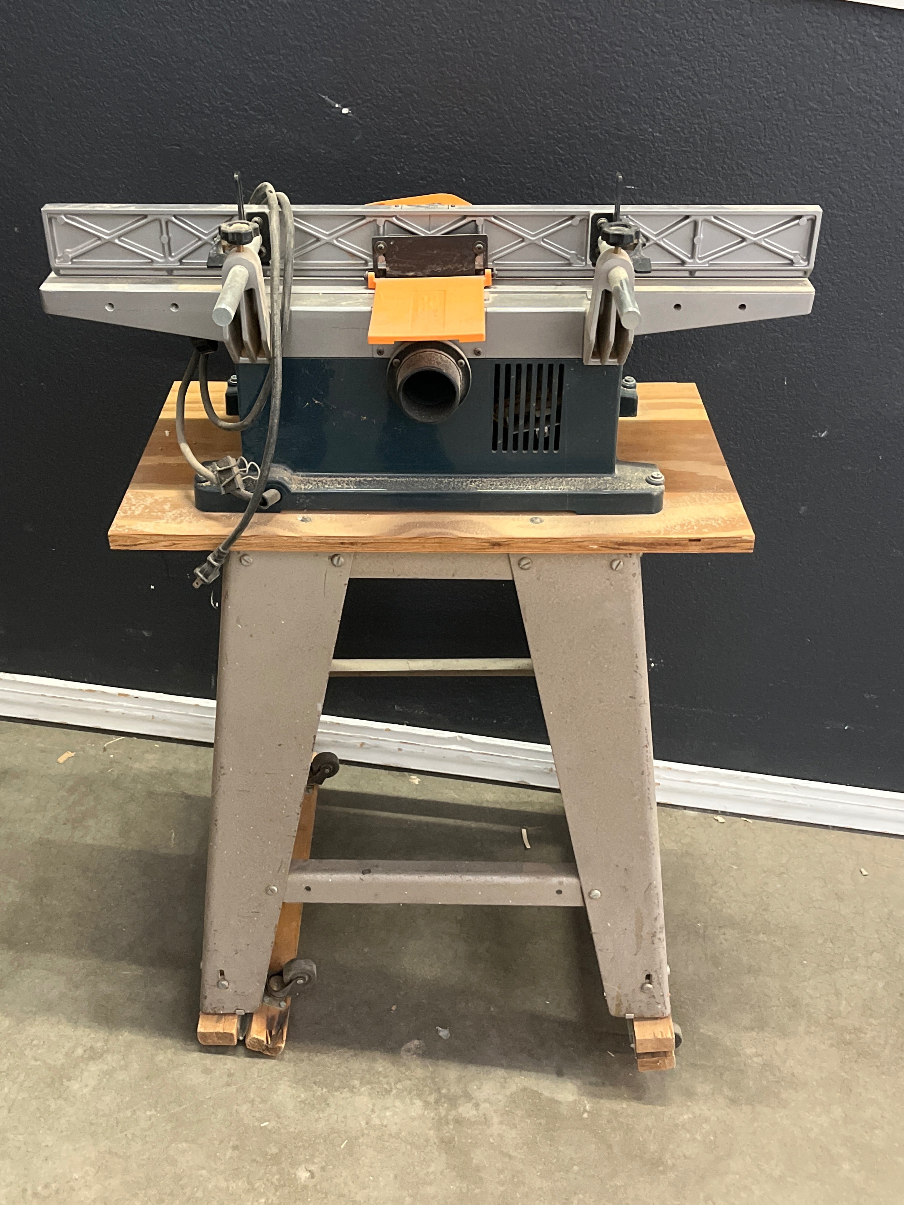 This vintage jointer planer features a sturdy metal construction with a combination of gray and black finishes. The unit includes a flat wooden platform and industrial-style steel legs. It is designed for precision woodworking and offers a classic, durable design. Approximate Size: 4 x 2 x 2