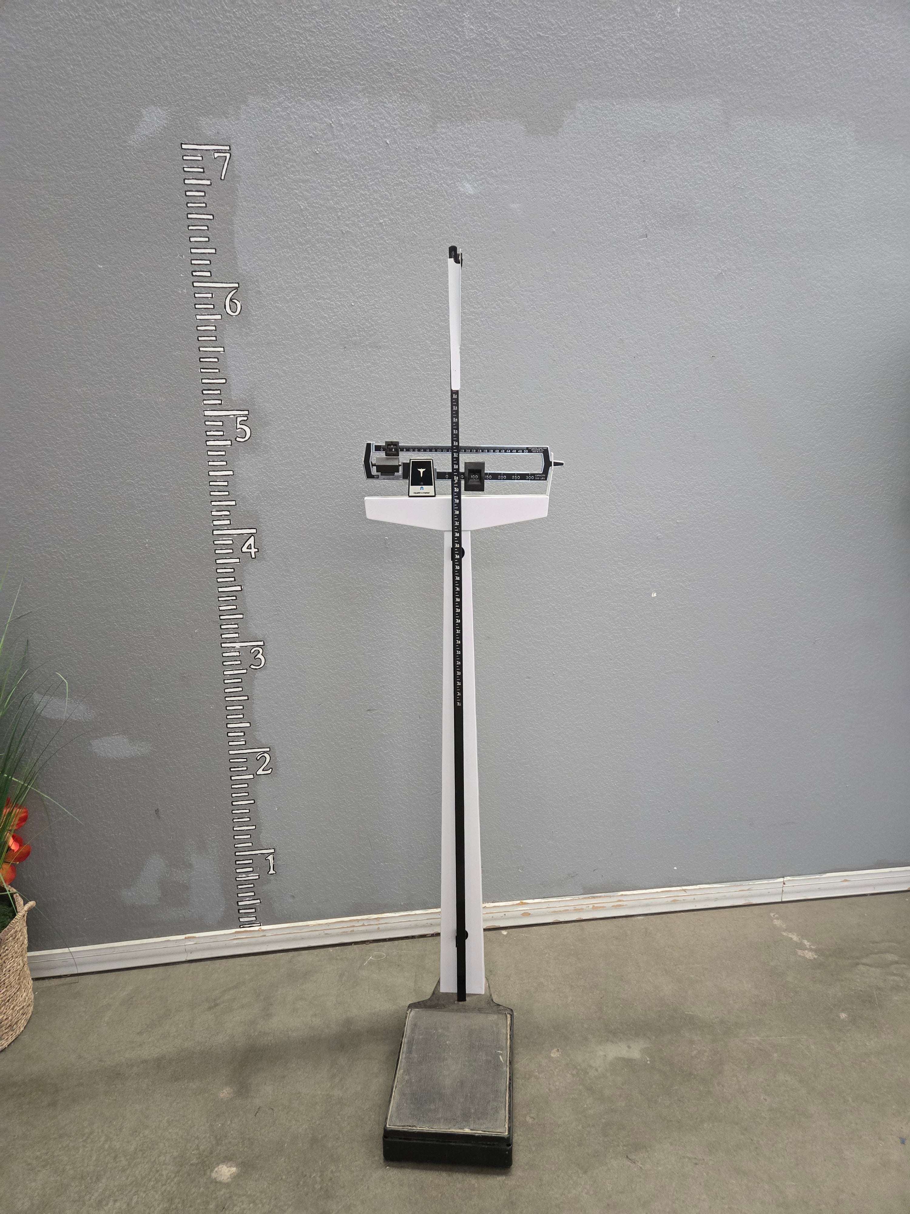 This classic mechanical physician scale features a sturdy base and white column with a sleek black beam design. Ideal for medical environments, this scale provides accurate weight measurements and includes a height rod for additional convenience. Approximate Size: 5.5 x 1 x 1.5