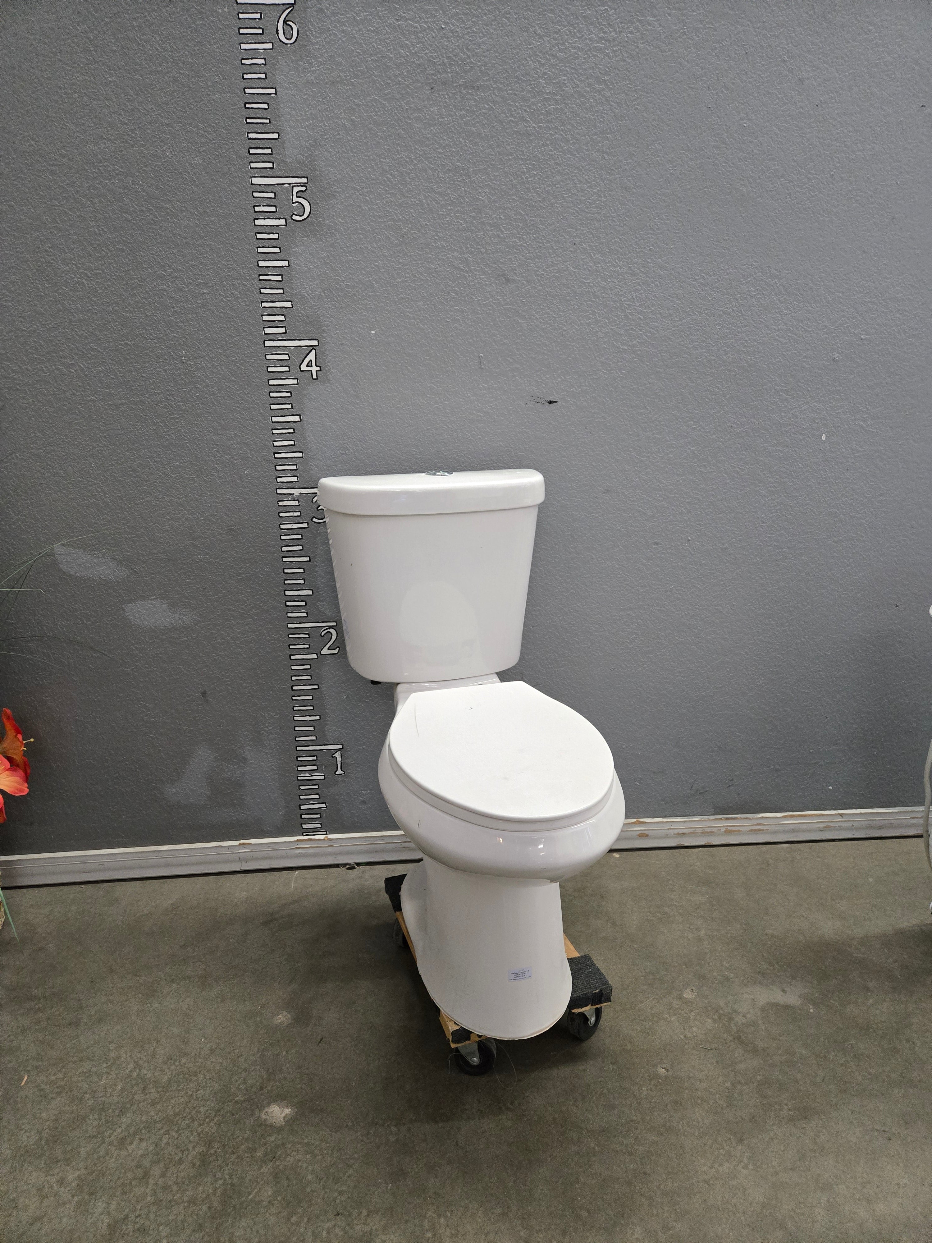 This classic two-piece toilet features a sleek white ceramic finish, offering both durability and style for any bathroom setting. Its polished surface ensures easy cleaning and maintenance. Approximate Size: 2.5 x 1.5 x 2.5