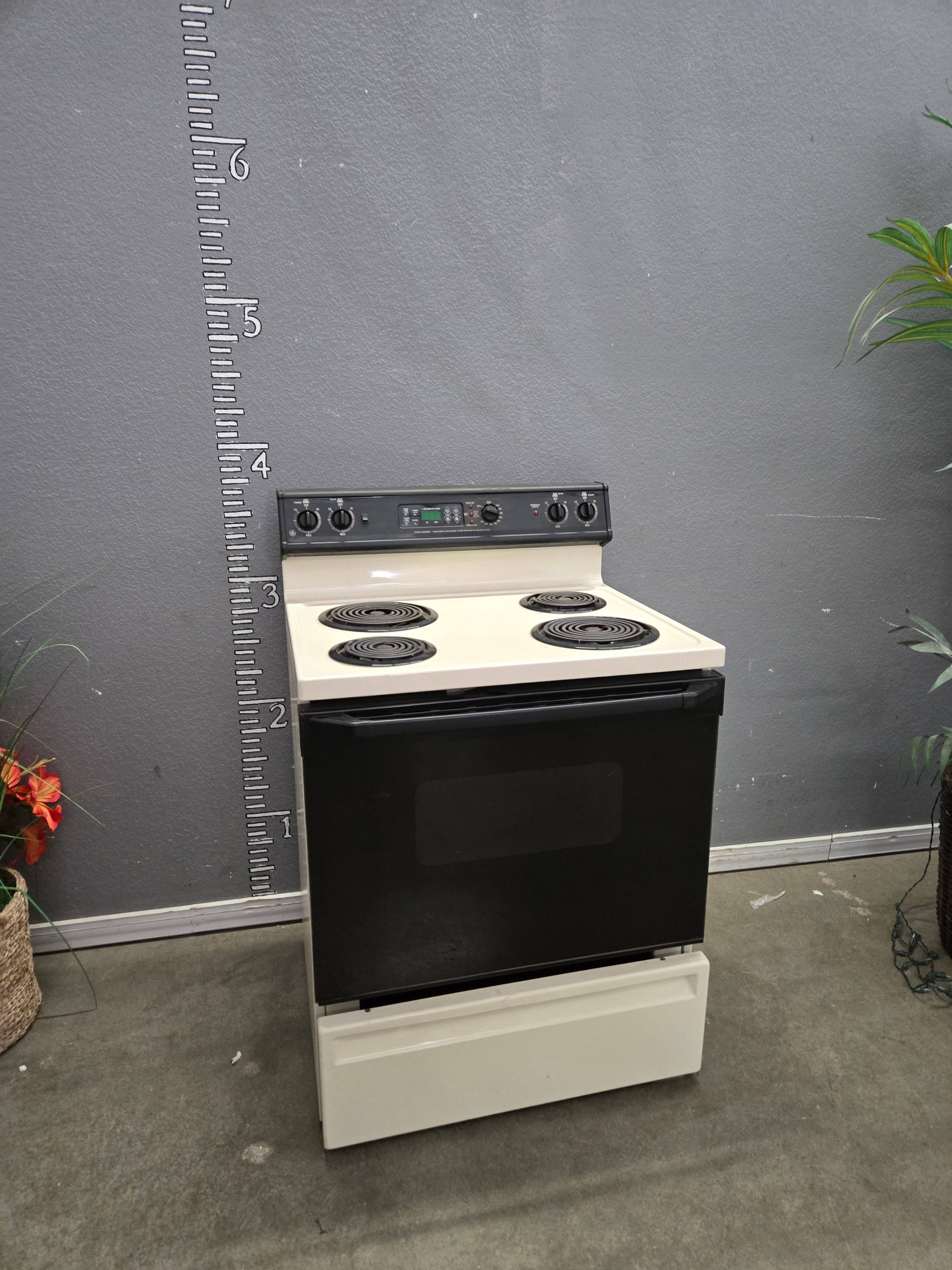 Classic cream-colored electric stove with a sleek black finish on the control panel and oven door. The coil burners add to its retro appeal. Approximate Size: 4 x 2.5 x 2.5