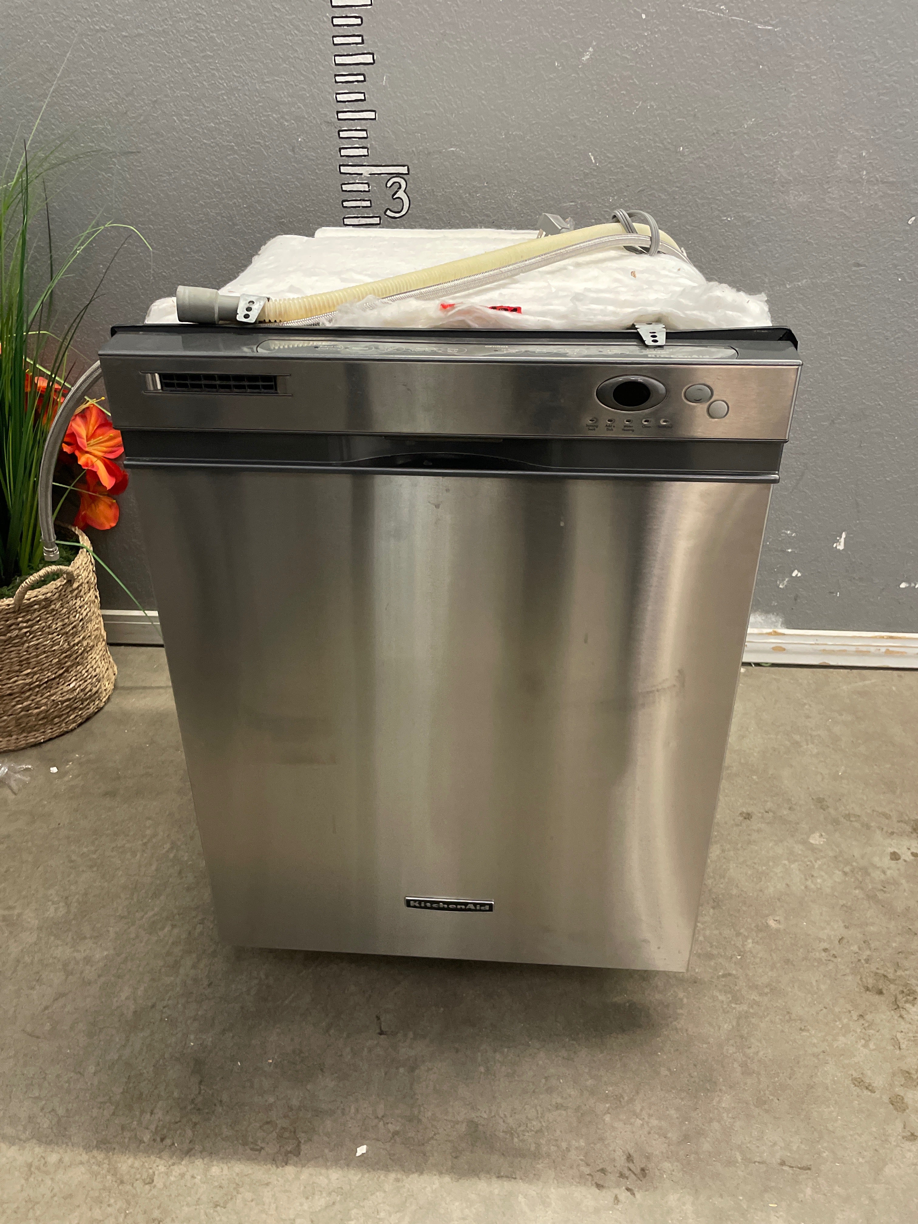 A sleek, stainless steel dishwasher with a brushed finish offering a modern aesthetic. Perfect for any contemporary kitchen. Approximate Size: 3 x 2 x 2