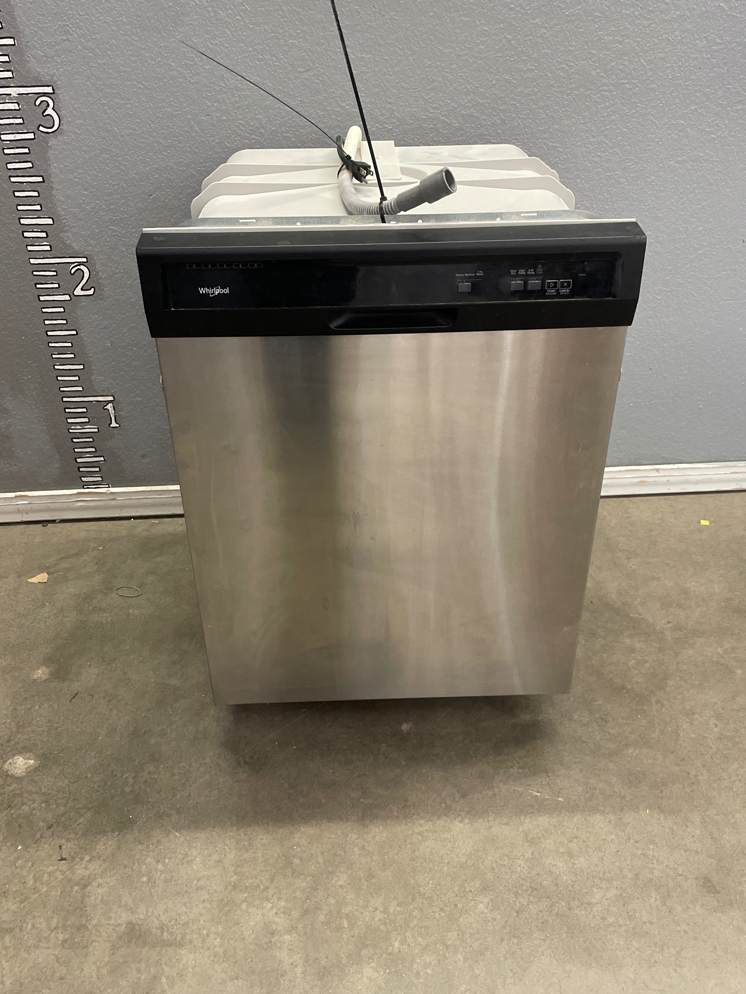 This sleek dishwasher features a modern stainless steel finish and a durable black control panel. It adds a touch of sophistication to any kitchen. Approximate Size: 3 x 2 x 2.5