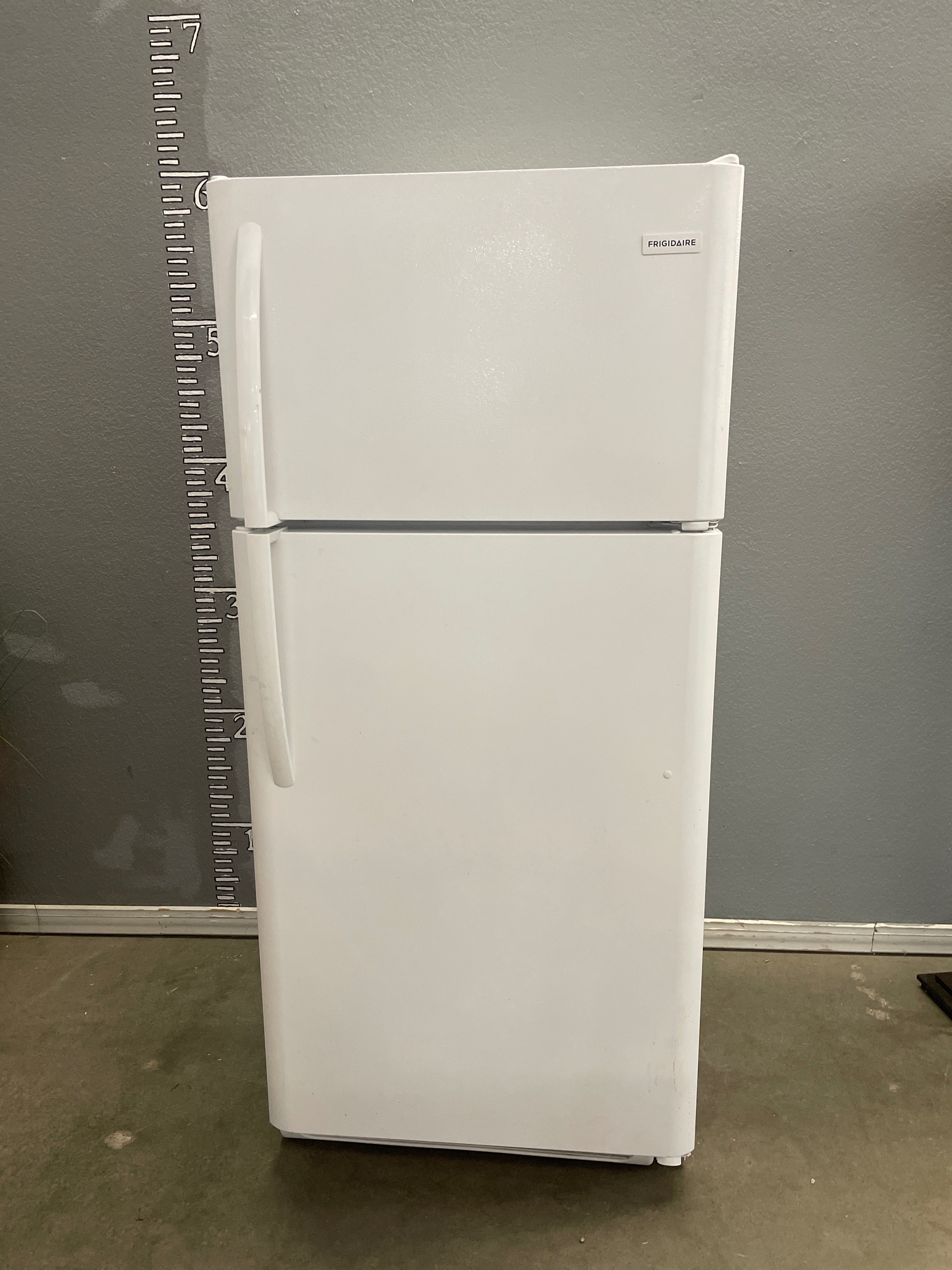 This white Frigidaire refrigerator features a smooth finish, perfect for a modern or classic kitchen. It offers ample storage with a top freezer compartment. Approximate Size: 5.5 x 2.5 x 2.5