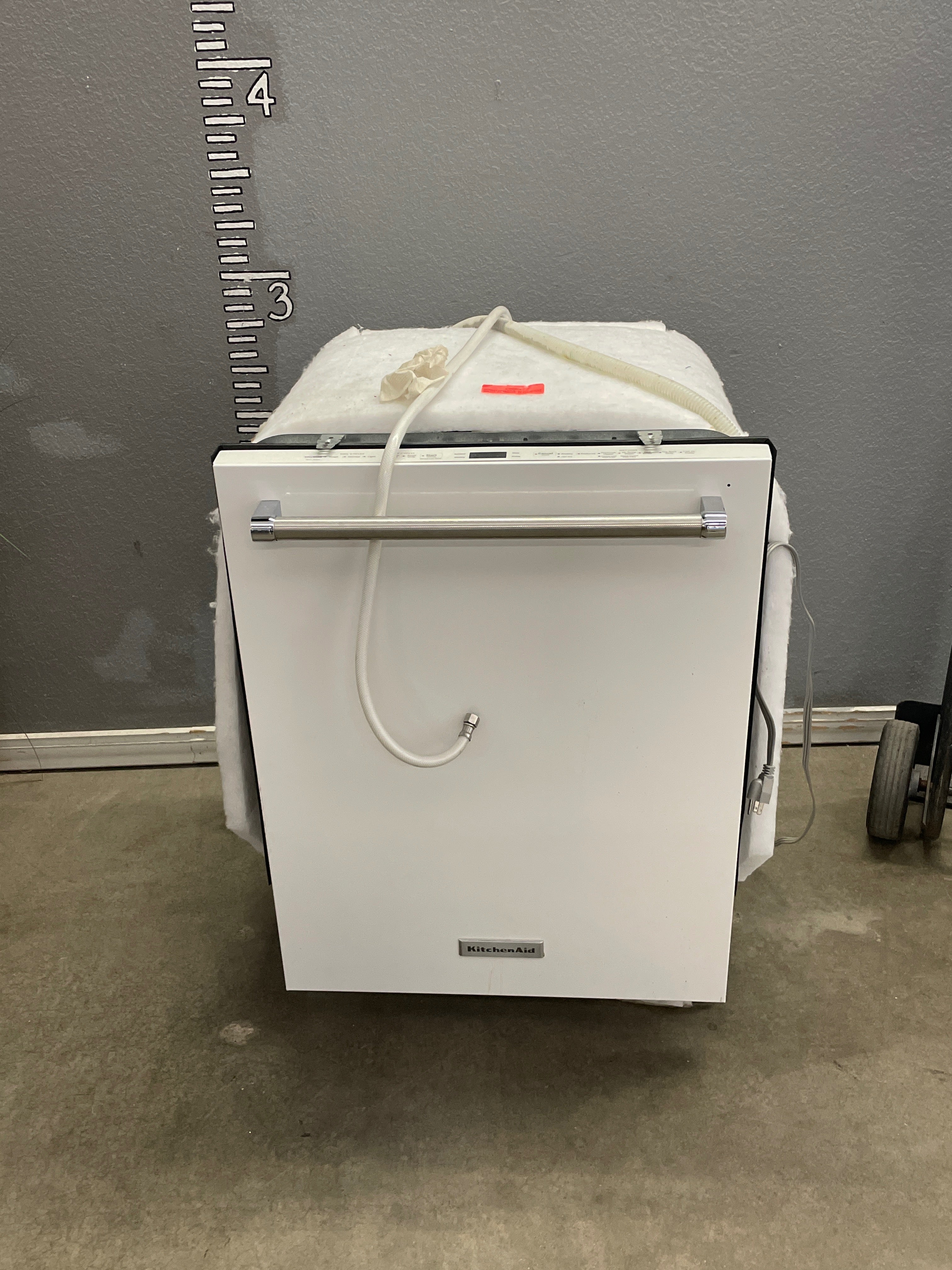 A sleek white KitchenAid built-in dishwasher with a stainless steel handle and a smooth finish. Perfect for any modern kitchen. Approximate Size: 3.5 x 2 x 2