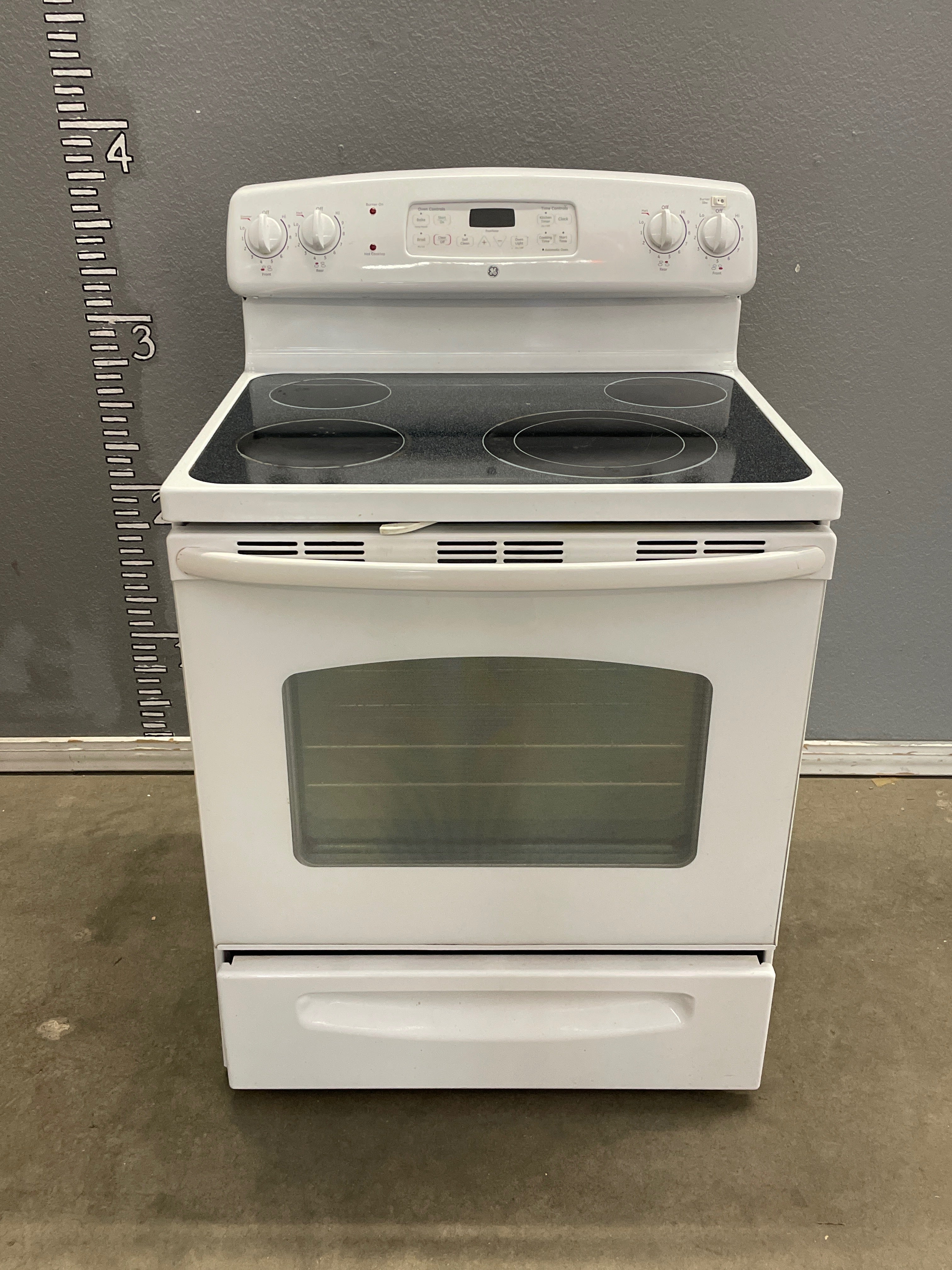 This electric range features a sleek white finish with a glass cooktop and digital controls. It includes four burners and an oven with a glass door. Ideal for a modern kitchen setting. Approximate Size: 4 x 2.5 x 2.5
