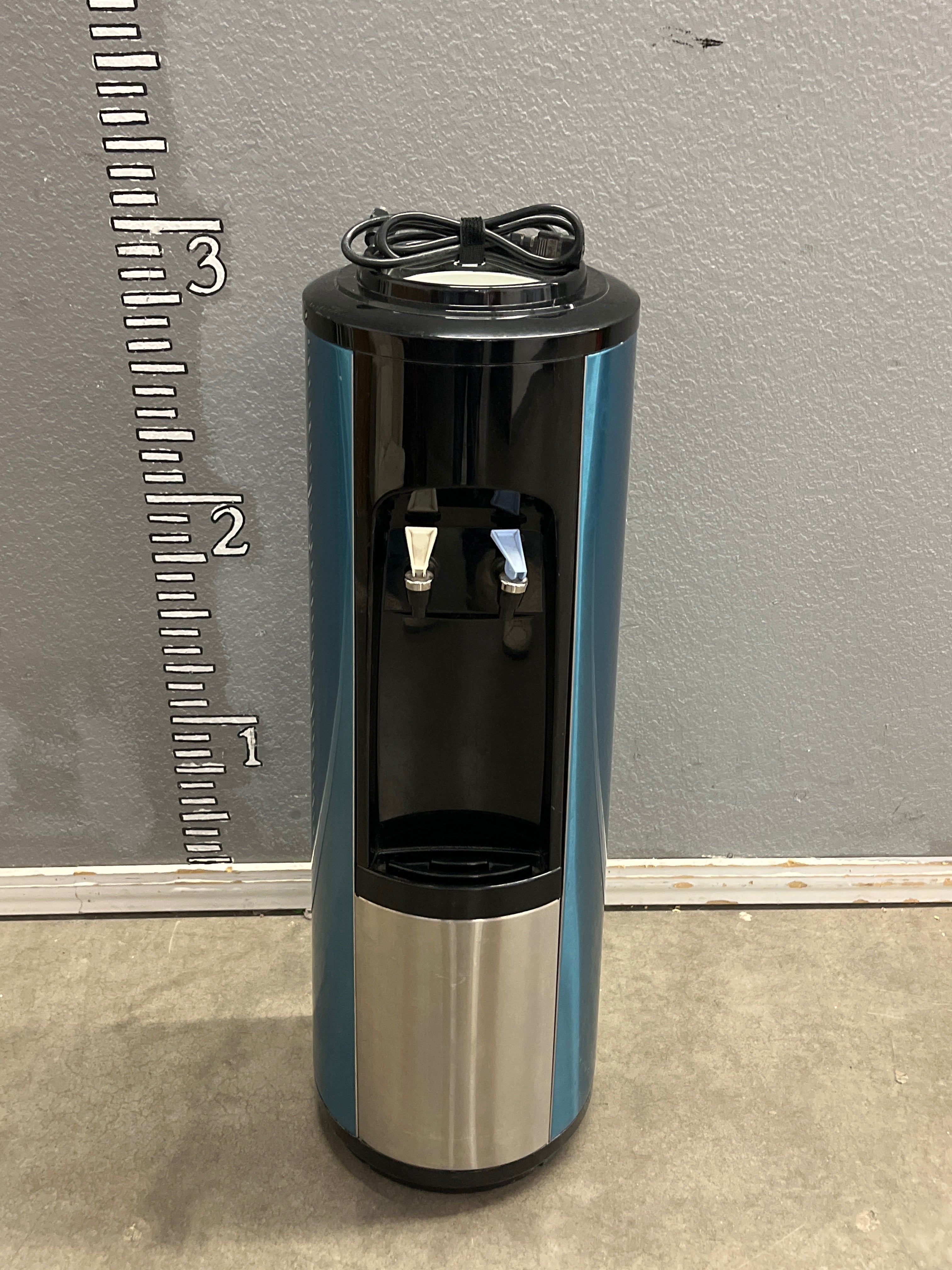 Sleek and modern water dispenser with a stainless steel and black finish, featuring dual faucets for hot and cold water. Approximate Size: 3.5 x 1 x 1