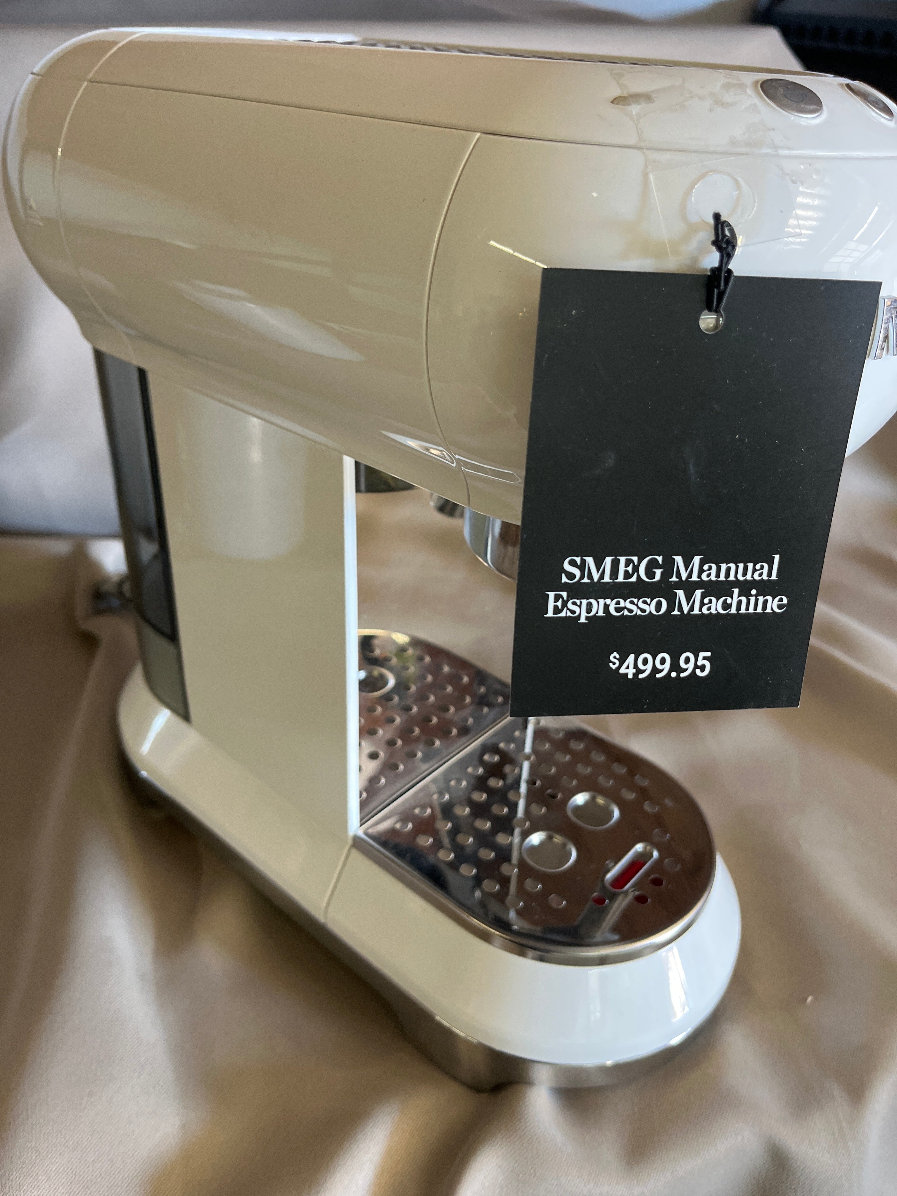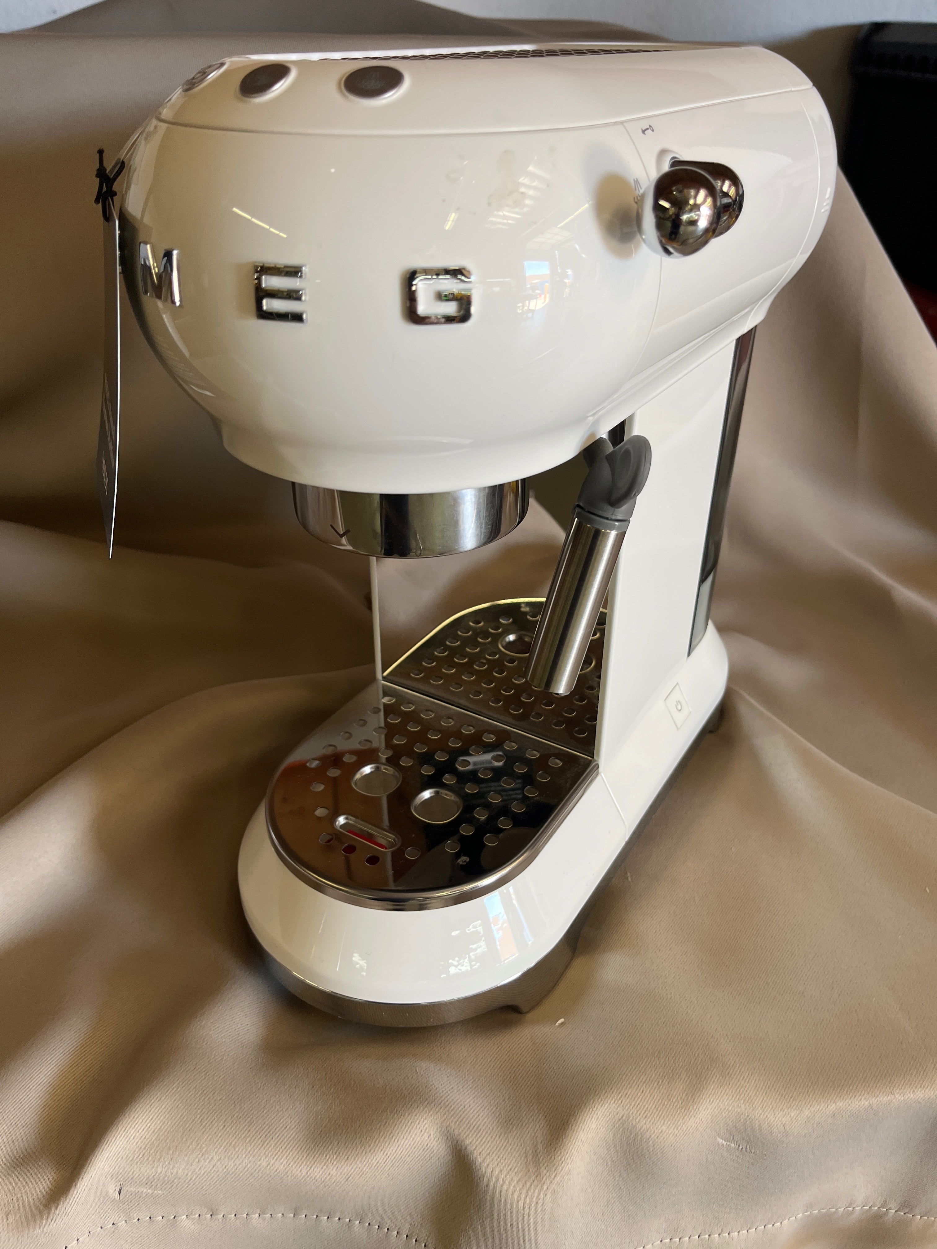 This sleek espresso machine features a glossy white finish with chrome accents. Ideal for a modern kitchen setting, its compact design is both stylish and functional. Approximate Size: 1.2 x 0.6 x 0.6
