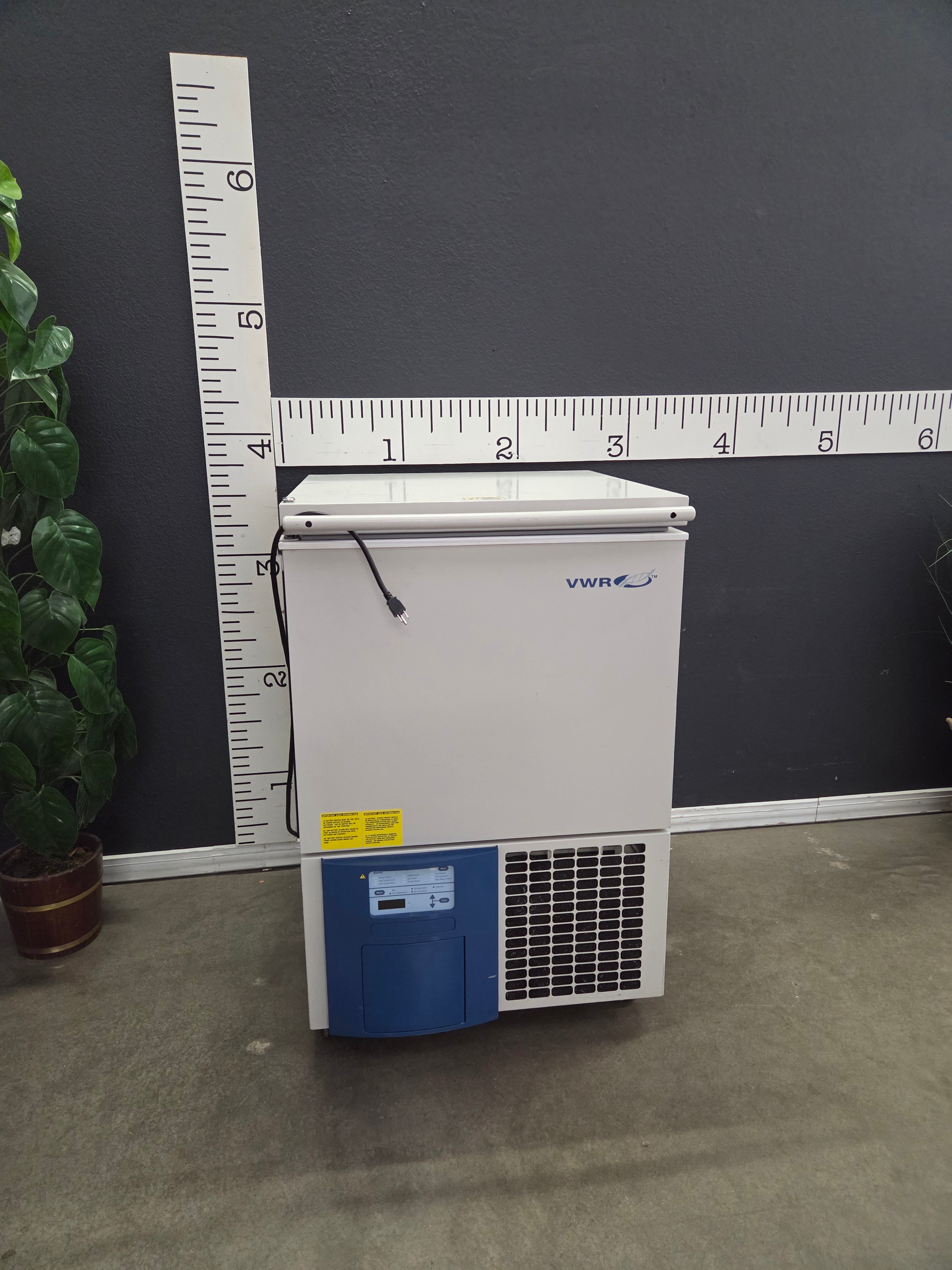 The VWR Scientific Ultra-Low Temperature Freezer offers a robust solution for laboratory cooling needs. Finished in a sleek white with a blue accent, this appliance features a durable metal construction ideal for maintaining precise temperature control. Approximate Size: 4 x 3 x 2