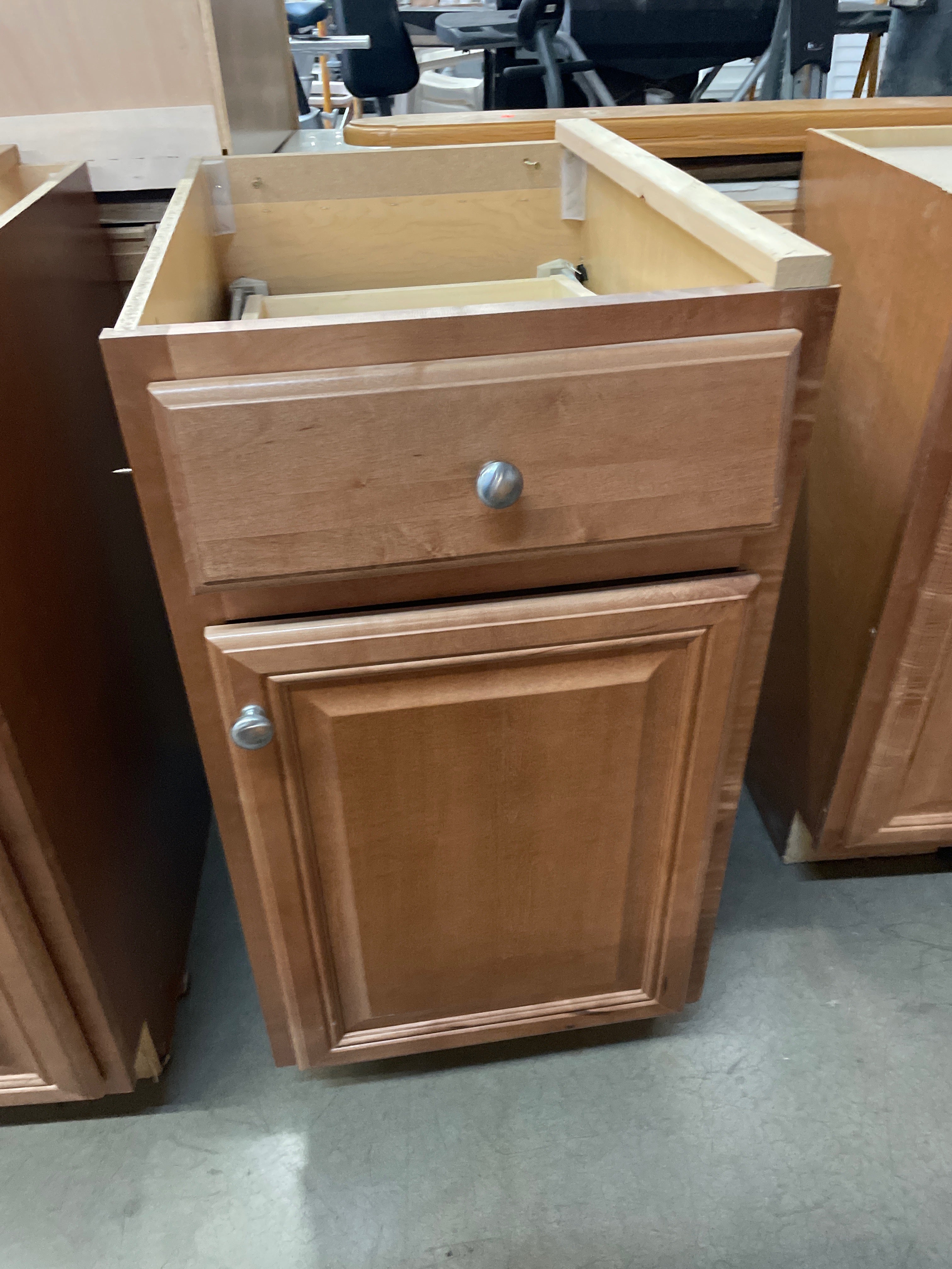 This sturdy wooden kitchen base cabinet features a warm brown finish with a smooth satin look. It includes a single drawer and a lower cabinet door, offering ample storage space for your kitchen essentials. Approximate Size: 3 x 2 x 2