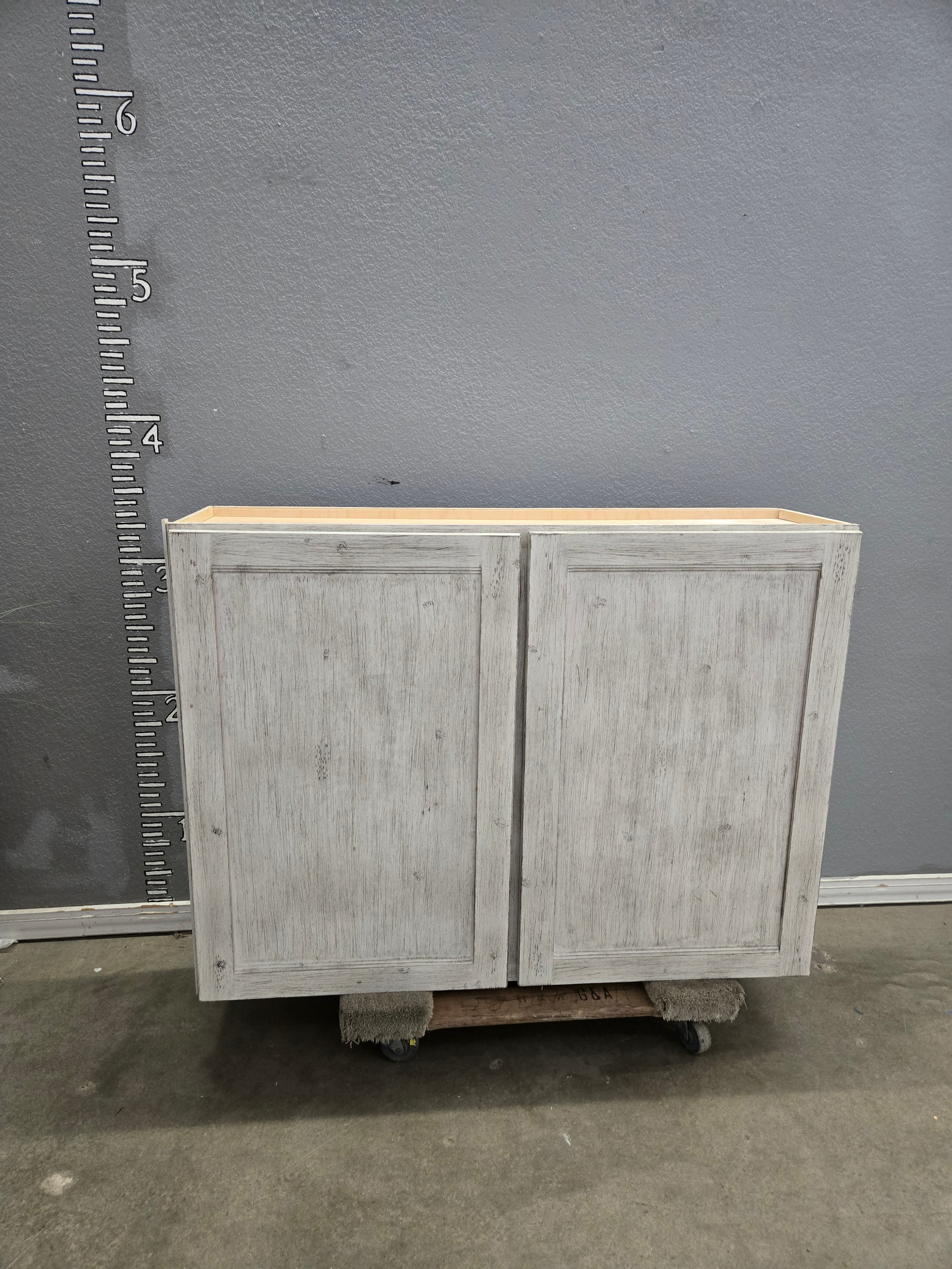 This charming two-door cabinet features a rustic white finish that enhances its vintage appeal. The cabinet is crafted from sturdy wood, providing both decor and functionality. Approximate Size: 3 x 3 x 1.5