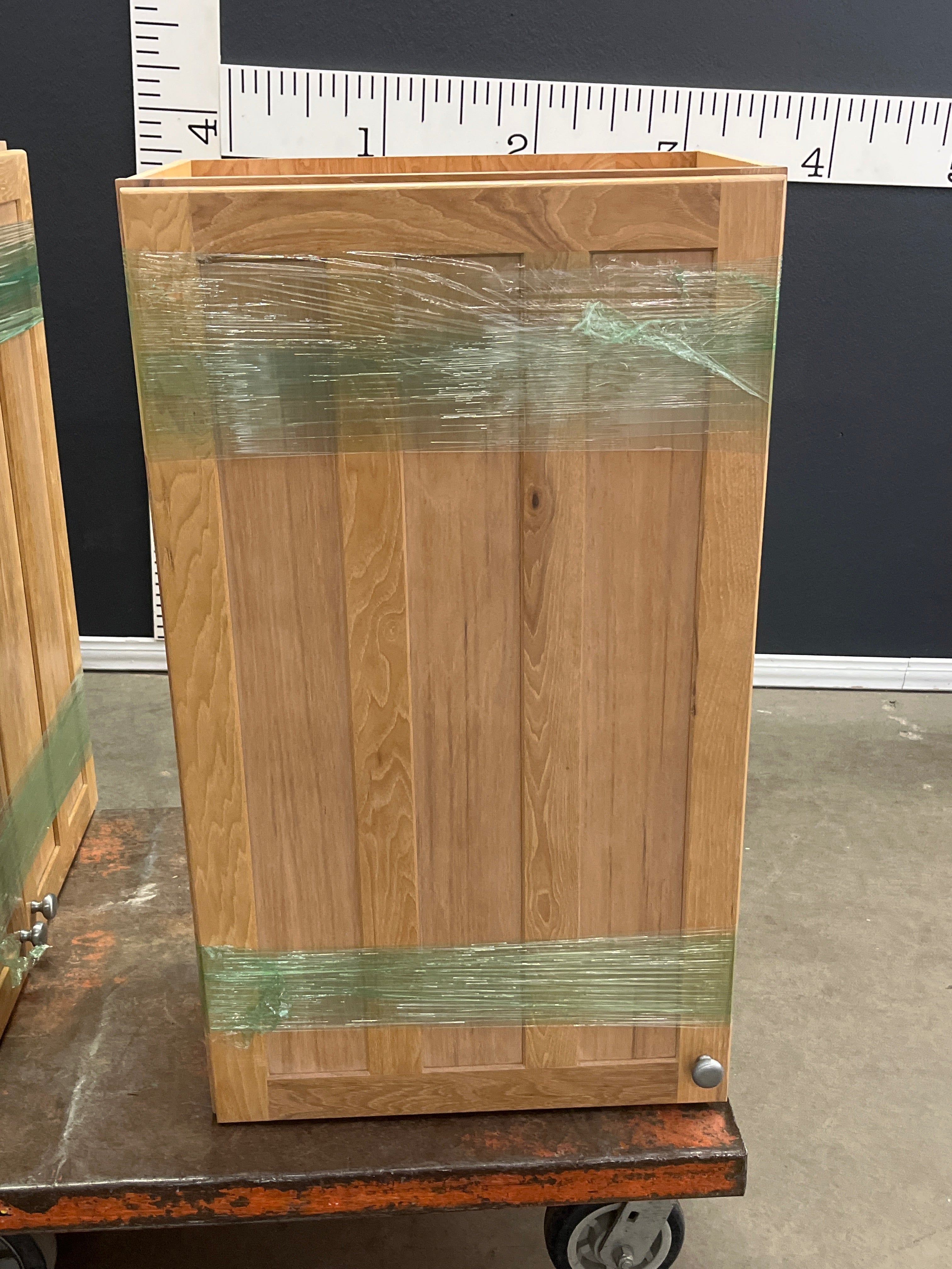 This kitchen cabinet features a light, natural wood finish that enhances its classic paneled design. Ideal for adding stylish storage to your kitchen. Approximate Size: 3 x 2 x 1.5
