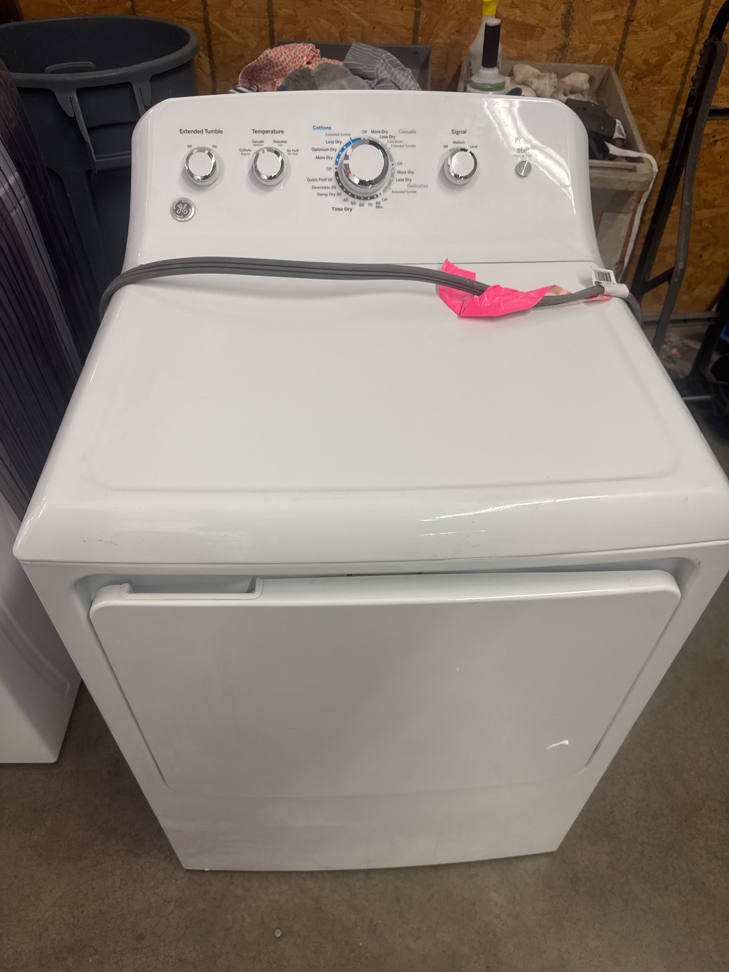 This white GE electric dryer features a smooth, glossy finish. It offers multiple drying settings for different fabric types. Approximate Size: 3 x 2.5 x 2.5
