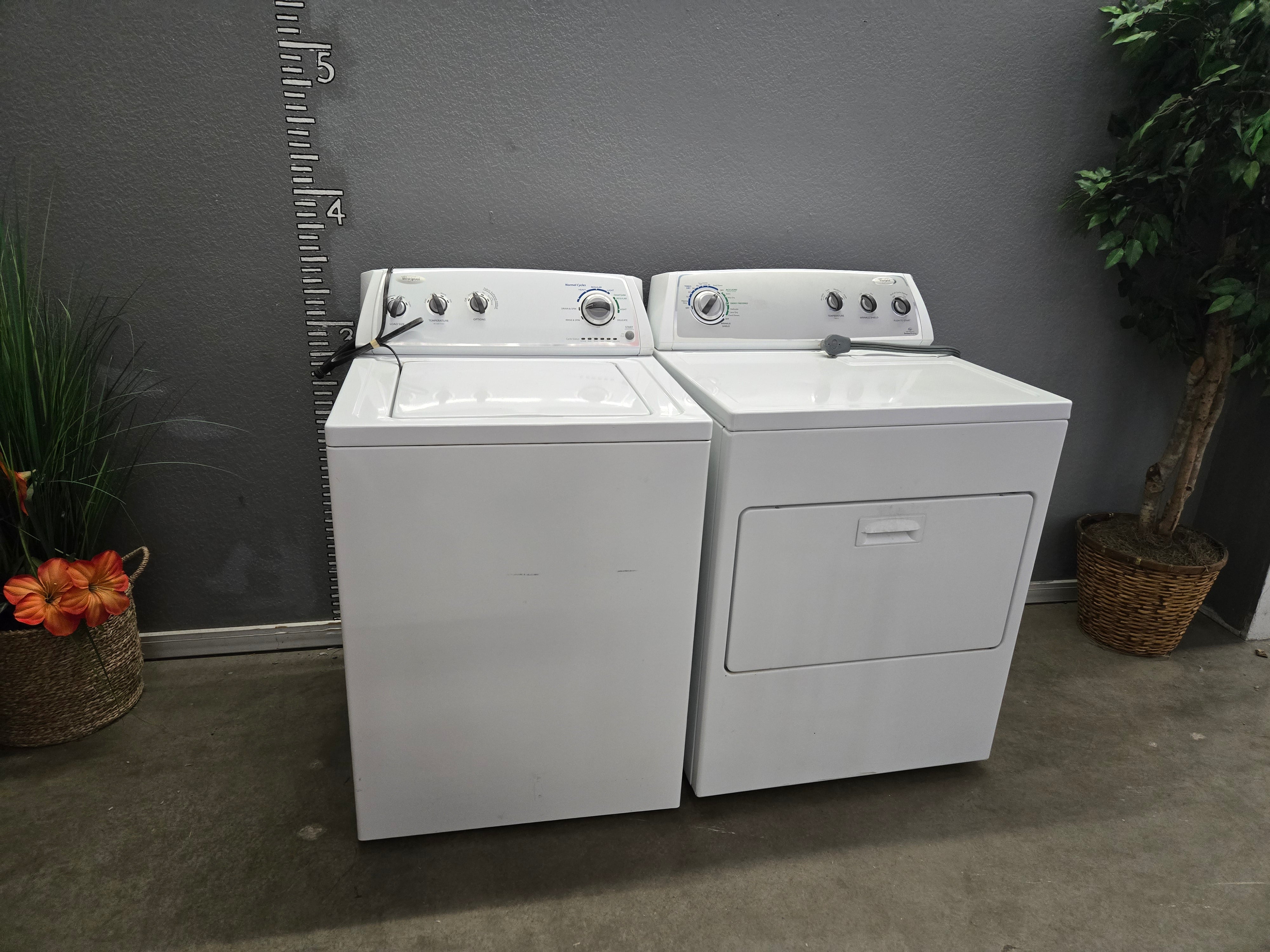 This classic white washer and dryer set features a clean, smooth finish, perfect for any laundry room setup. The straightforward design ensures ease of use and reliability. Approximate Size: 3 x 5 x 2.5